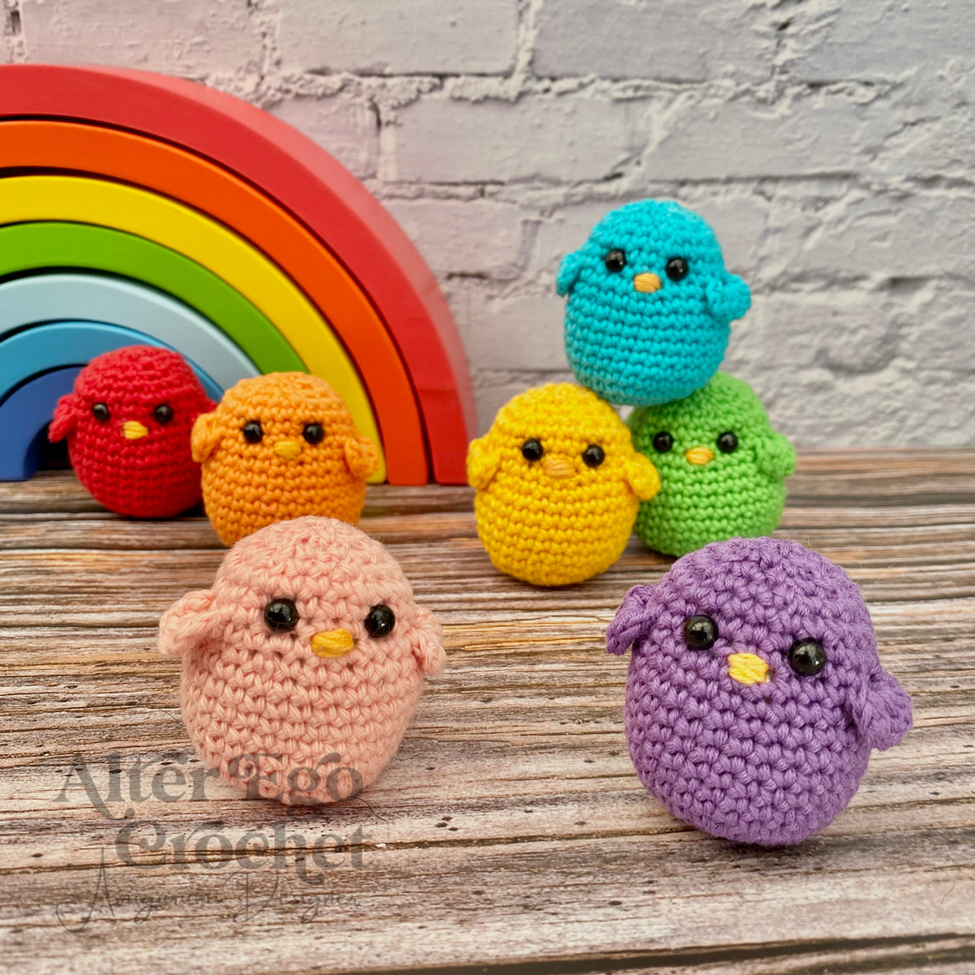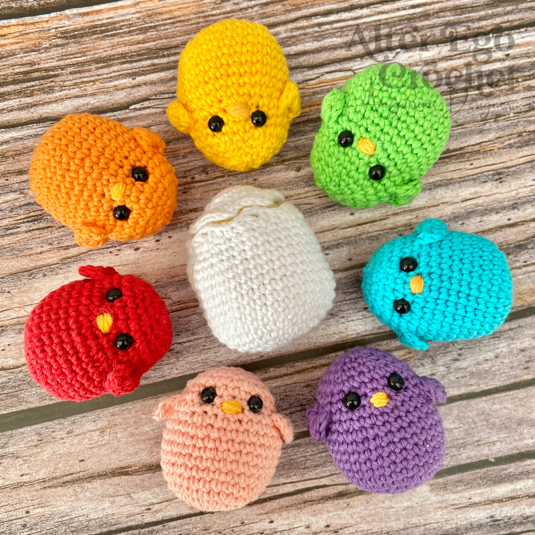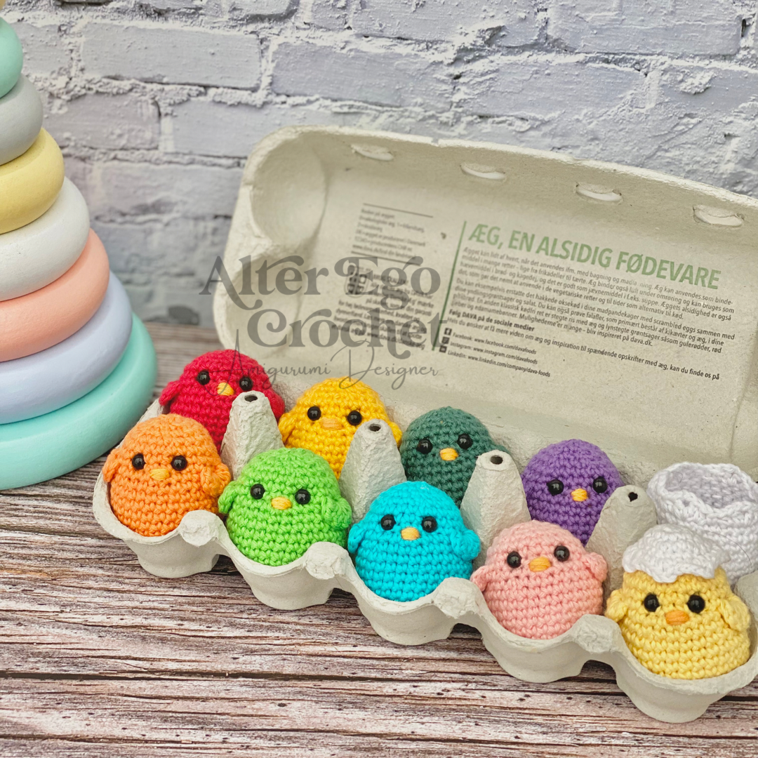 Kyllingerne bliver 5,5 cm. hvis du bruger samme garn og hæklenål som mig. Du kan sagtens bruge en anden nål og andet garn, hvis de skal være større eller mindre.