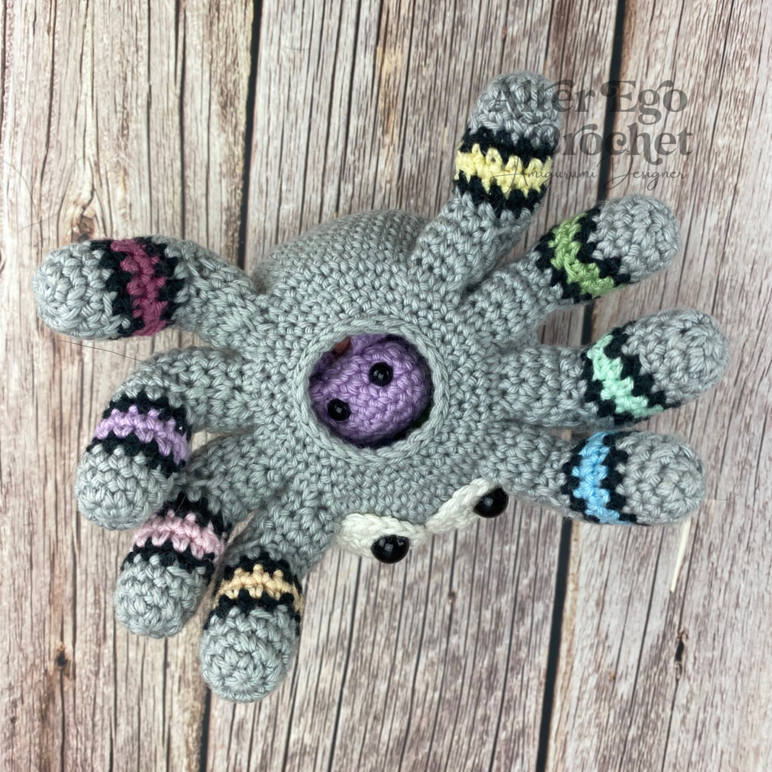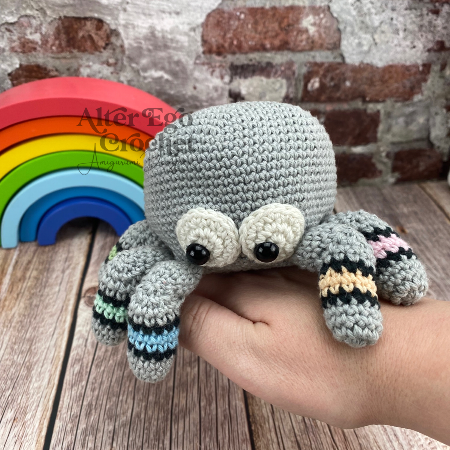 Den er lavet næsten uden syning (det er kun øjnene på den store edderkop, der skal sys på, men dette kan undgås ved at bruge større sikkerhedsøjne i stedet).