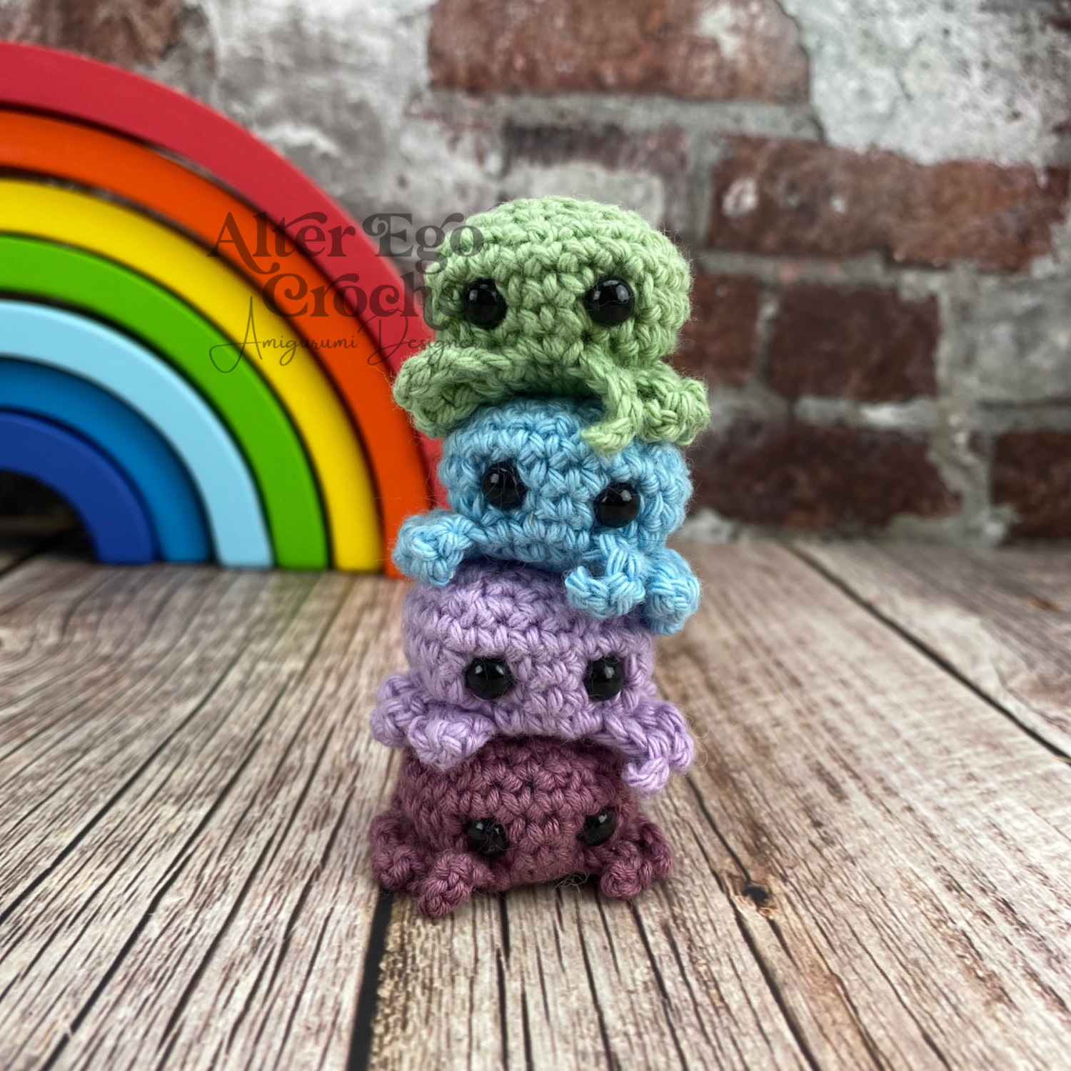 - Garn - jeg har brugt 8/4 bomuld (3 g i 8 forskellige farver til mini edderkopperne, 35 g grå til den store edderkop, 2 g hvid og 3 g sort)