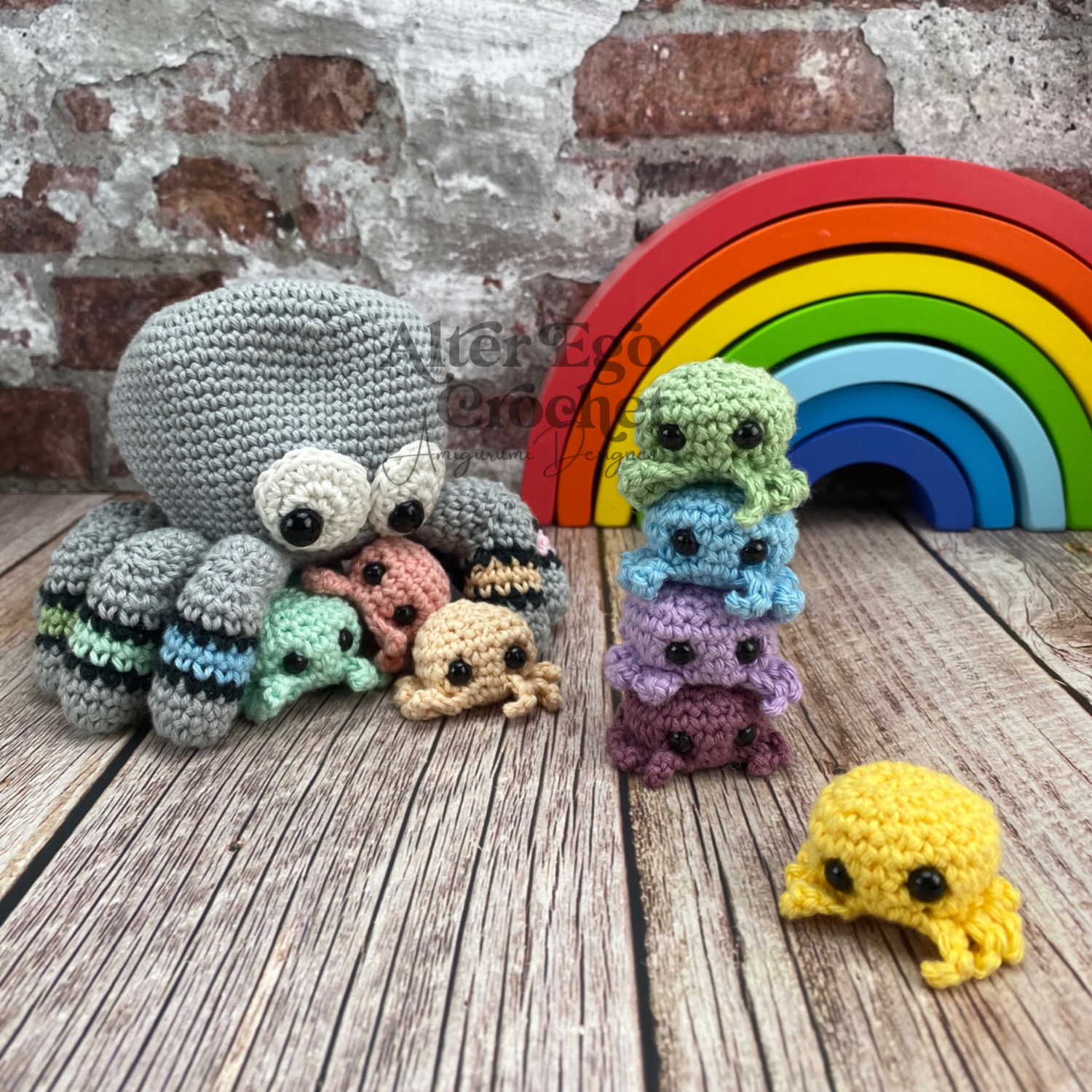 Den store edderkop bliver 10 x 7 cm. og de små 3 cm. hvis du bruger samme garn og hæklenål som mig. Du kan sagtens bruge en anden nål og garn, hvis de skal være større / mindre.