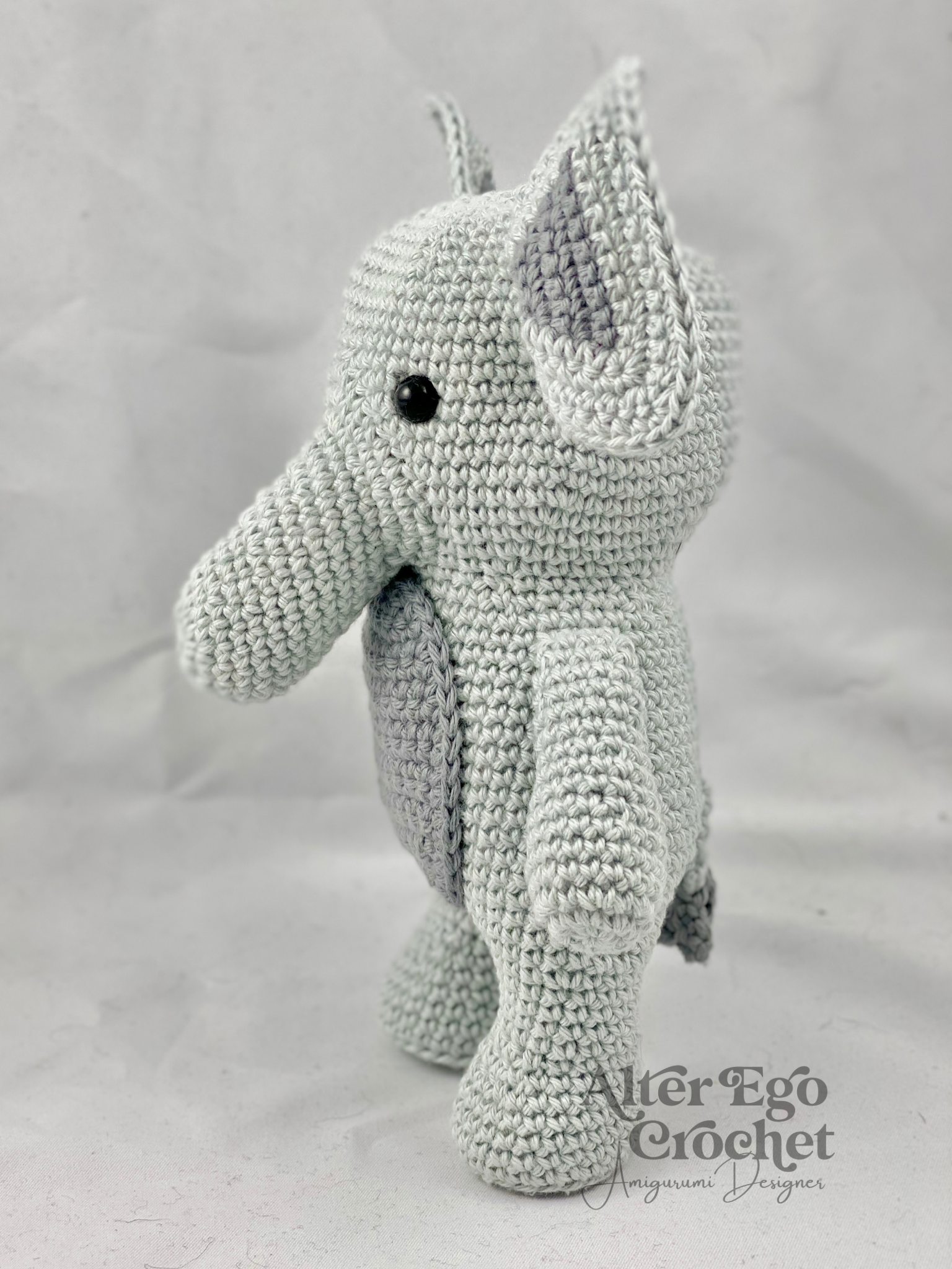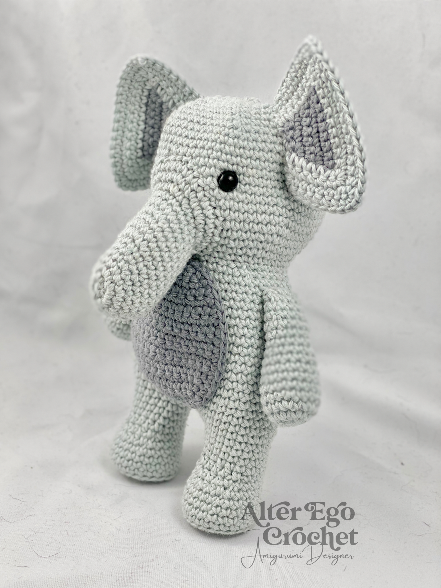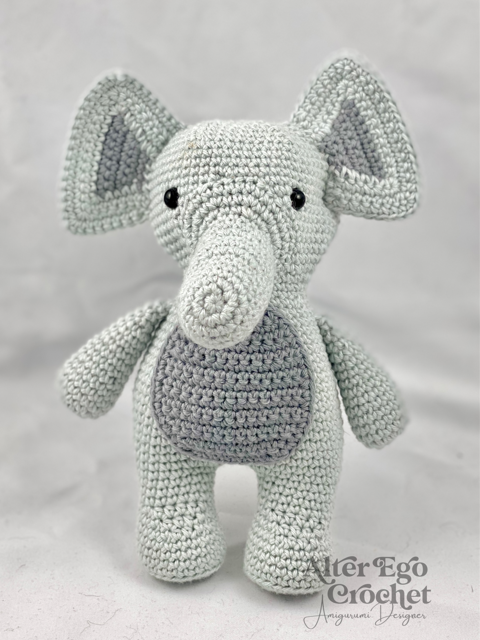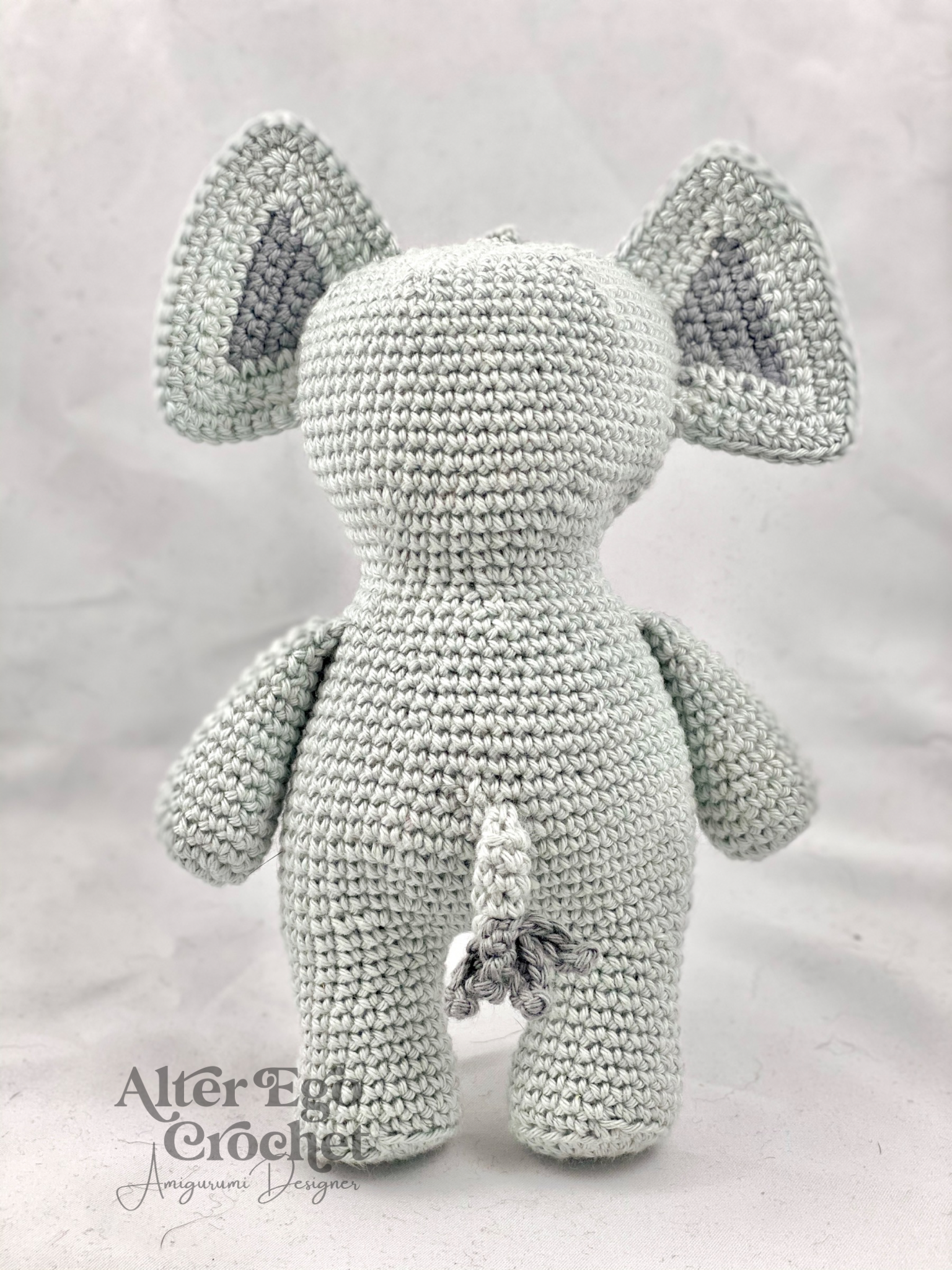 Elliot bliver 17 cm. hvis du bruger samme garn og hæklenål som mig. Du kan sagtens bruge en anden nål og andet garn, hvis han skal være større eller mindre.