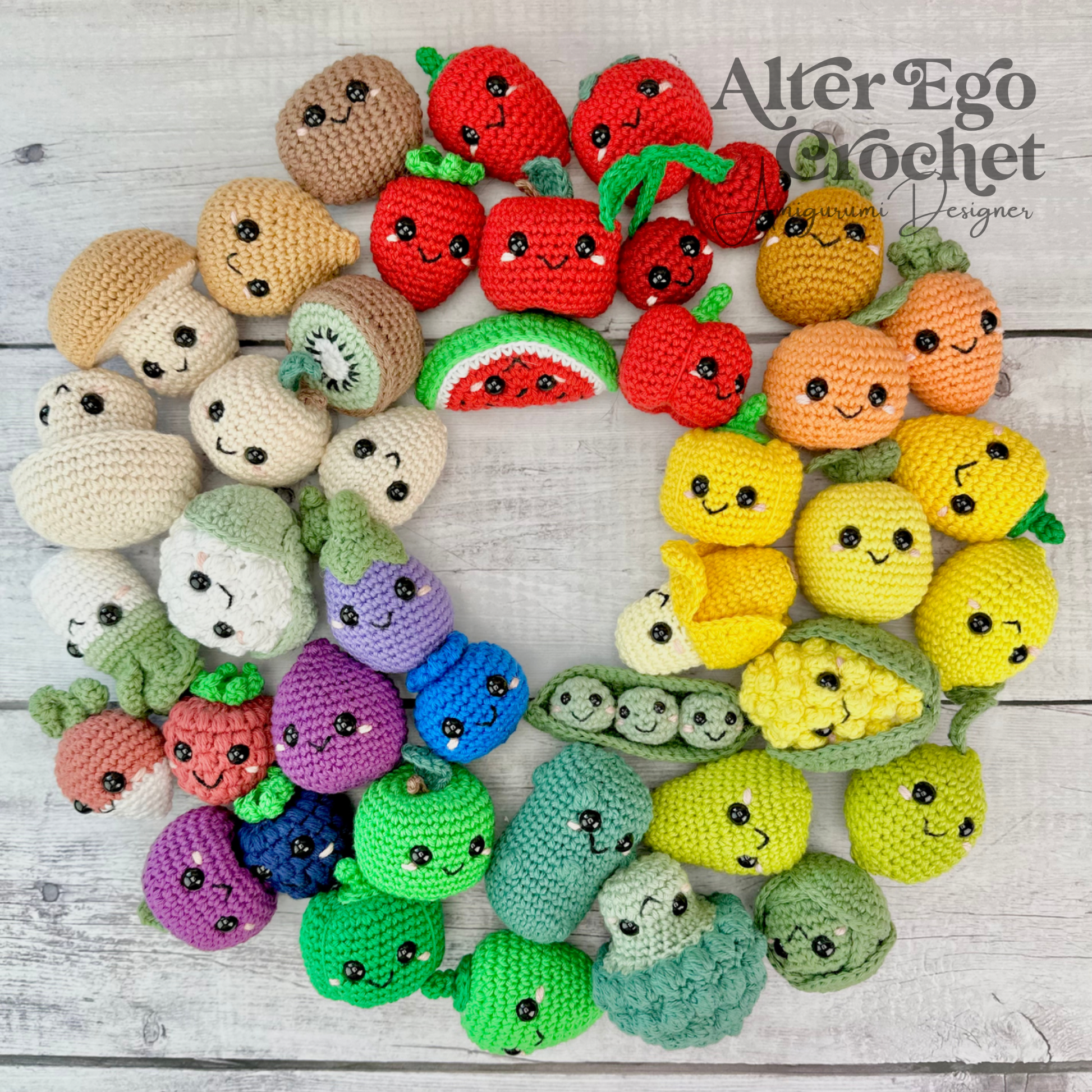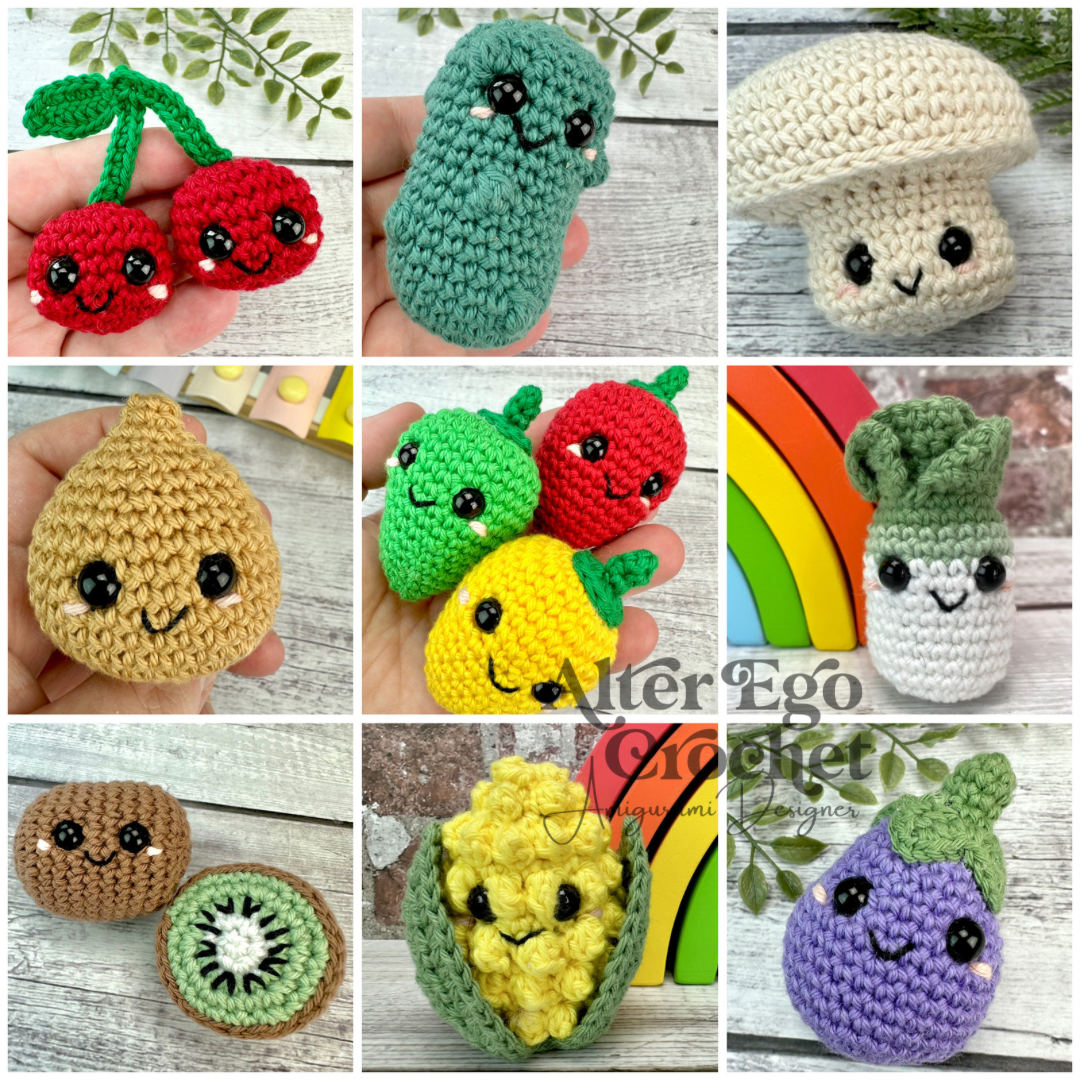 Alle frugter og grøntsager bliver 5-9 cm, hvis du bruger samme garn og hæklenål som mig. Du kan sagtens bruge en anden nål og andet garn, hvis de skal være større eller mindre.