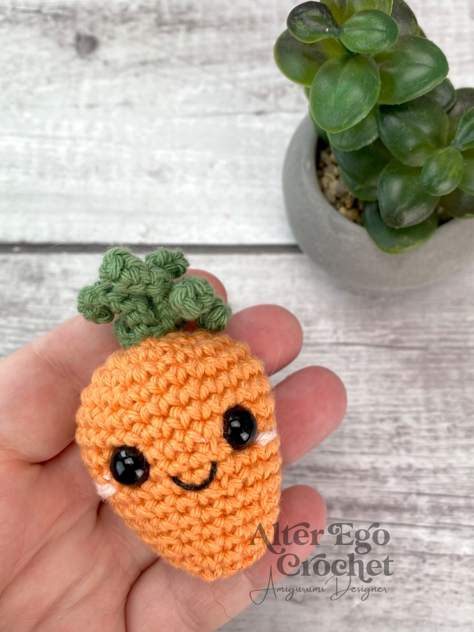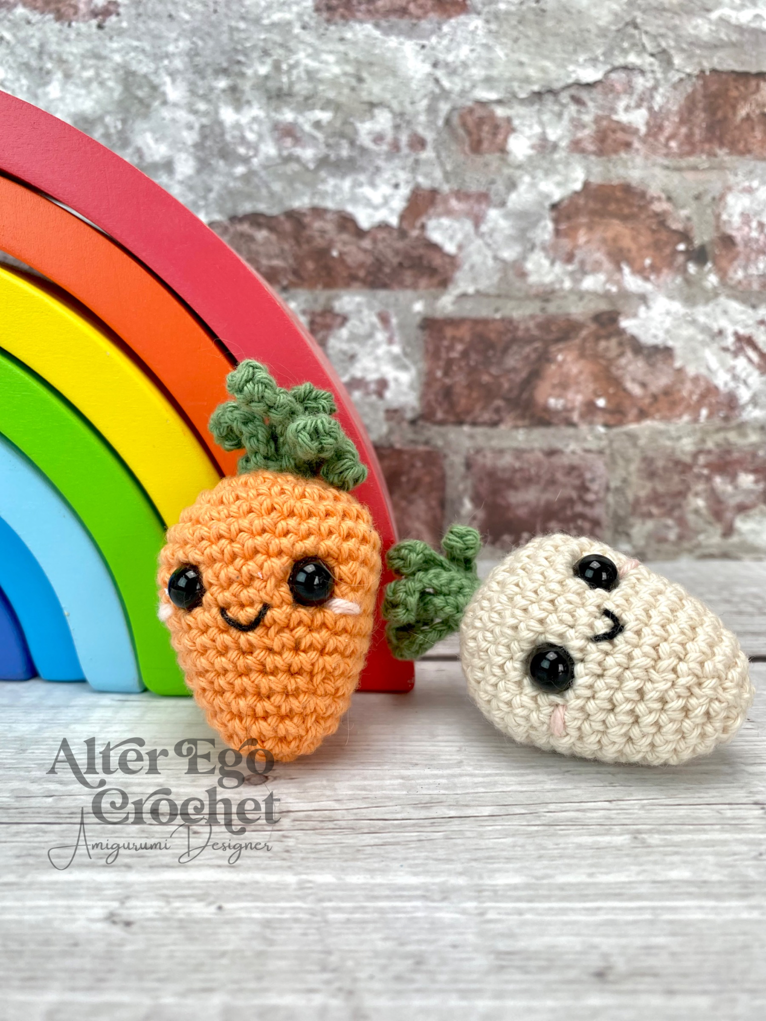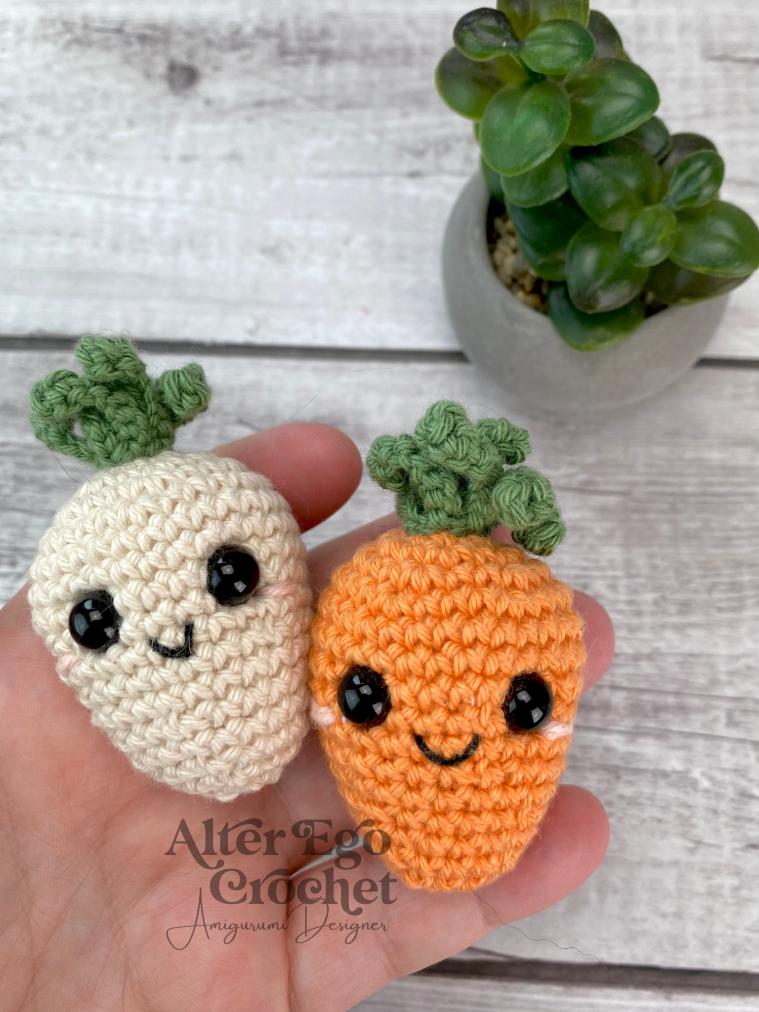 Gulerod/pastinak bliver 6,5 cm og potte 4 cm hvis du bruger samme garn og hæklenål som mig. Du kan sagtens bruge en anden nål og andet garn, hvis han skal være større eller mindre.