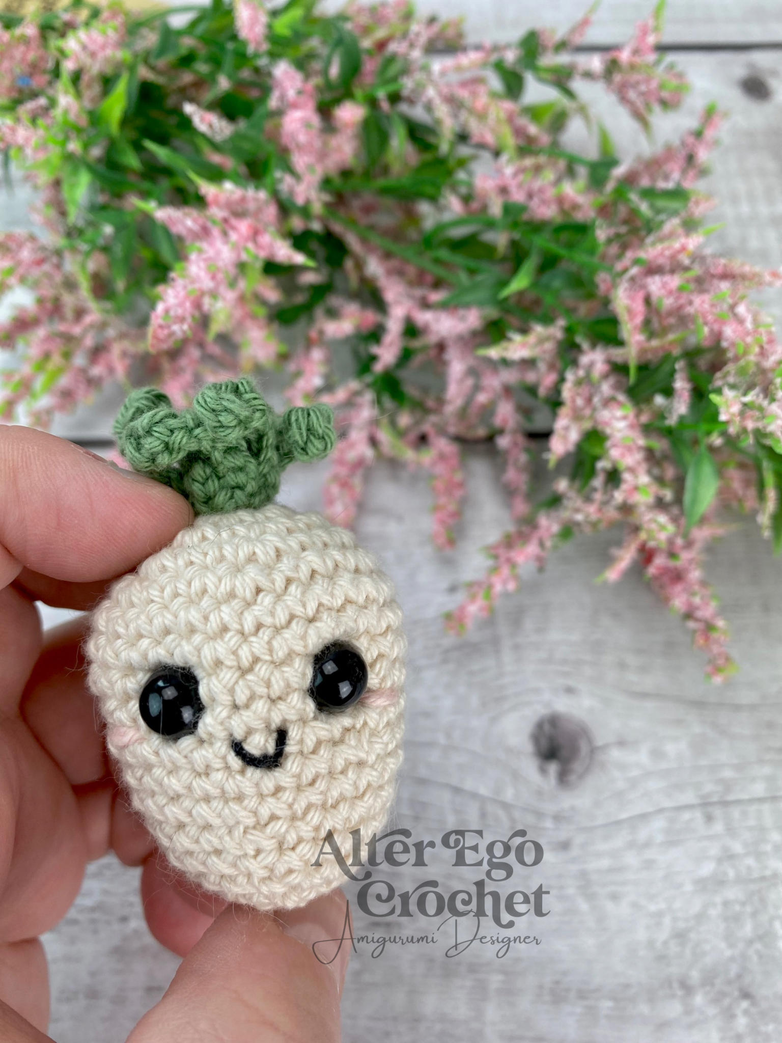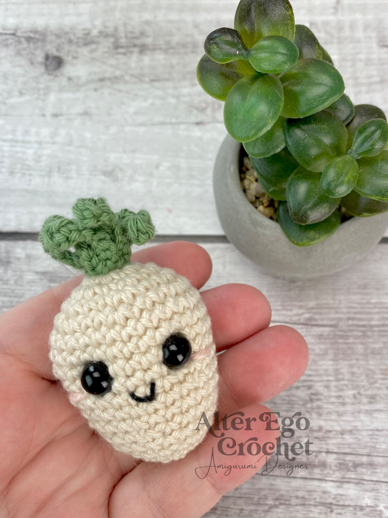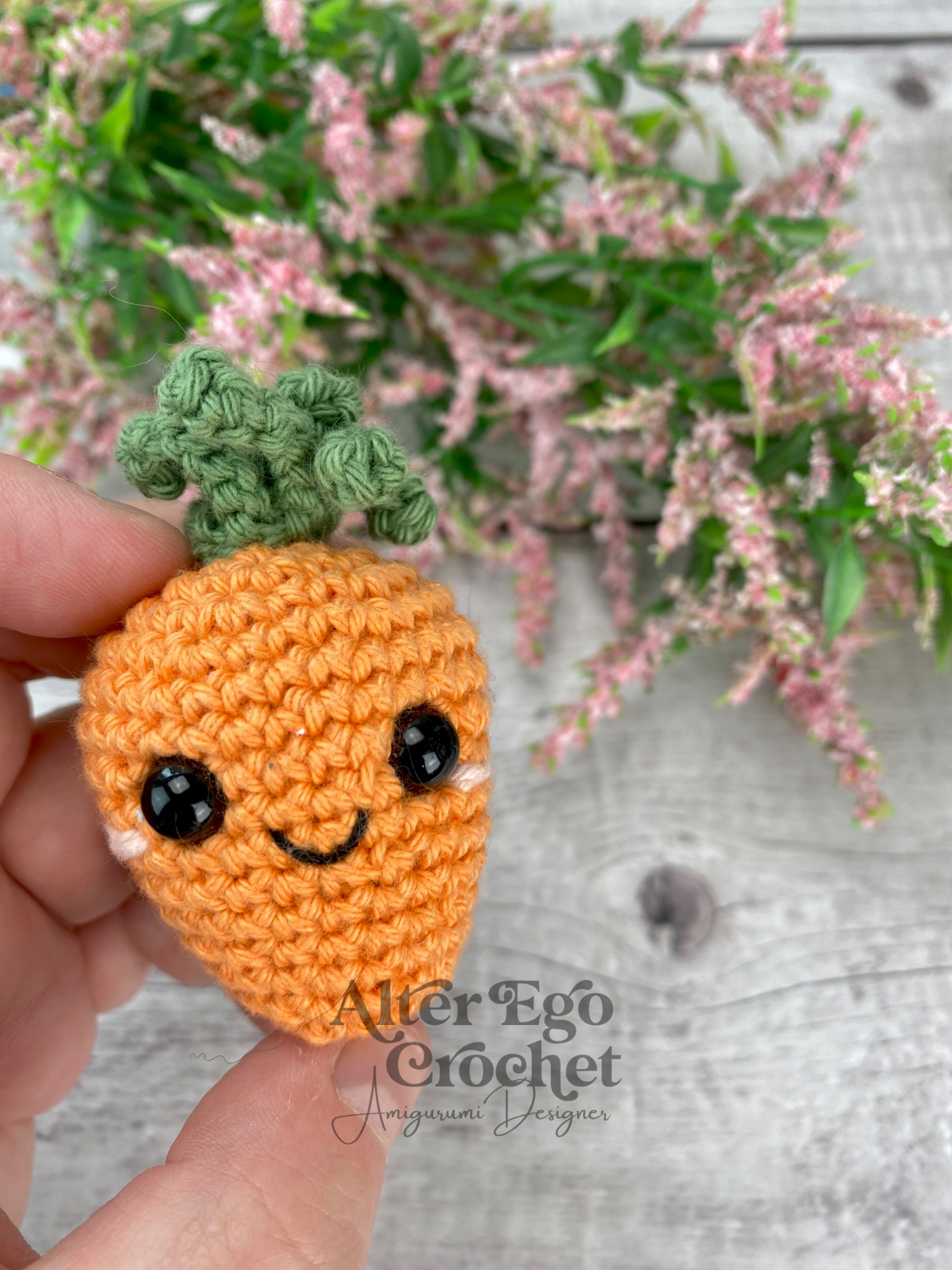 Gulerod/pastinak bliver 6,5 cm og potte 4 cm hvis du bruger samme garn og hæklenål som mig. Du kan sagtens bruge en anden nål og andet garn, hvis han skal være større eller mindre.