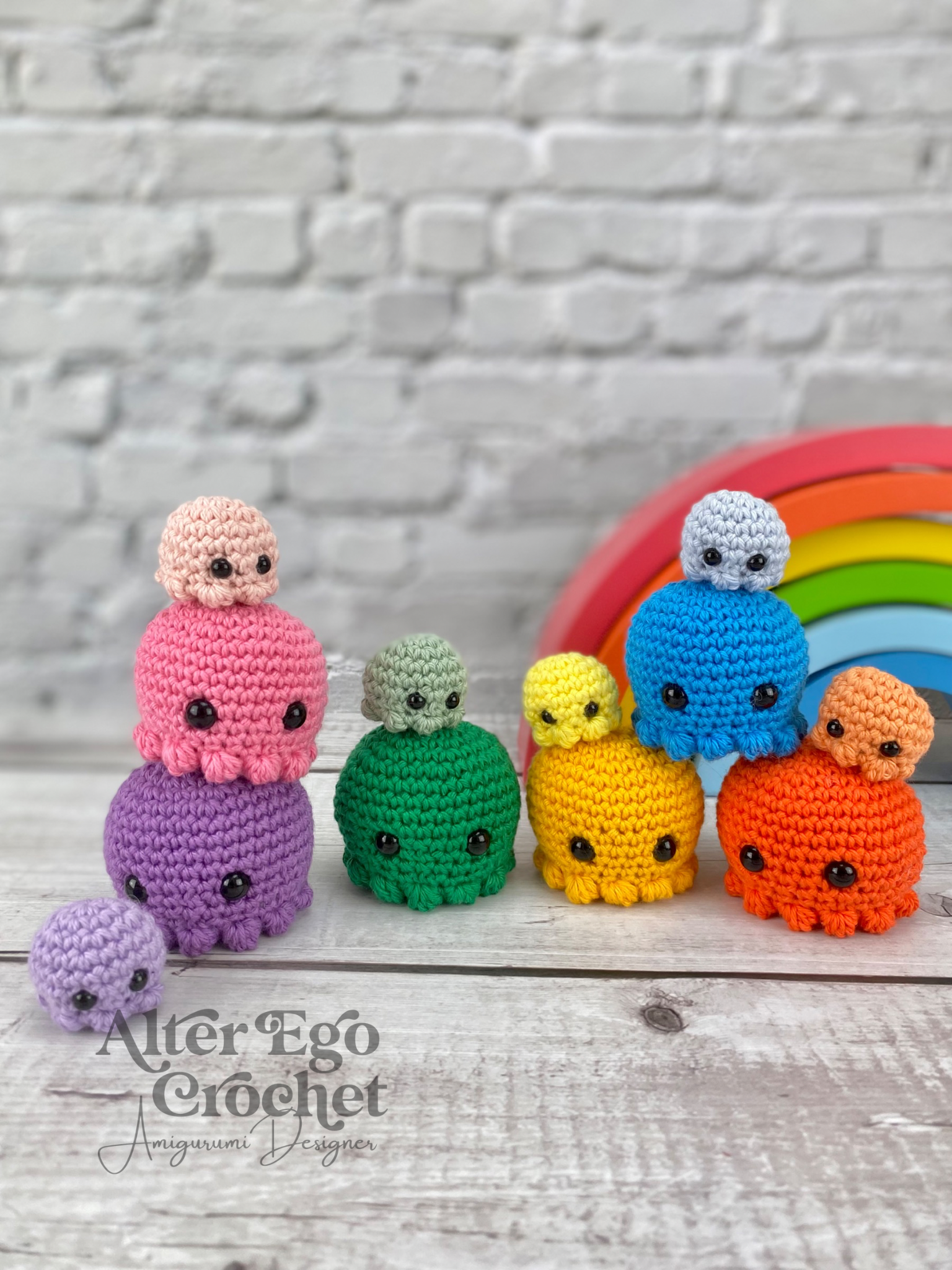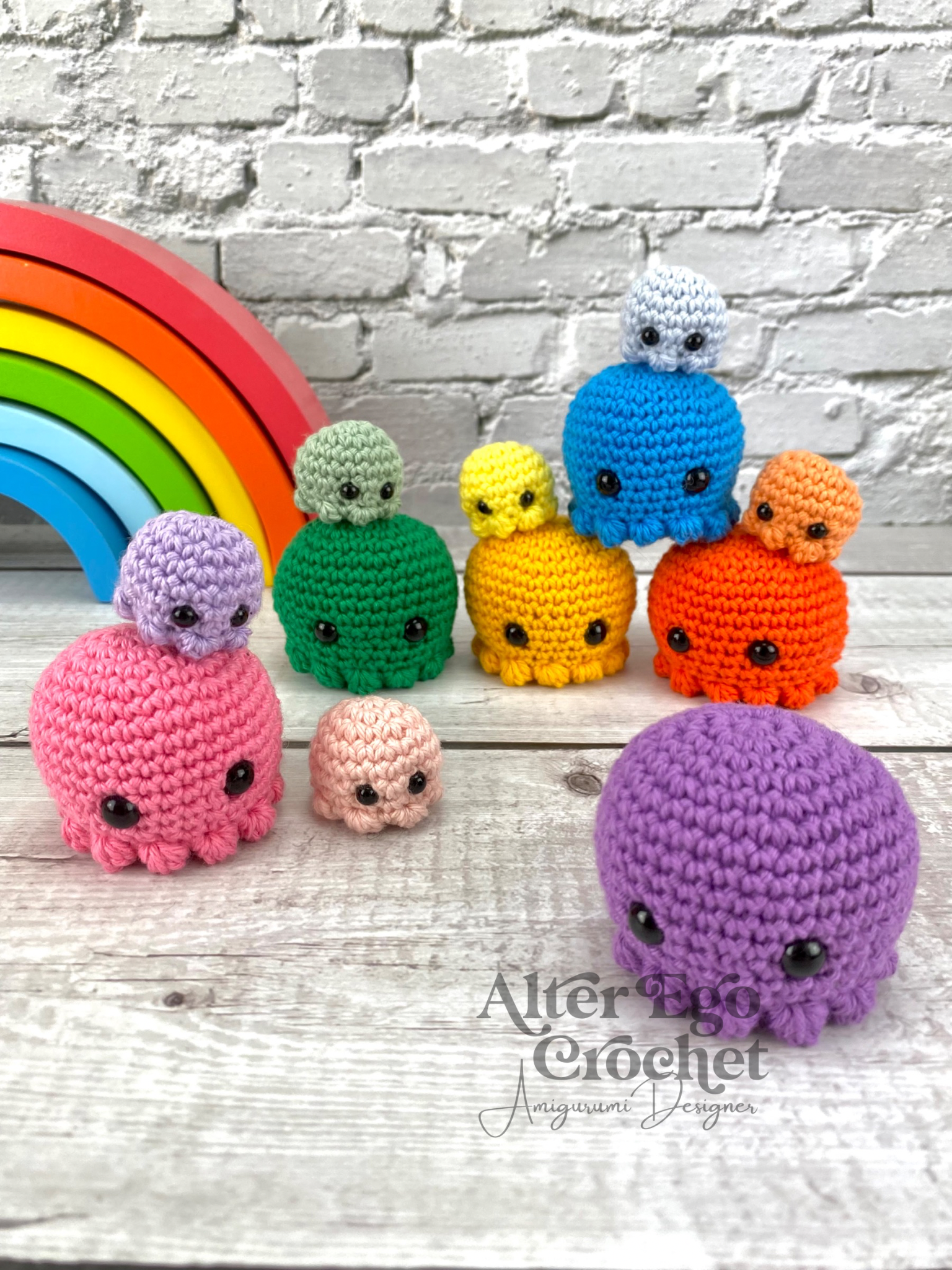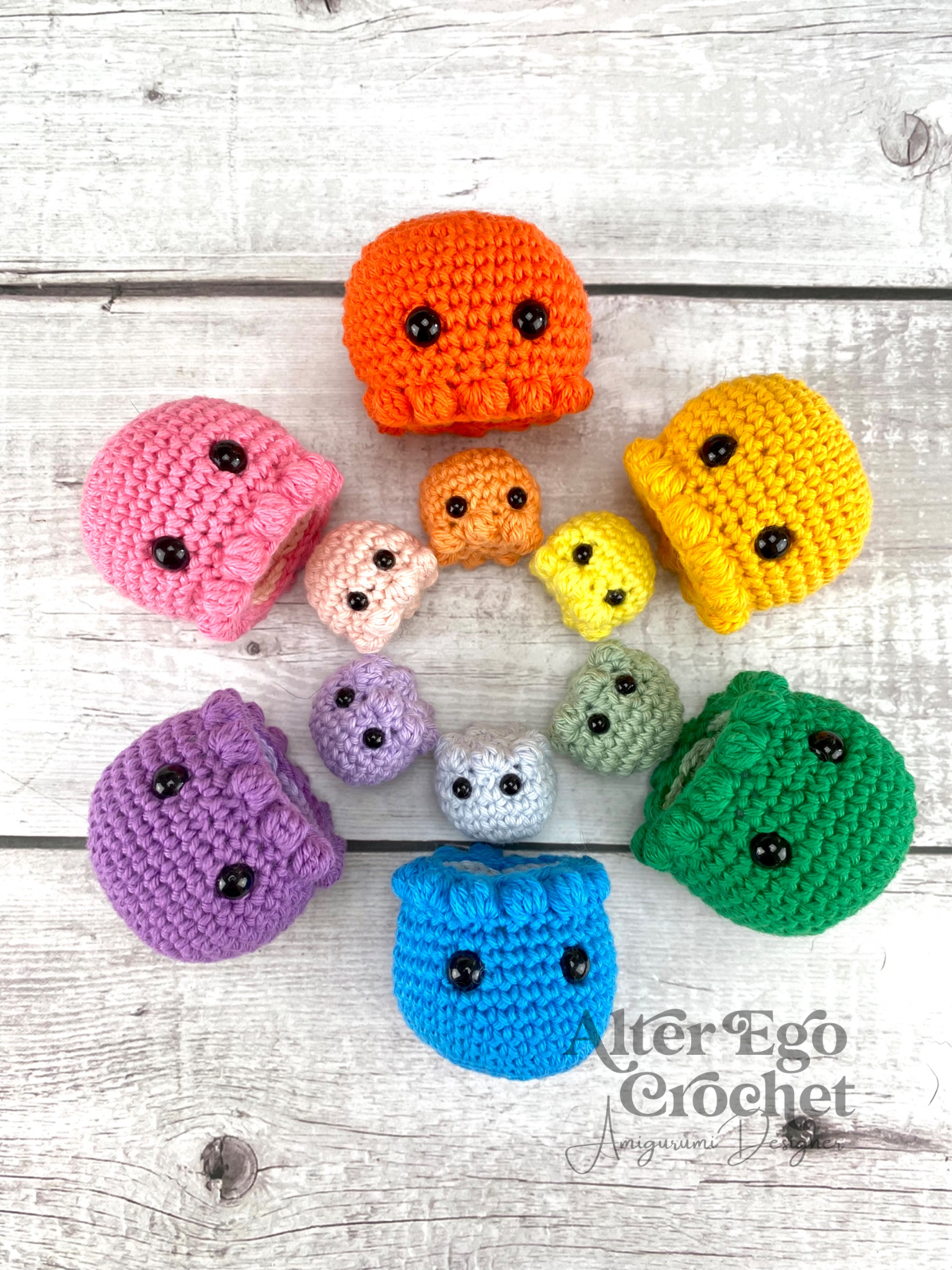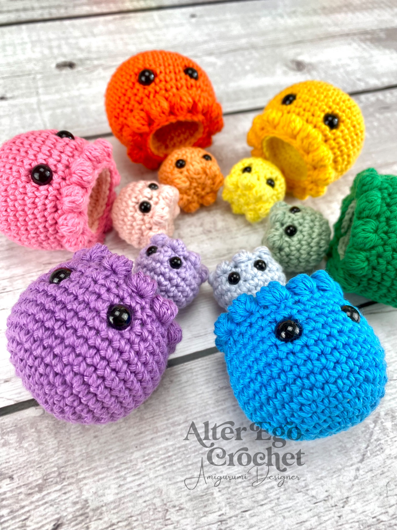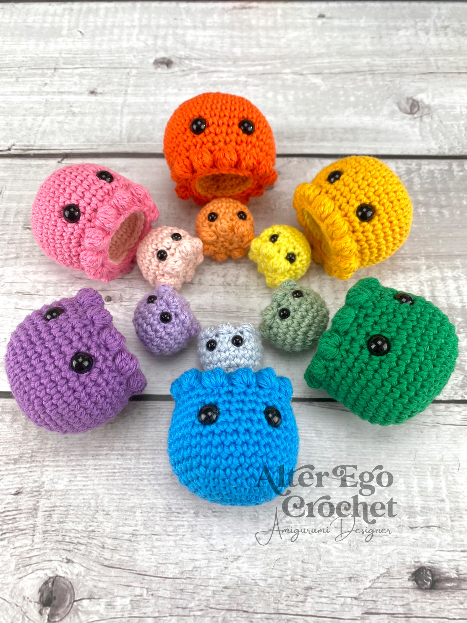 Moren bliver bliver 5 cm og babyen 2 cm, hvis du bruger samme garn og hæklenål som mig. Du kan sagtens bruge en anden nål og andet garn, hvis de skal være større eller mindre.