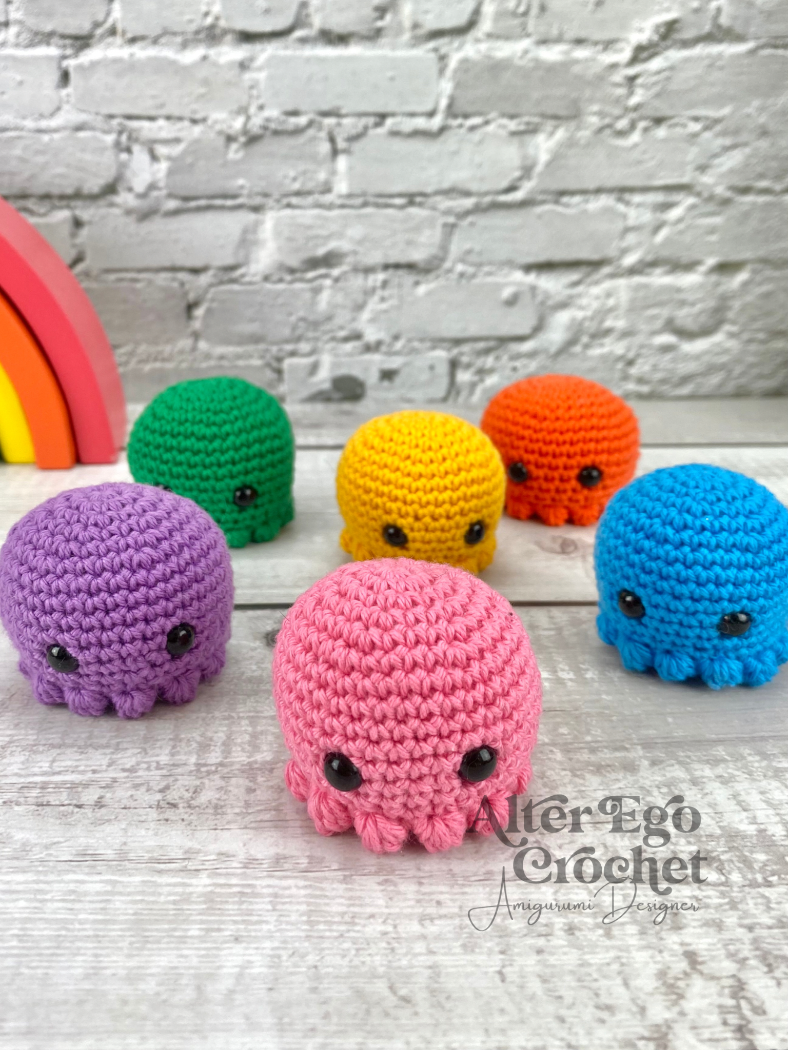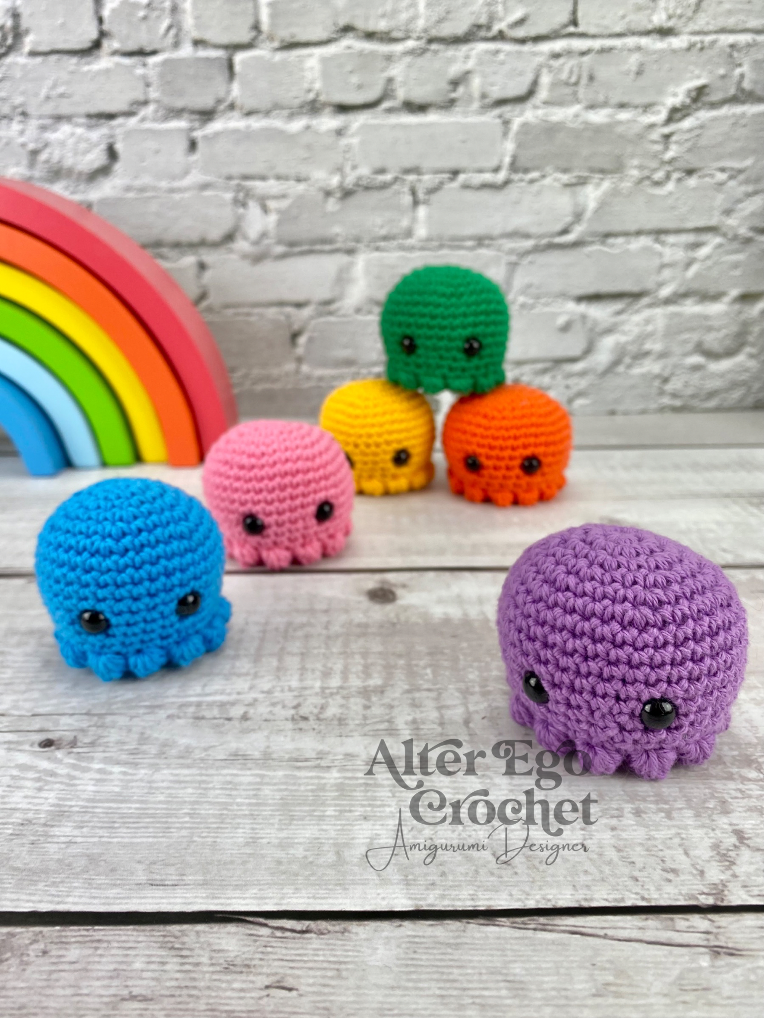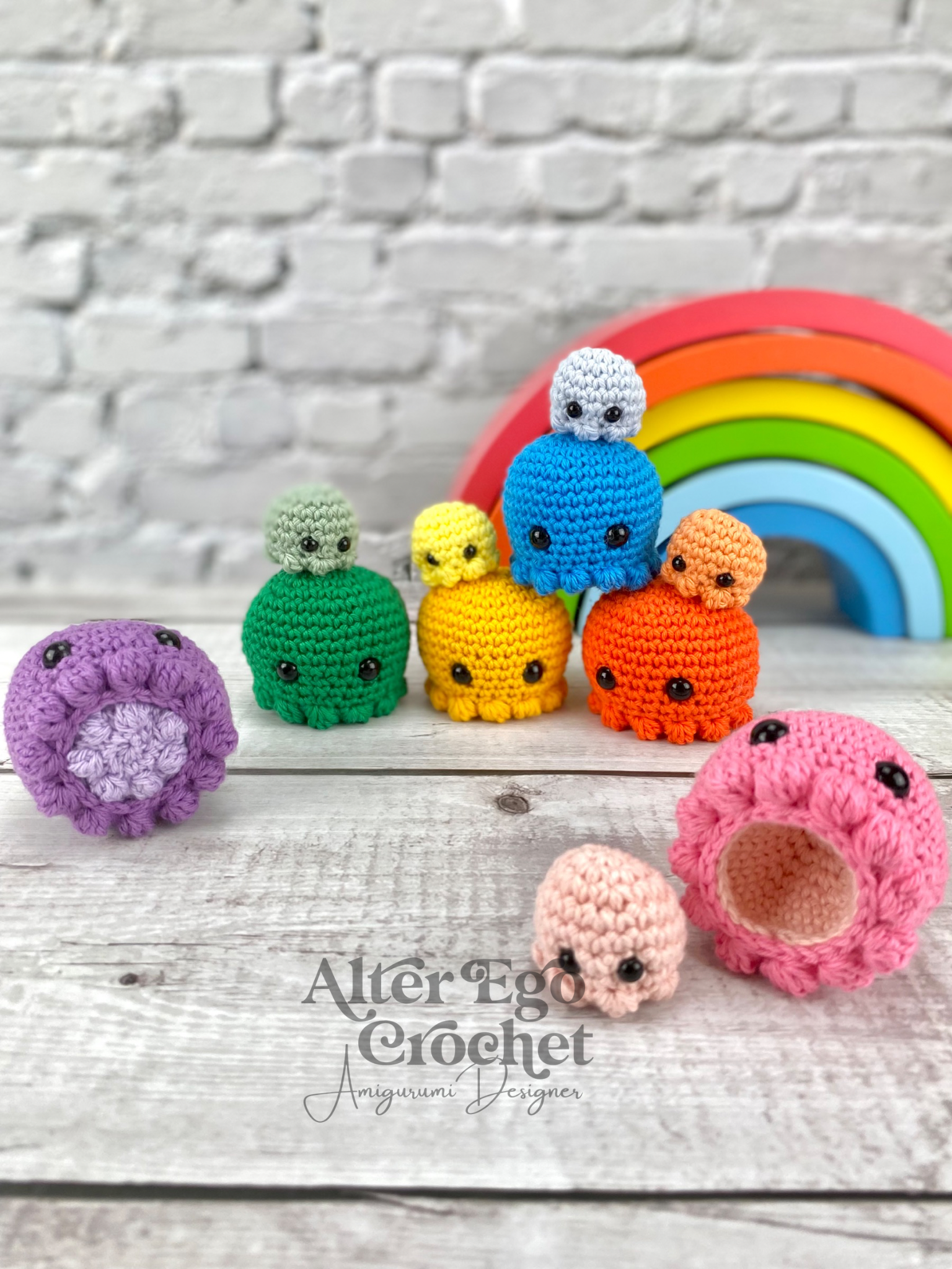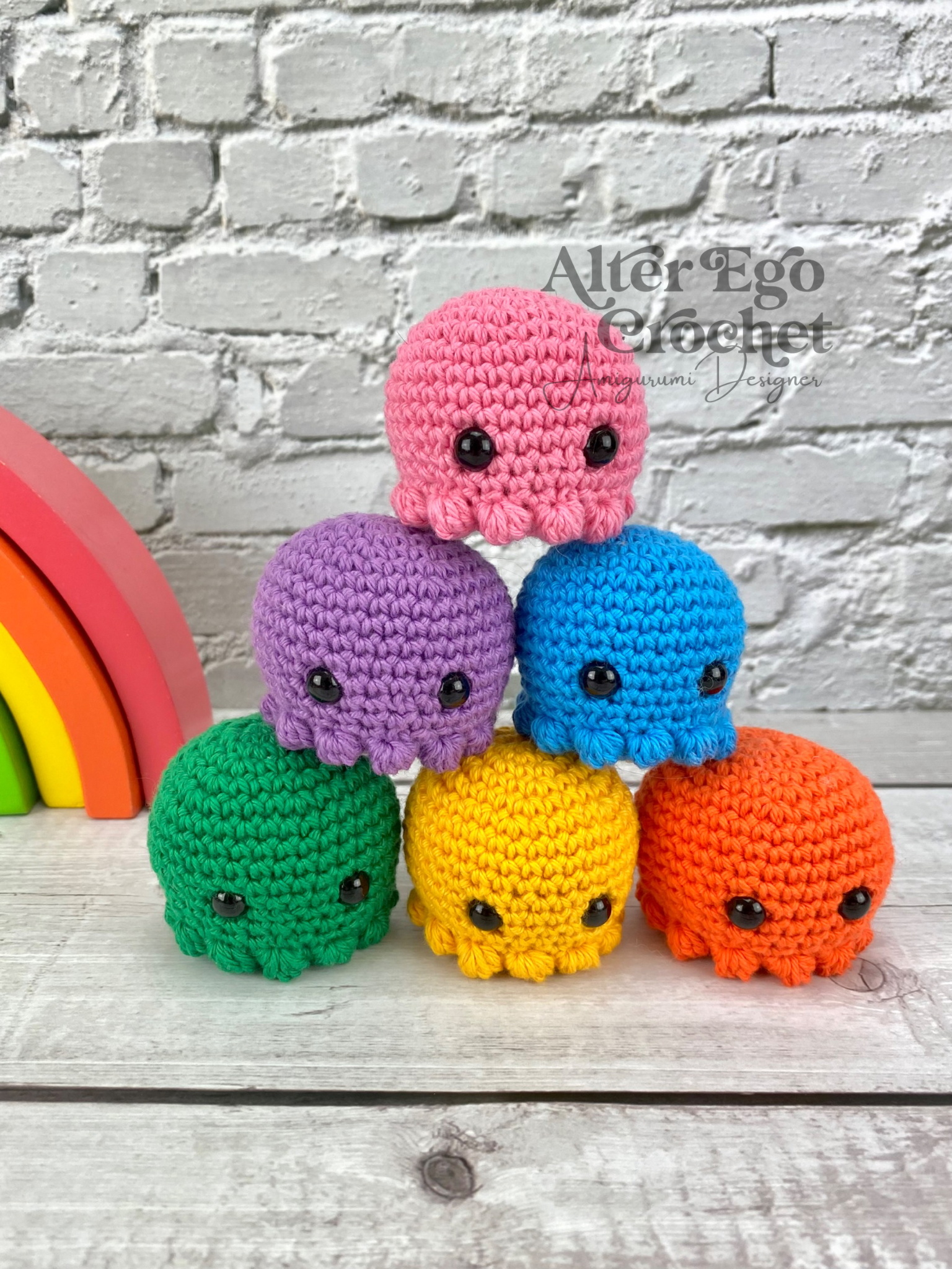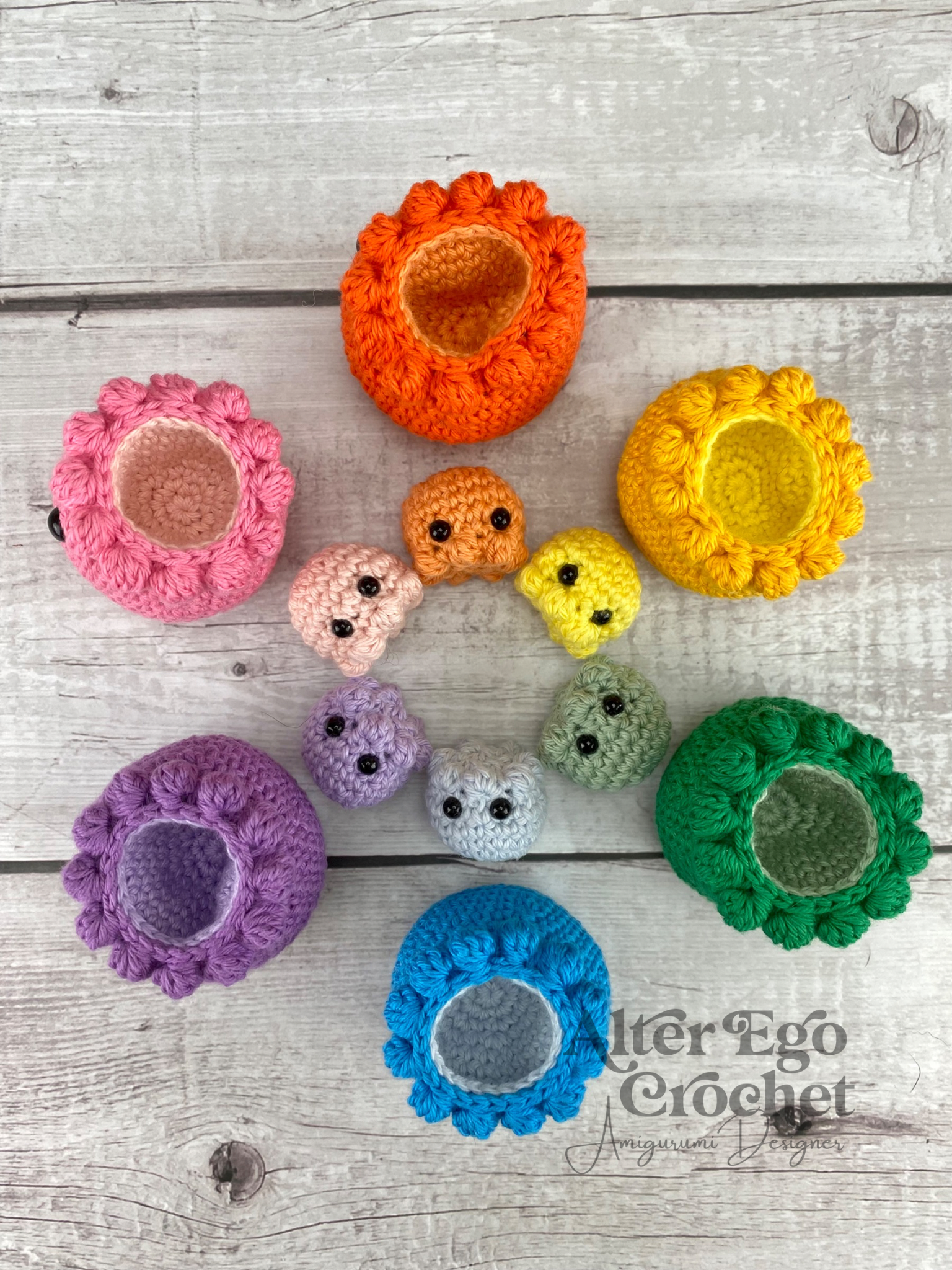 Moren bliver bliver 5 cm og babyen 2 cm, hvis du bruger samme garn og hæklenål som mig. Du kan sagtens bruge en anden nål og andet garn, hvis de skal være større eller mindre.