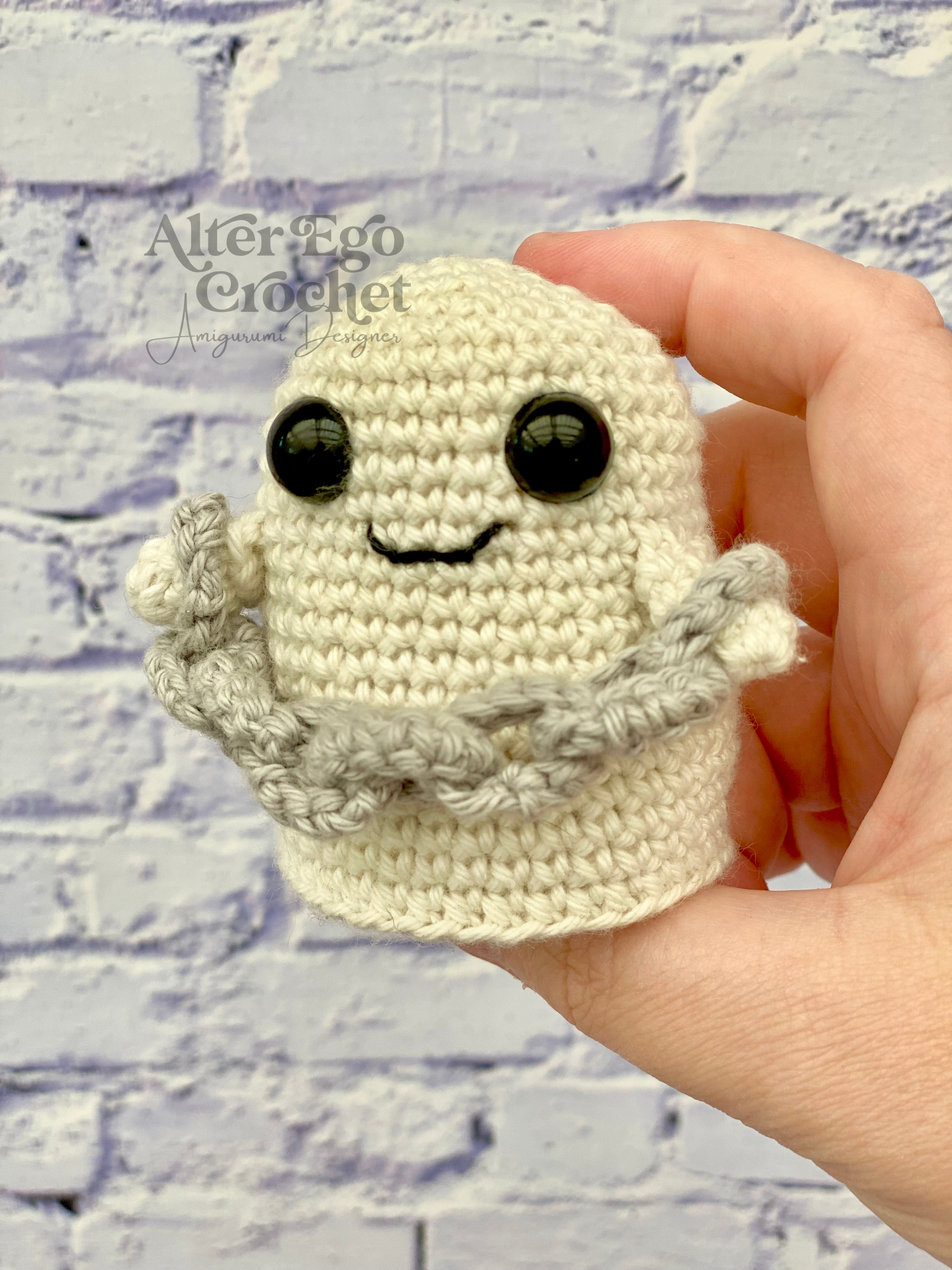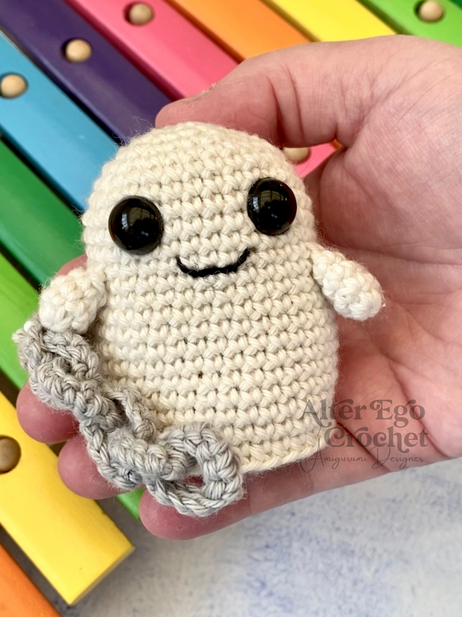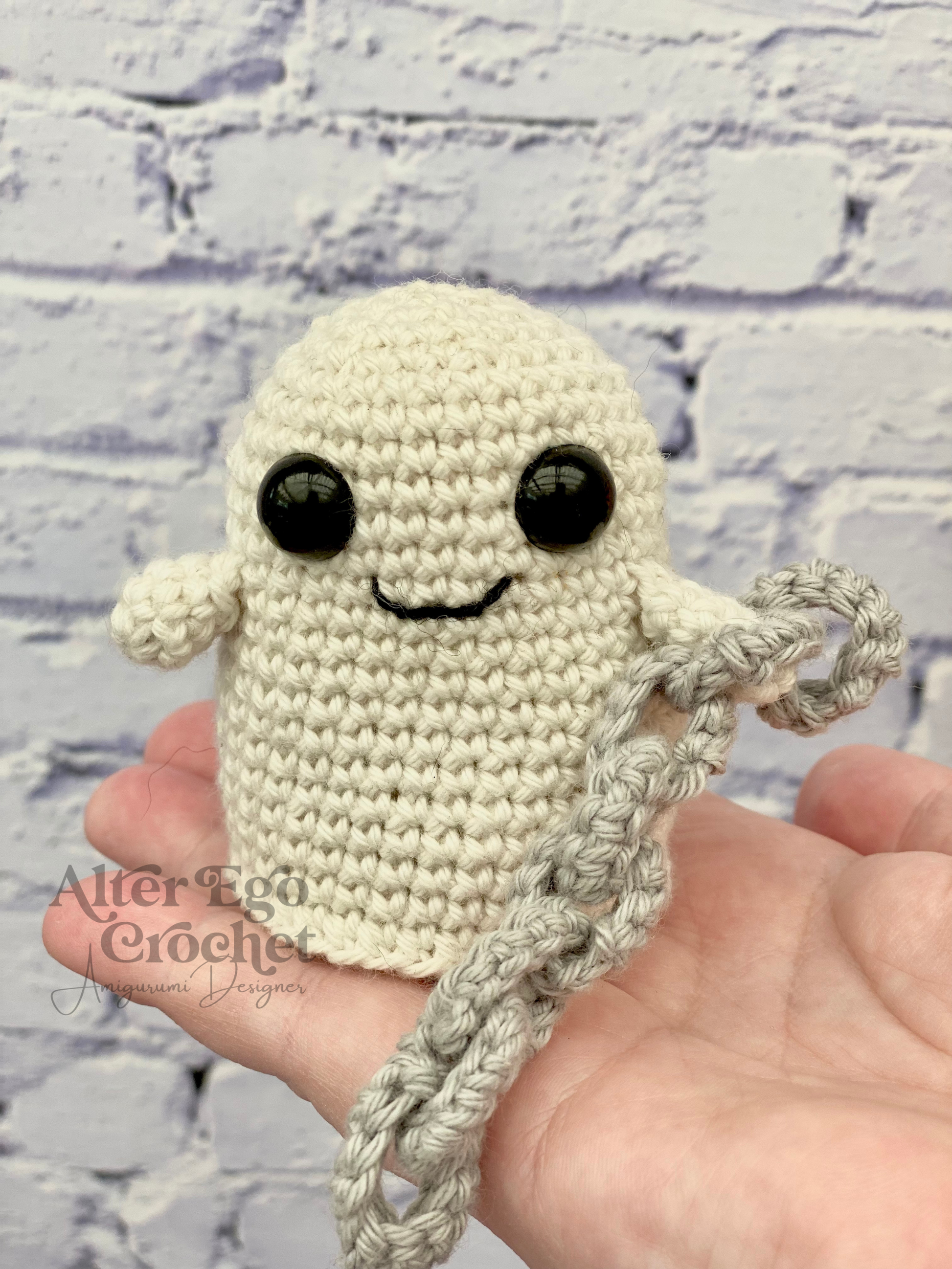 Hr. Spøgelse er lavet helt uden syning. Det hele er hæklet i ét. Det er kun munden, der er syet på.