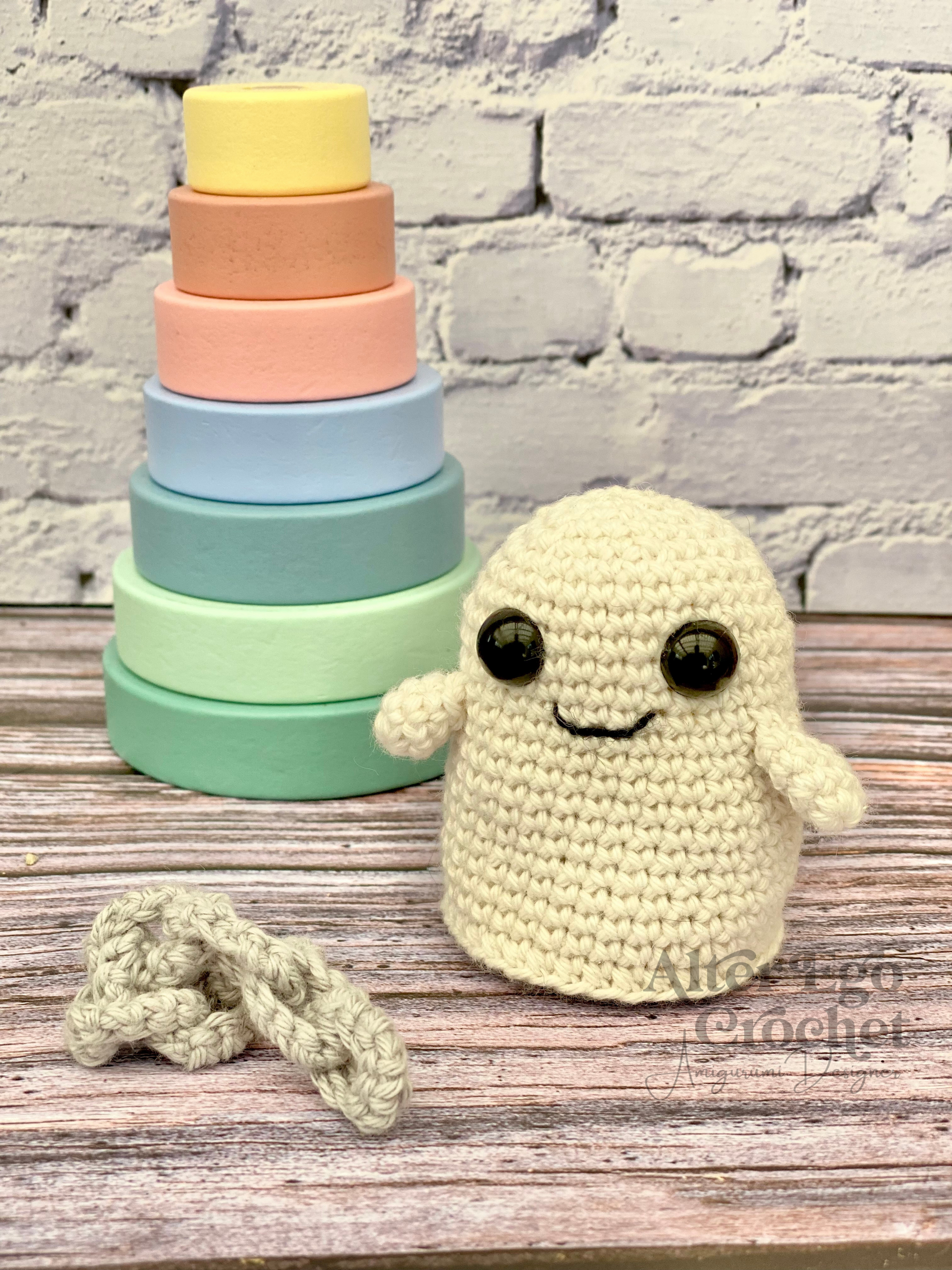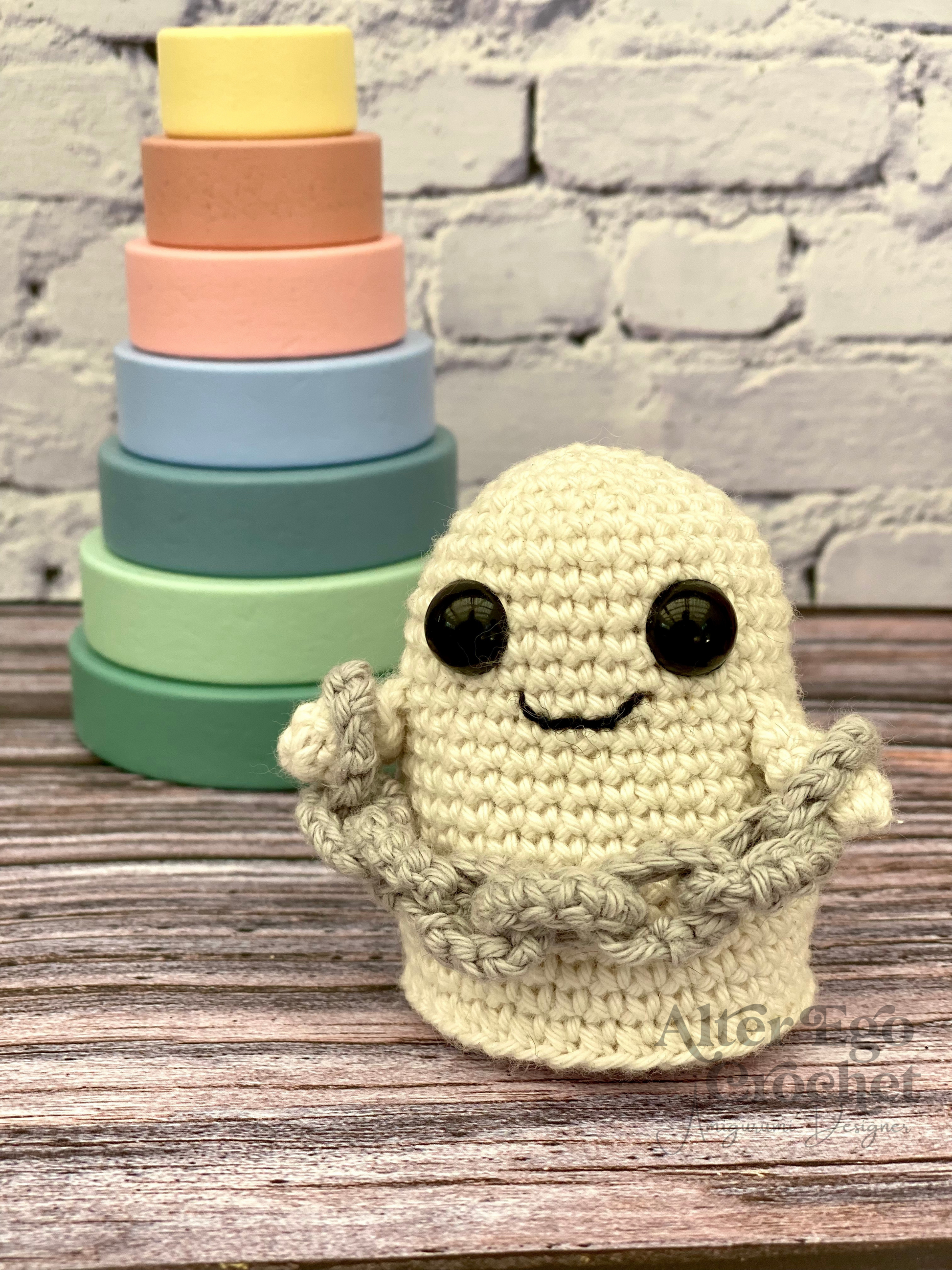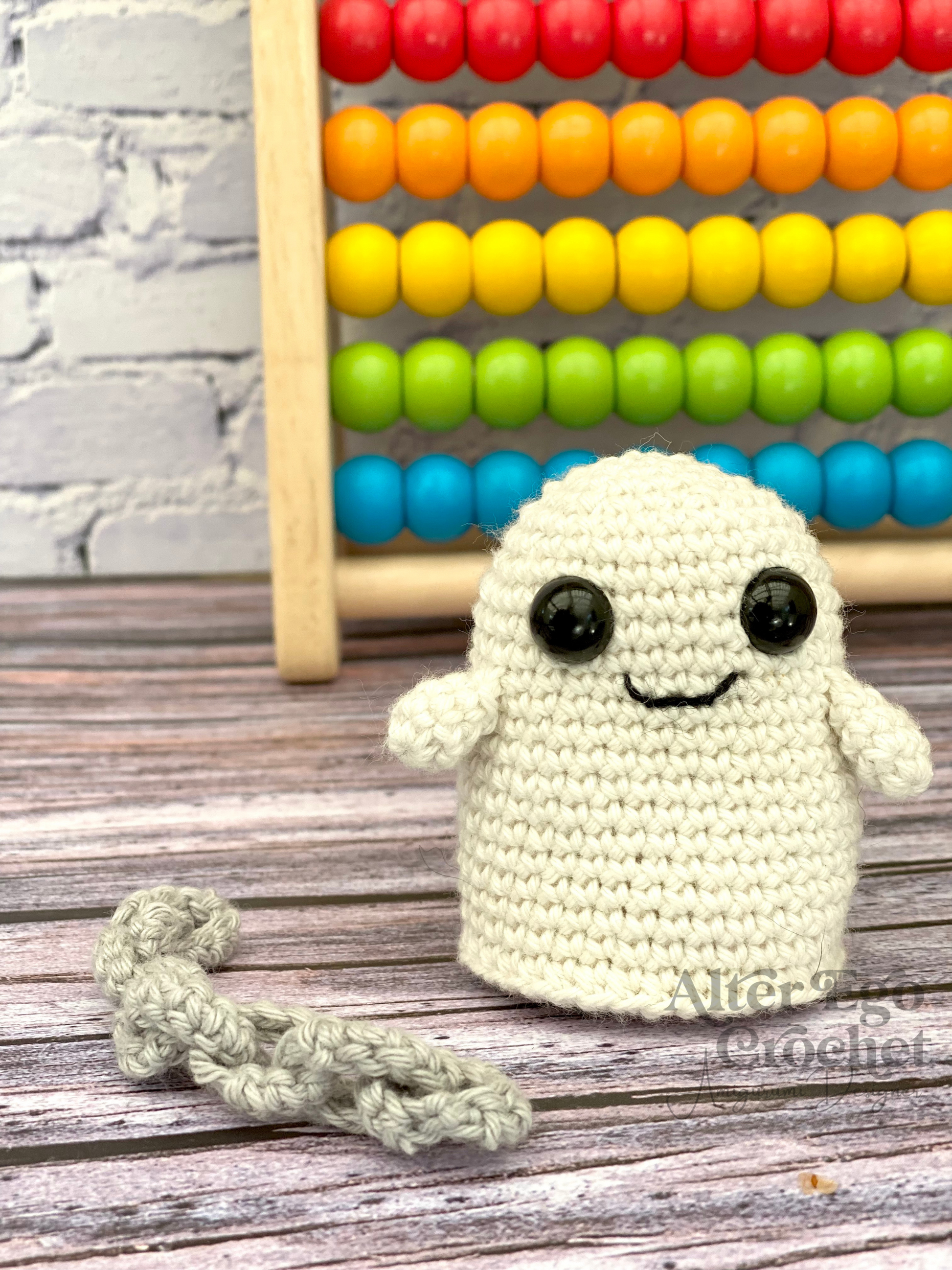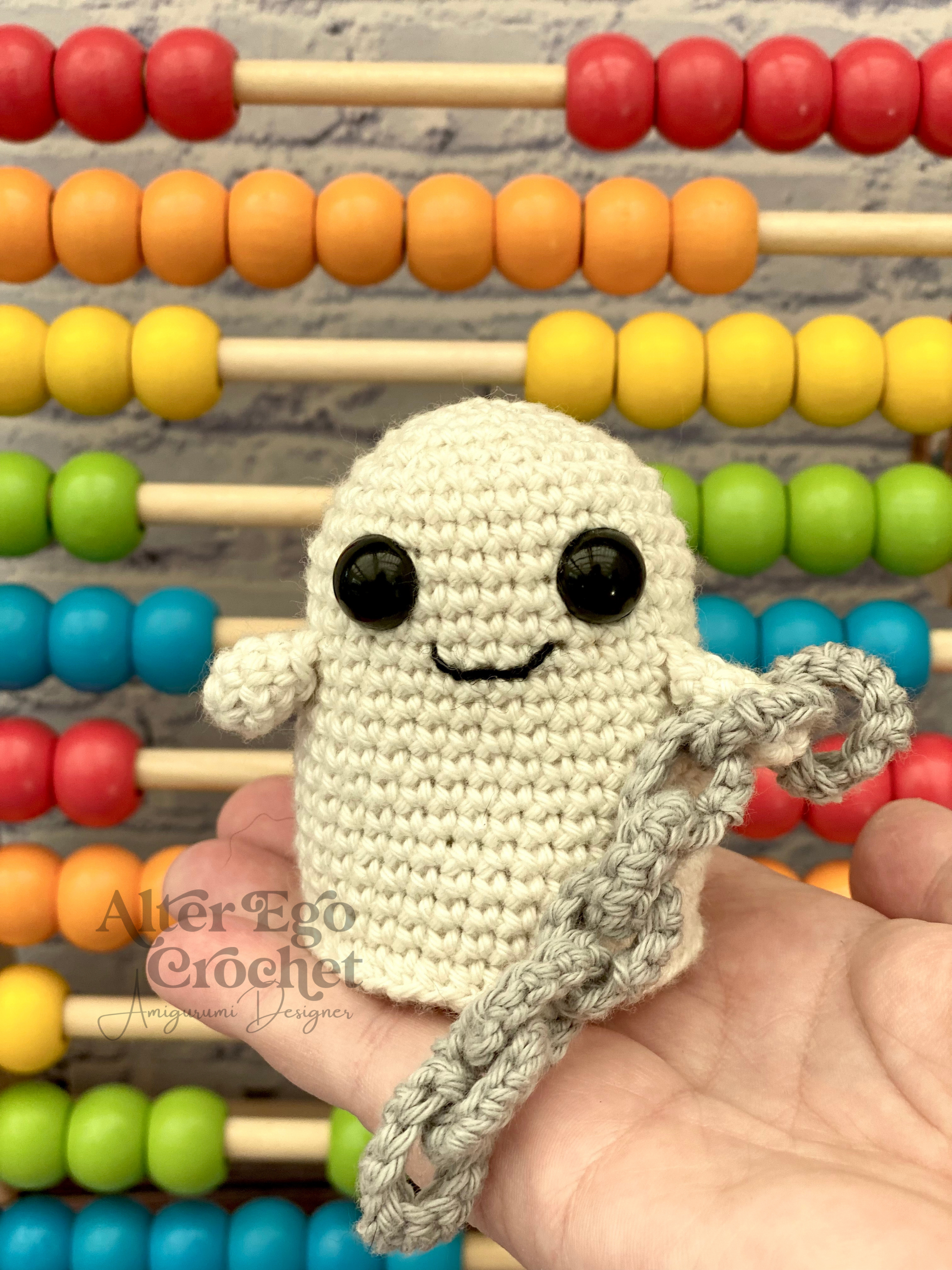 Hr. Spøgelse er lavet helt uden syning. Det hele er hæklet i ét. Det er kun munden, der er syet på.