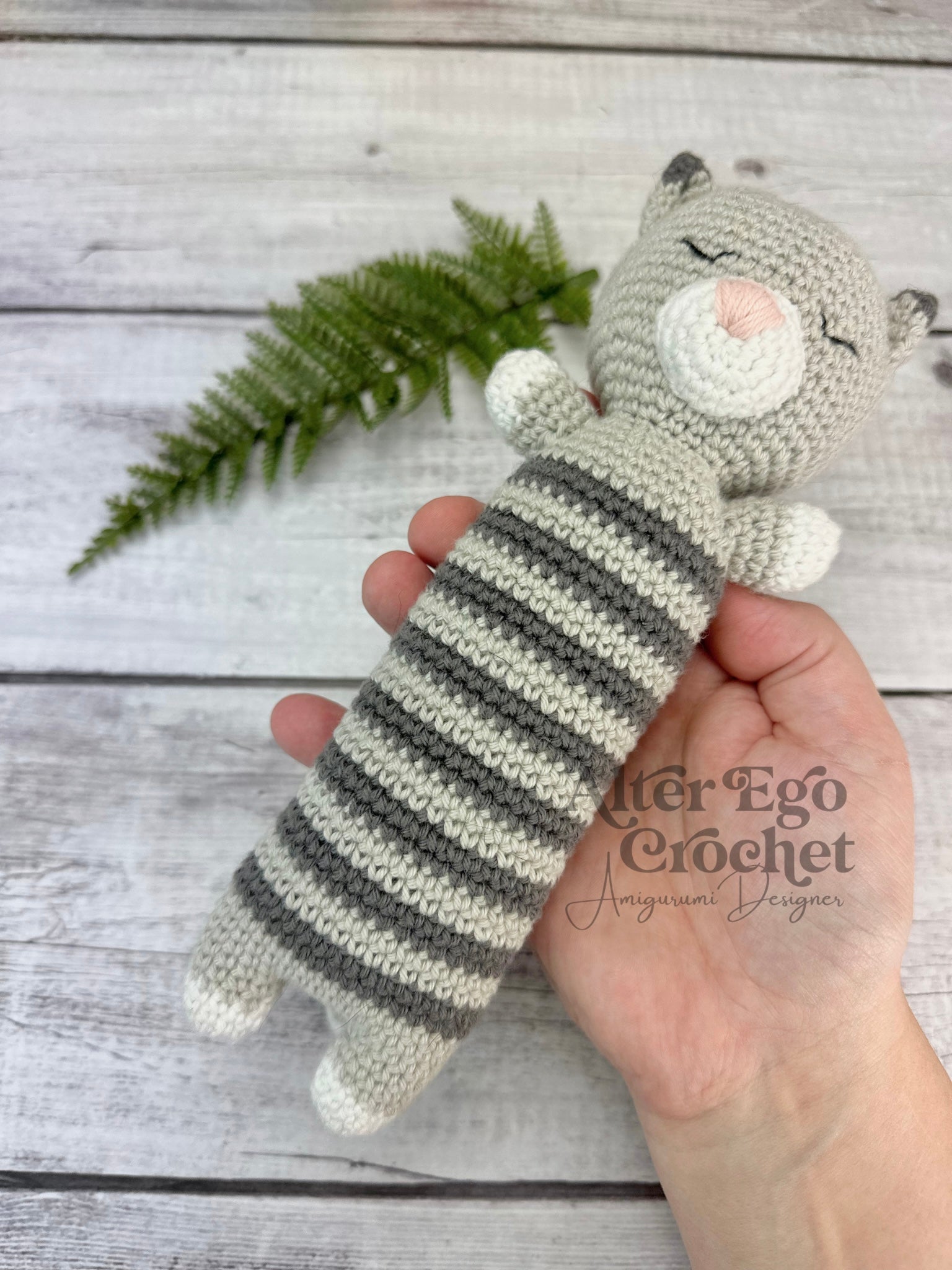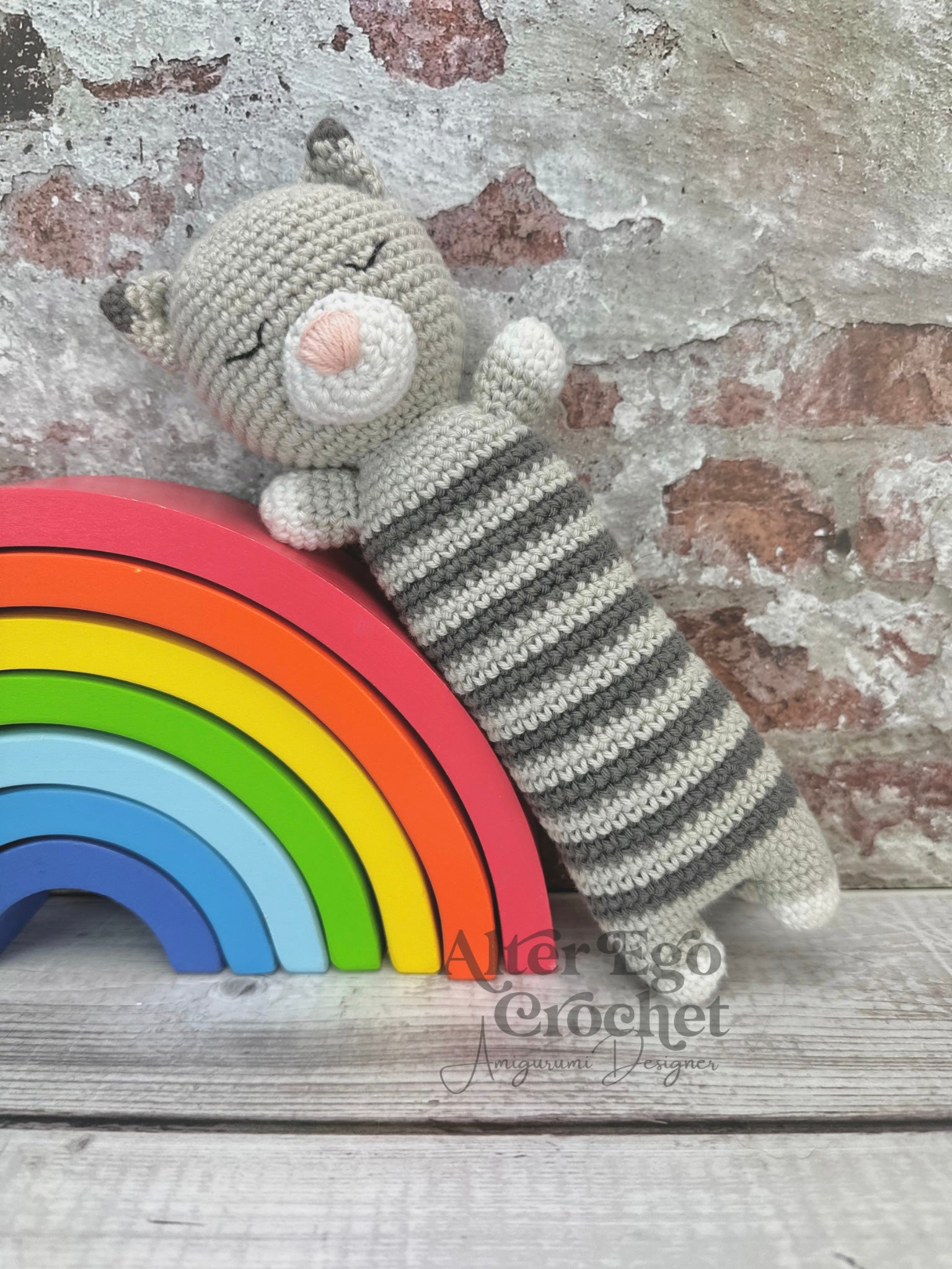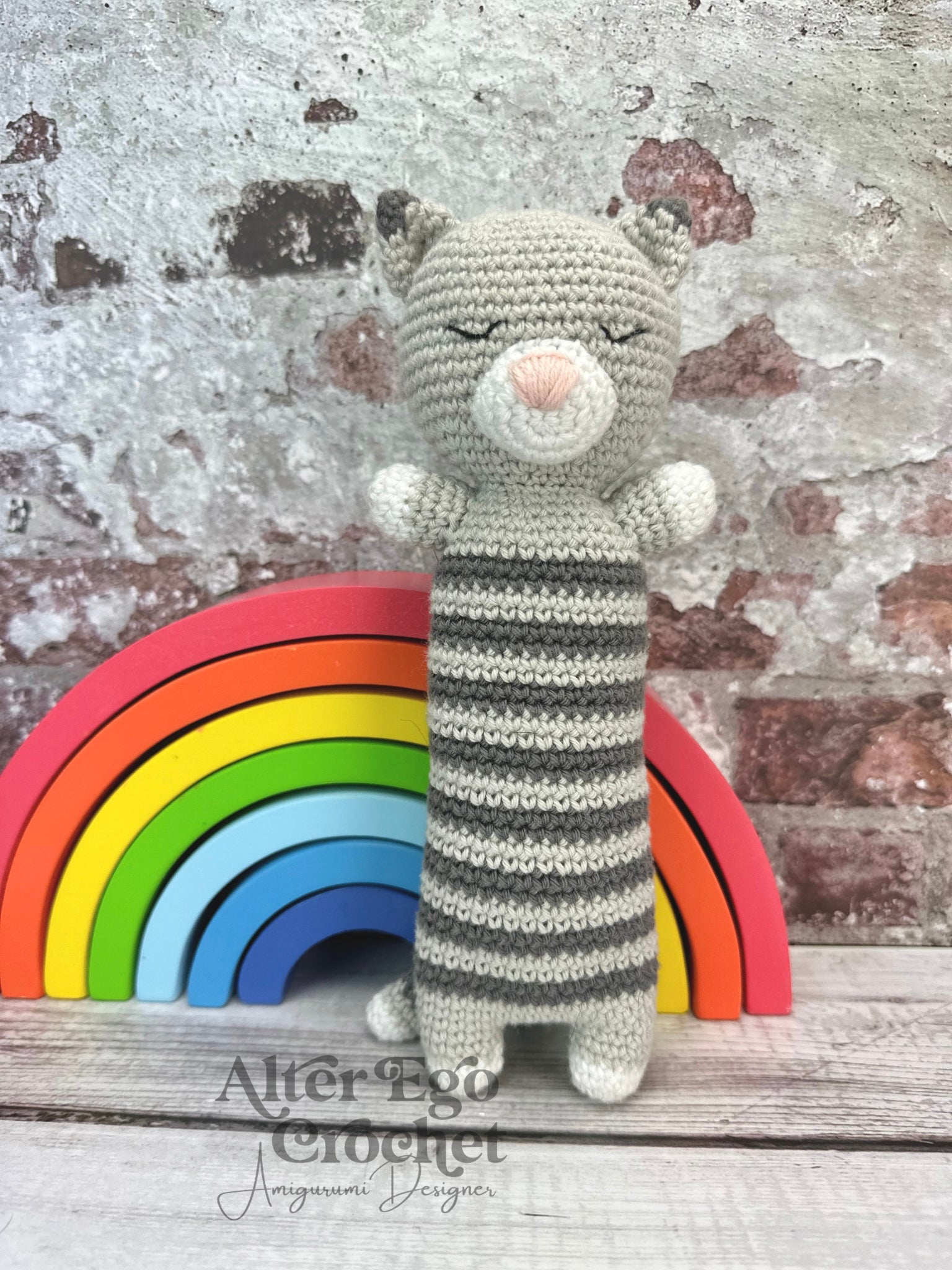 Cathrine bliver 23 cm. hvis du bruger samme garn og hæklenål som mig. Du kan sagtens bruge en anden nål og andet garn, hvis han skal være større eller mindre.
