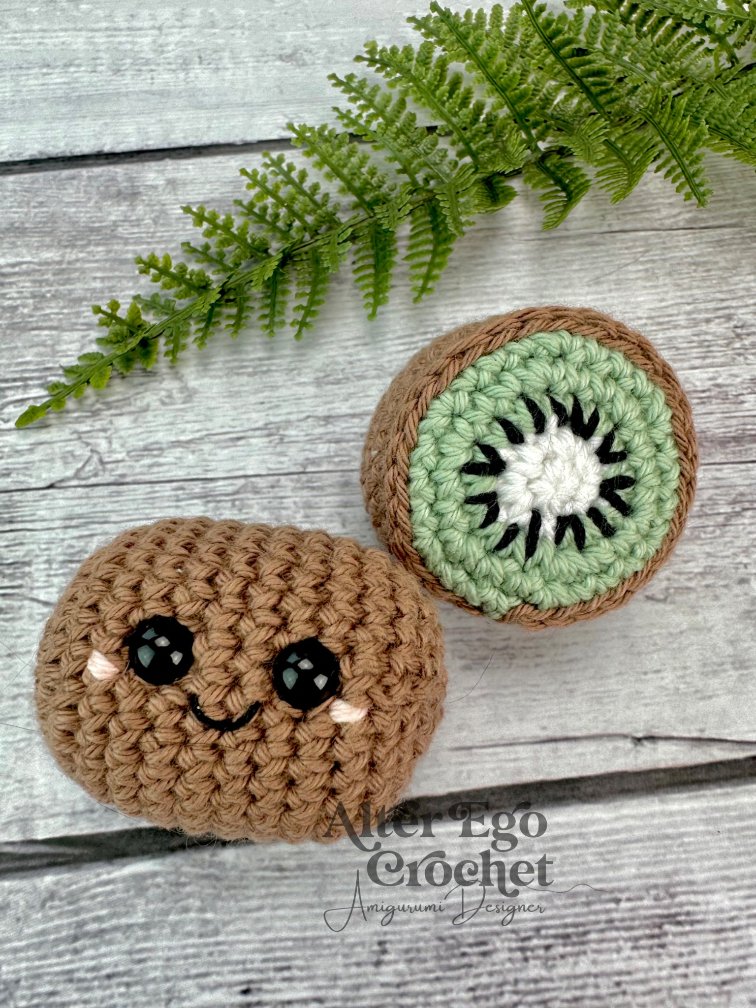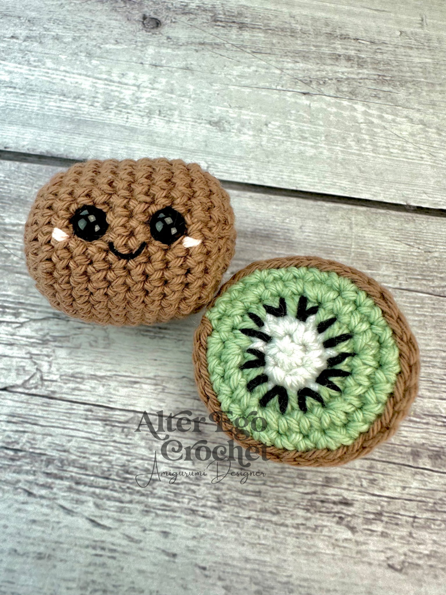 Den hele kiwi bliver 5 cm og den halve 4 cm, hvis du bruger samme garn og hæklenål som mig. Du kan sagtens bruge en anden nål og andet garn, hvis den skal være større eller mindre.