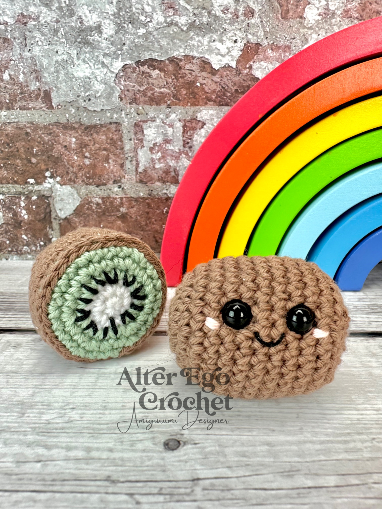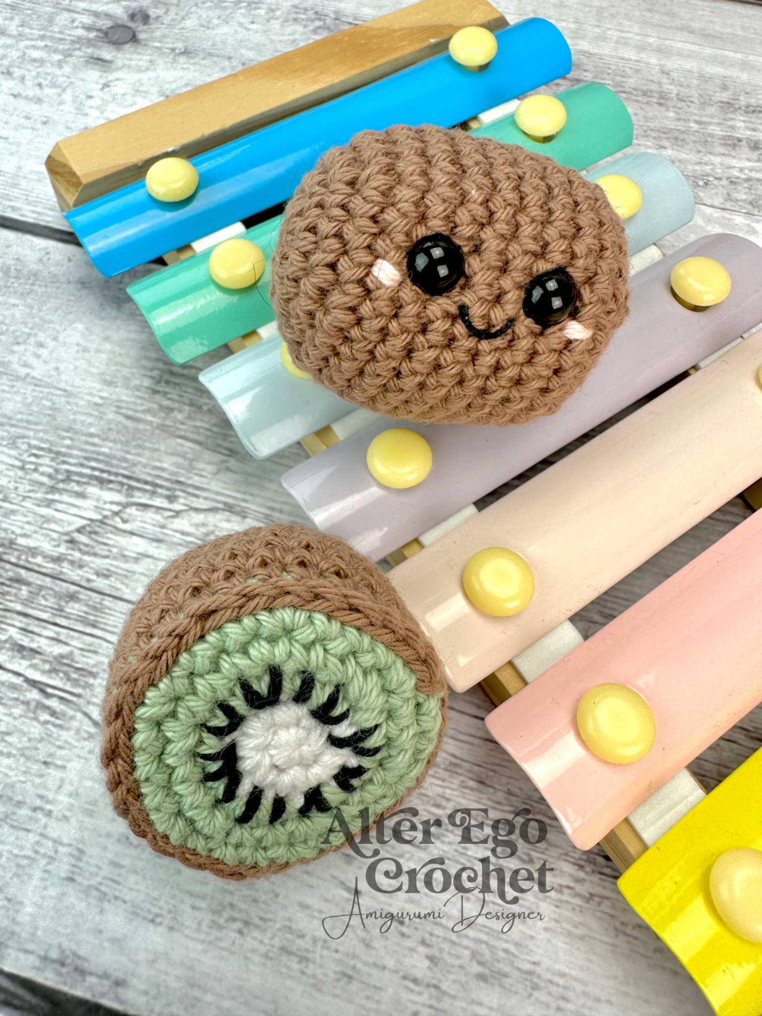 - Garn. Jeg har brugt 8/4 bomuld. Halv kiwi: 4 g brun, 1 g grøn, 1 g hvid, 1 g sort og lidt lyserød / hel kiwi: 5 g brun og lidt lyserød