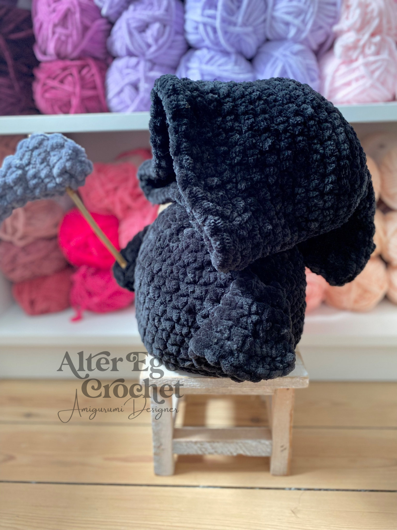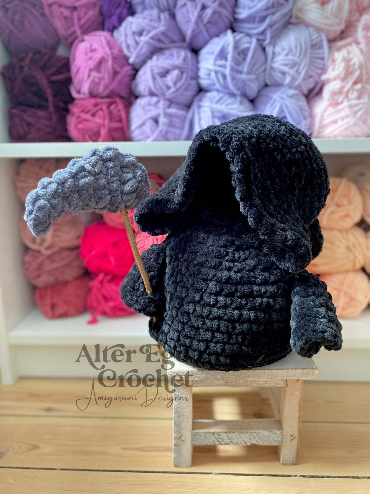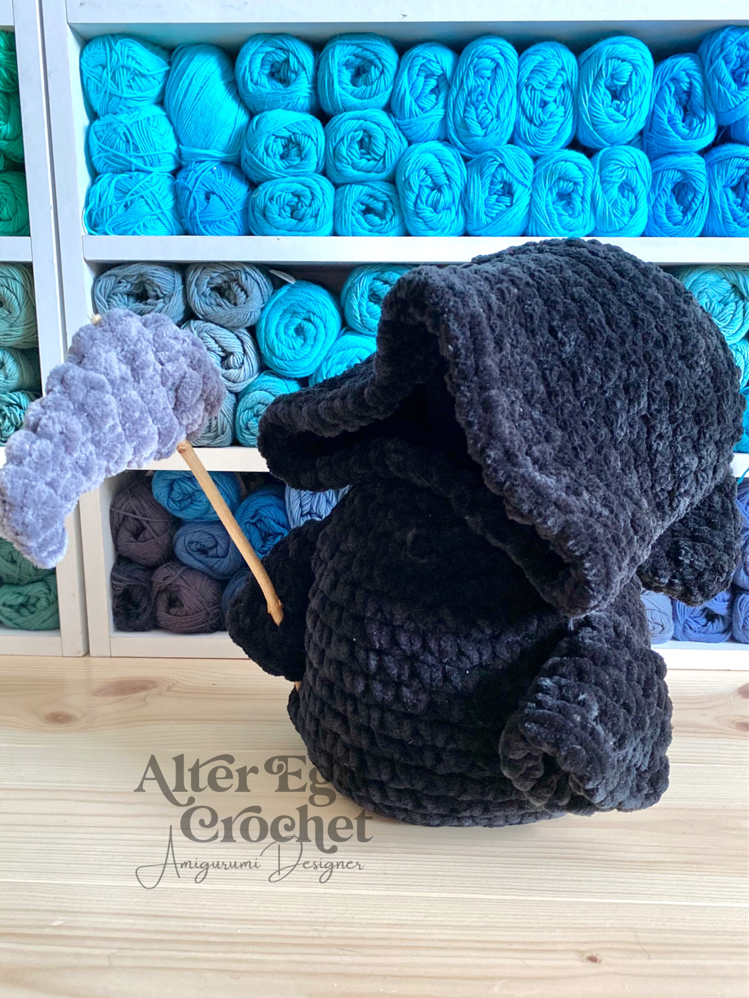 Manden med Leen bliver 33 cm. hvis du bruger samme garn og hæklenål som mig. Du kan sagtens bruge en anden nål og andet garn, hvis han skal være større eller mindre.