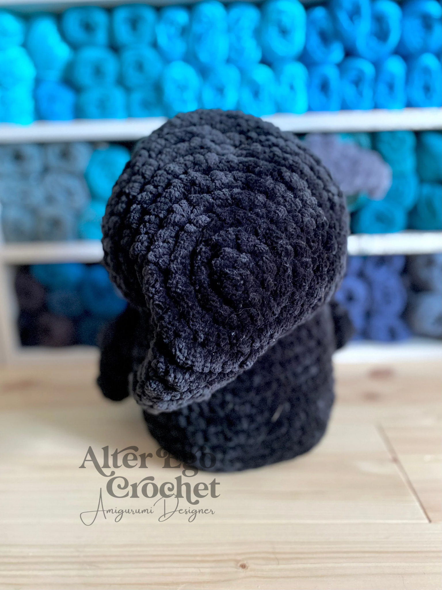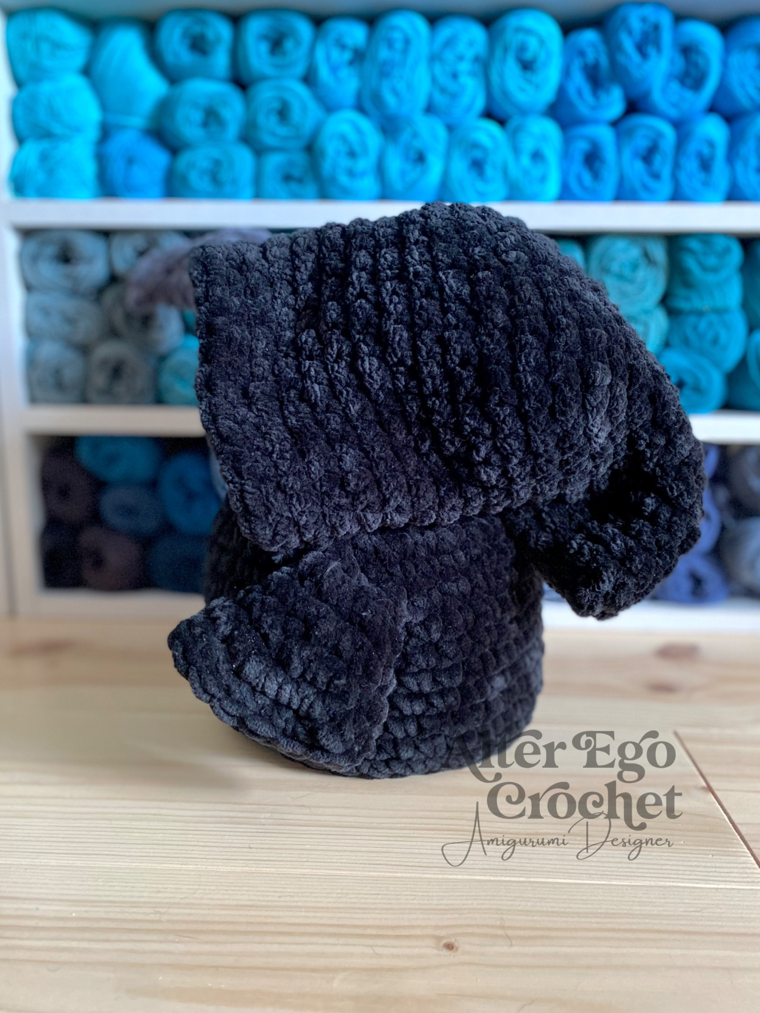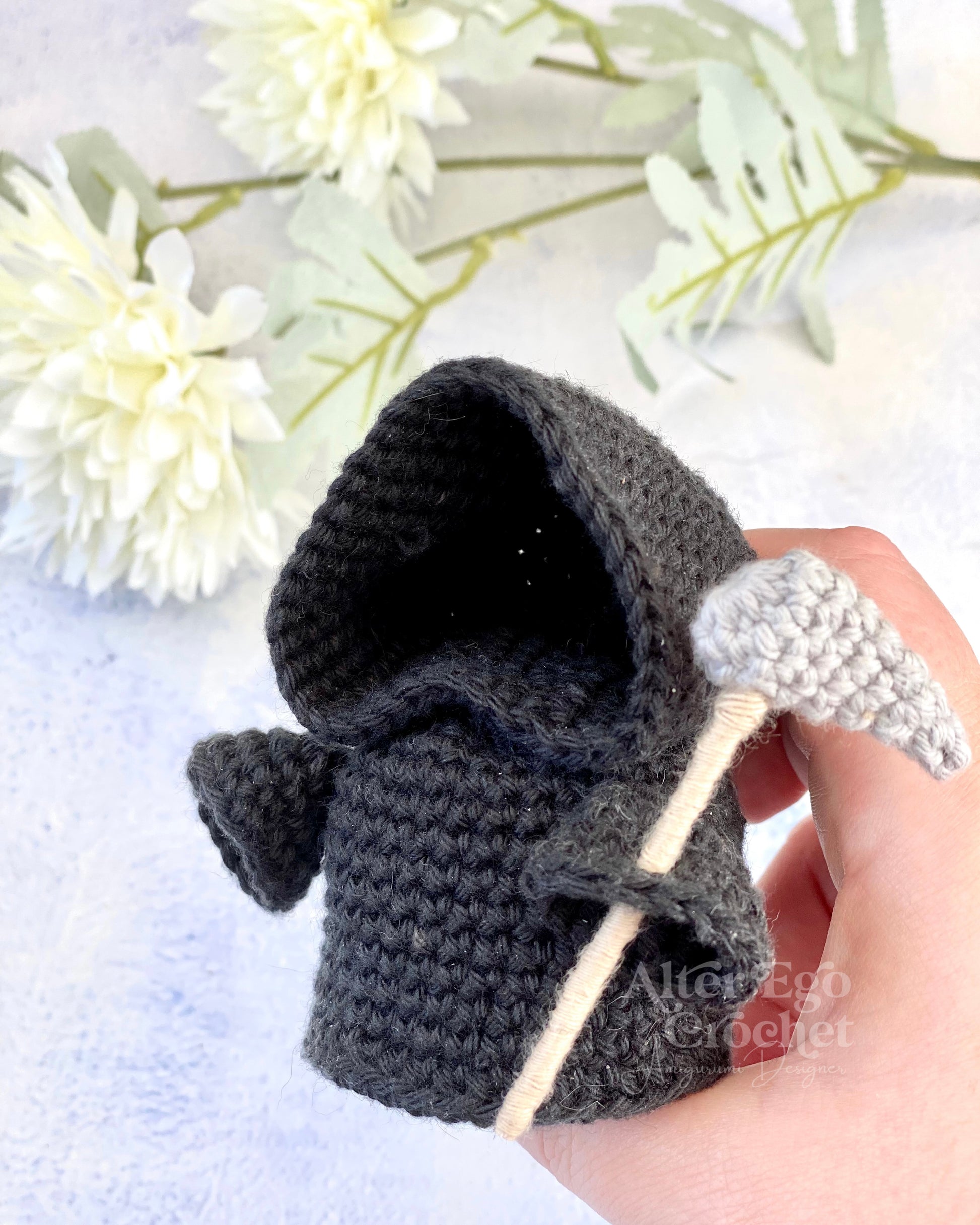 Manden med Leen bliver 33 cm. hvis du bruger samme garn og hæklenål som mig. Du kan sagtens bruge en anden nål og andet garn, hvis han skal være større eller mindre.
