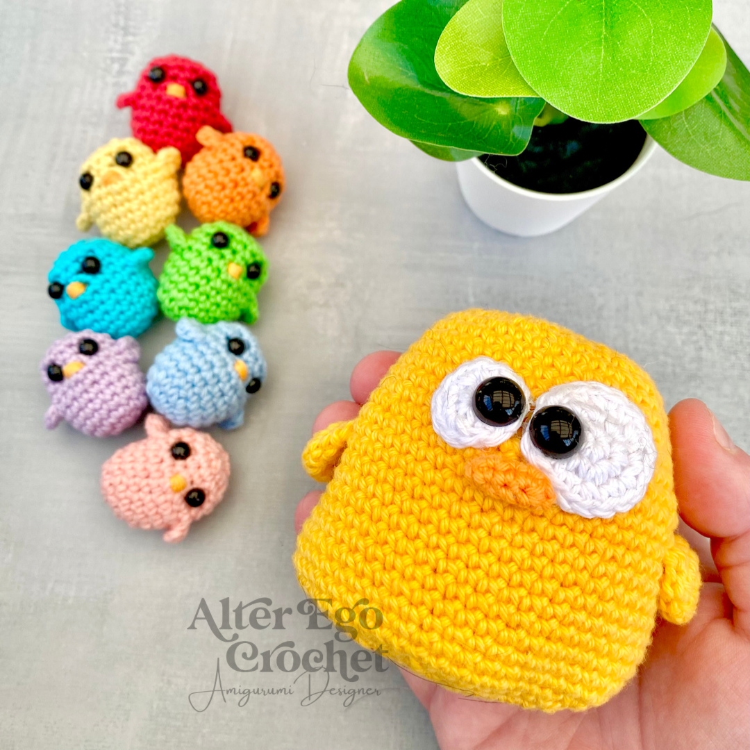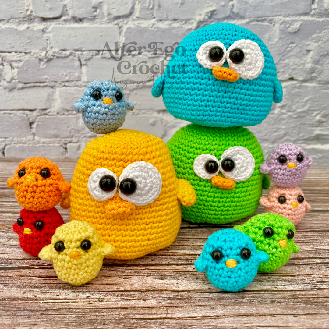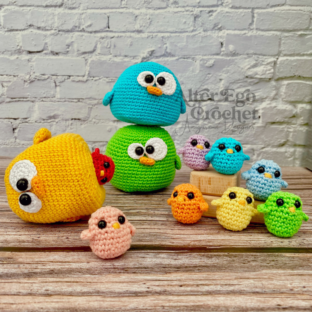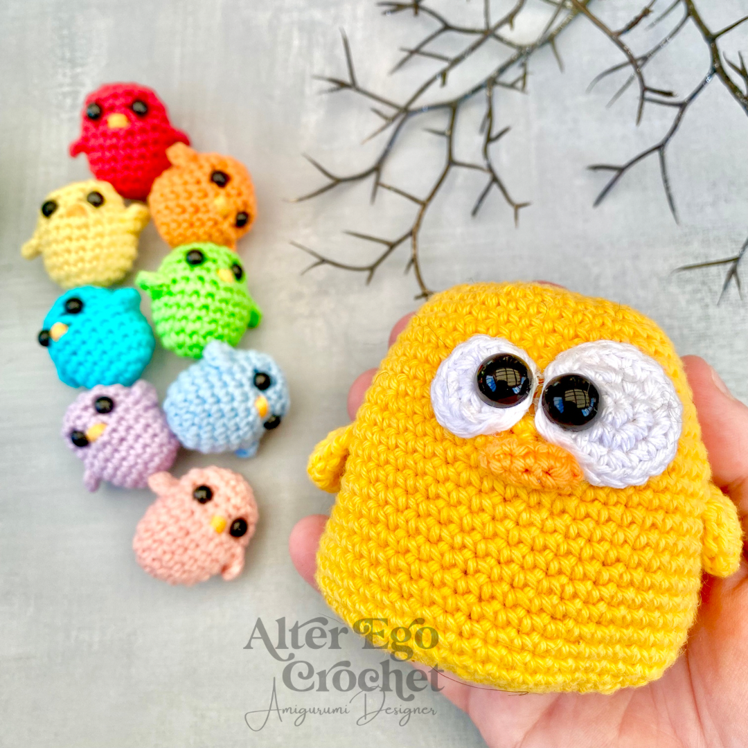 Den store kylling bliver 8 cm. Og de små bliver 3 cm hvis du bruger samme garn og hæklenål som mig. Du kan sagtens bruge en anden nål og andet garn, hvis de skal være større eller mindre.