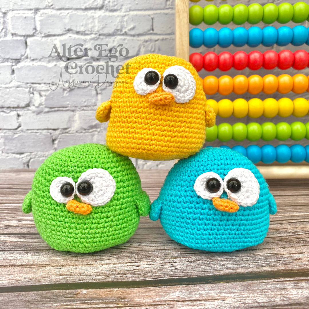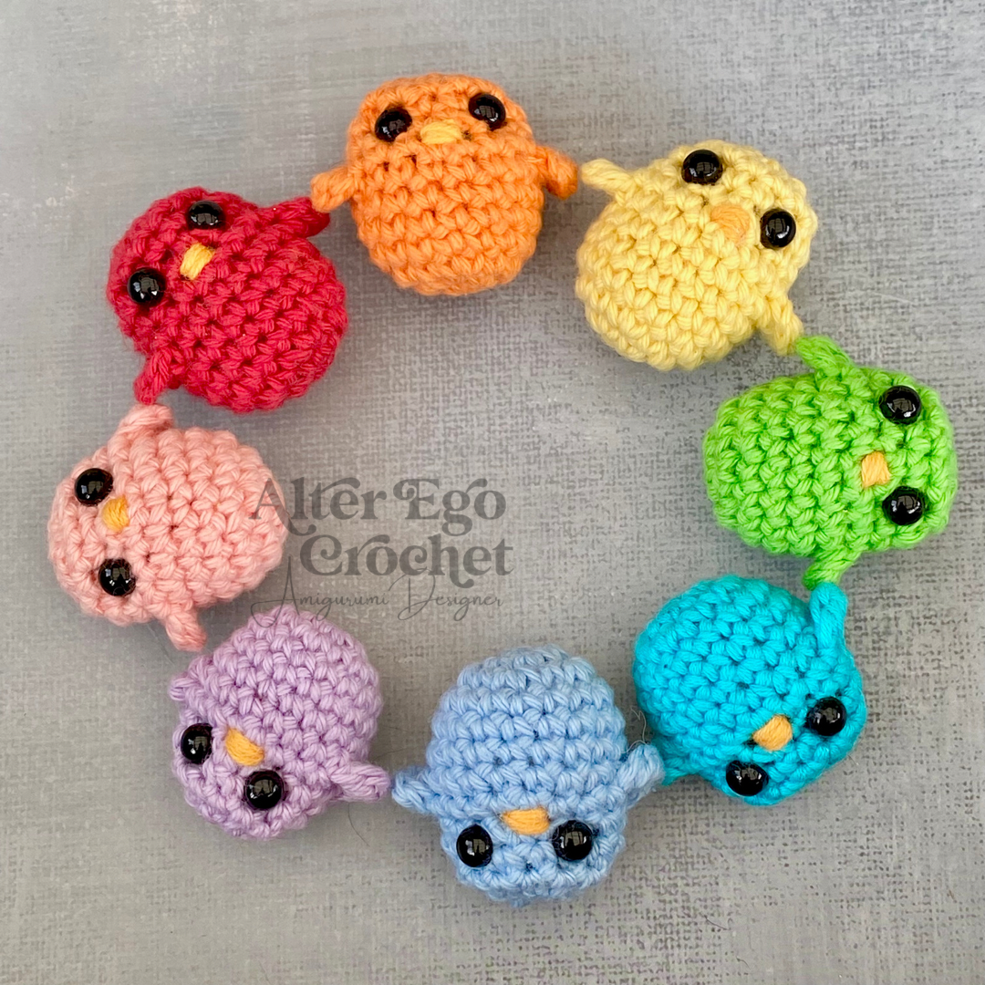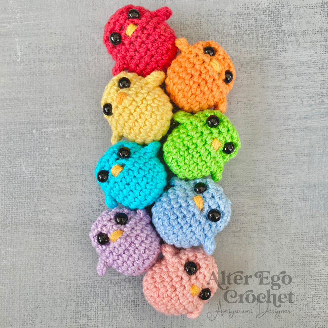 Den store kylling bliver 8 cm. Og de små bliver 3 cm hvis du bruger samme garn og hæklenål som mig. Du kan sagtens bruge en anden nål og andet garn, hvis de skal være større eller mindre.