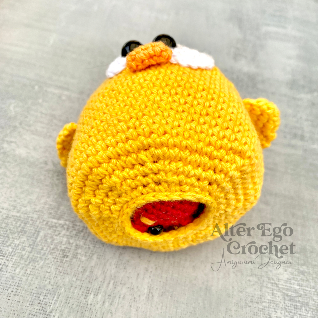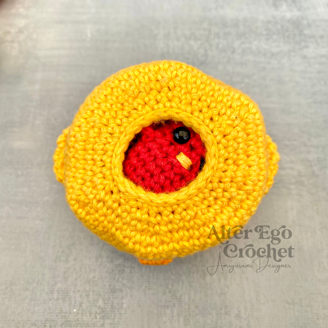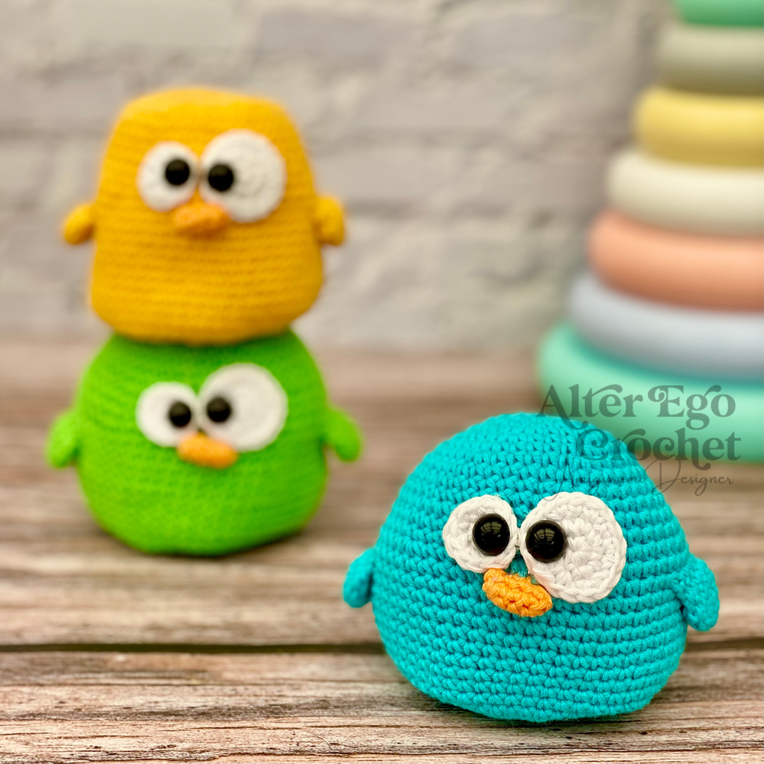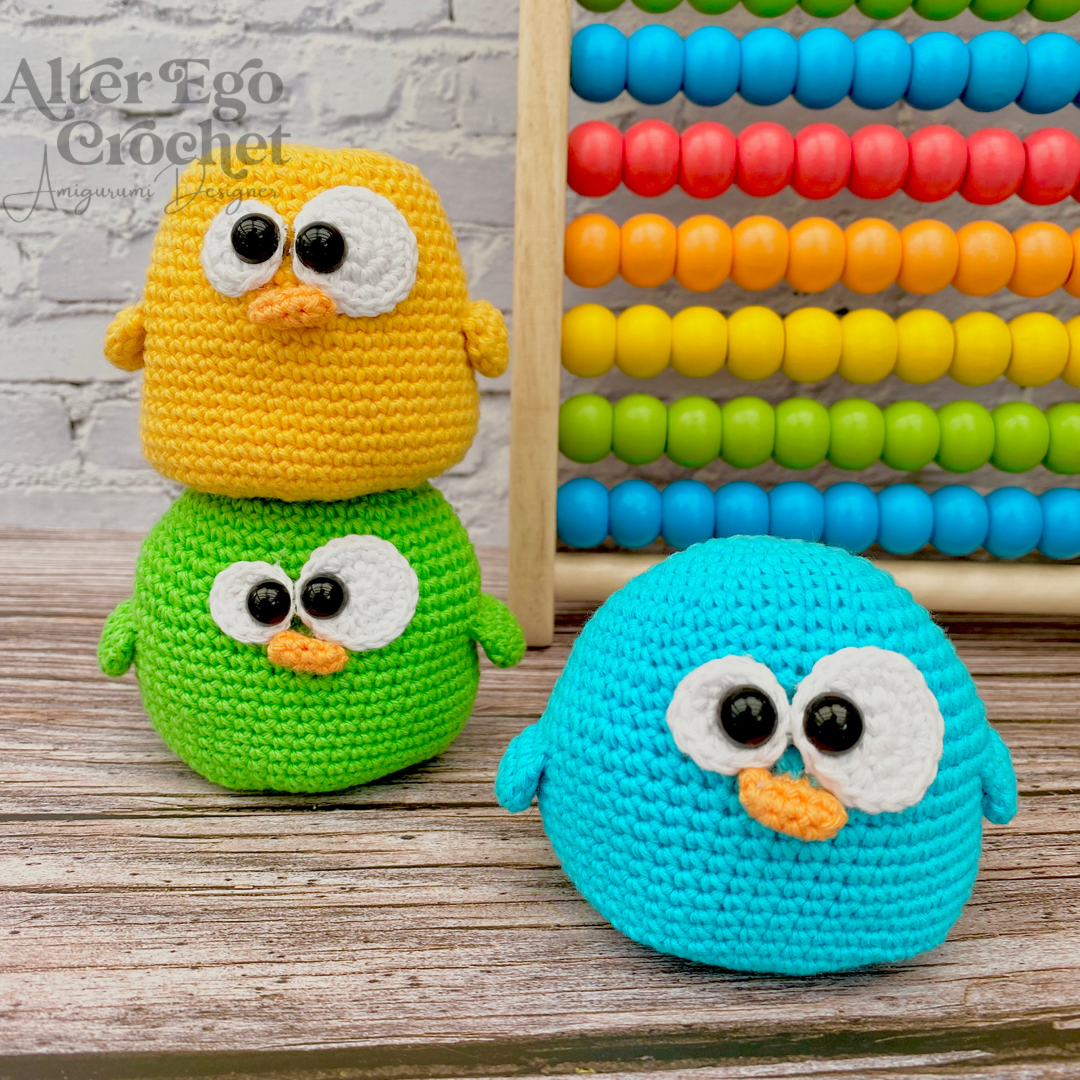 Den store kylling bliver 8 cm. Og de små bliver 3 cm hvis du bruger samme garn og hæklenål som mig. Du kan sagtens bruge en anden nål og andet garn, hvis de skal være større eller mindre.