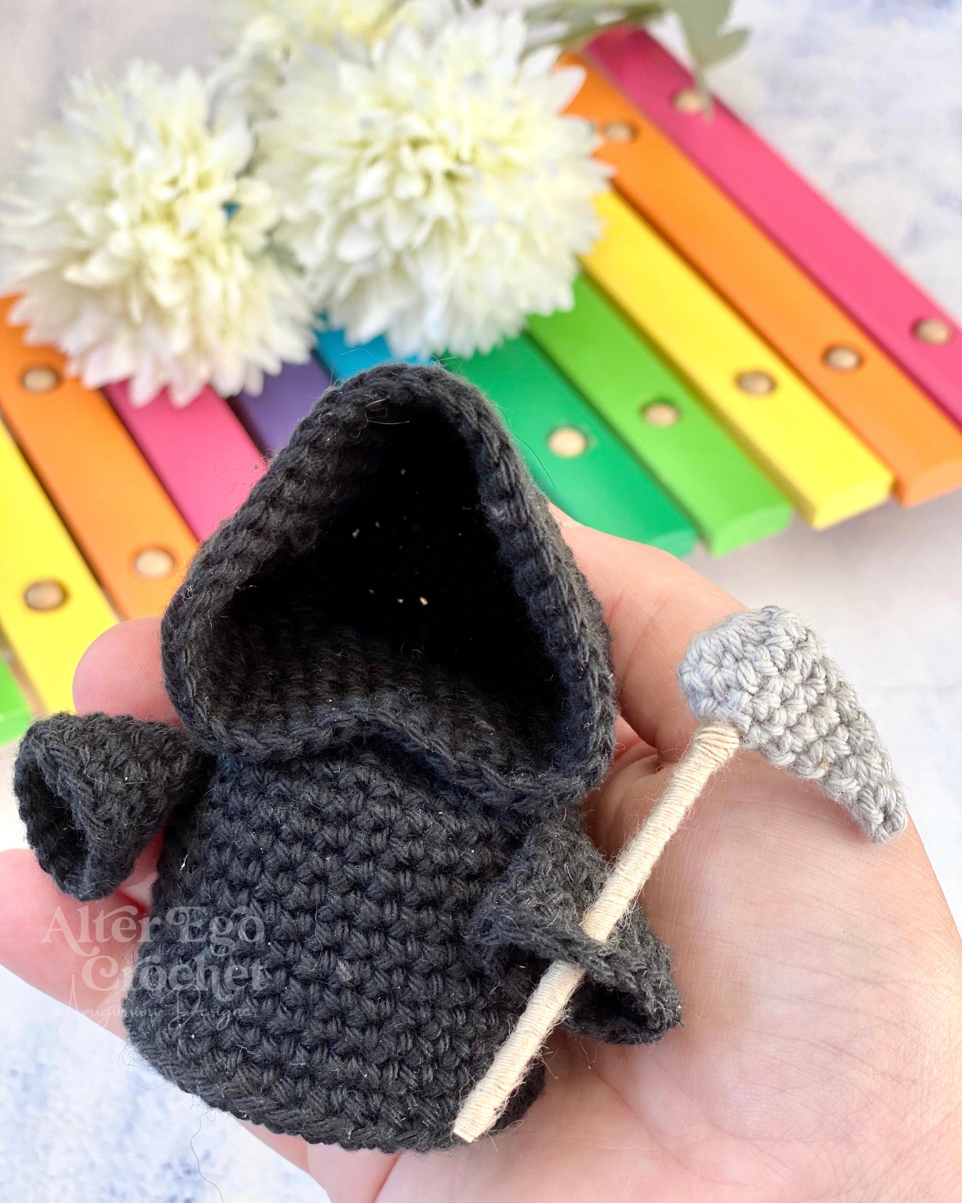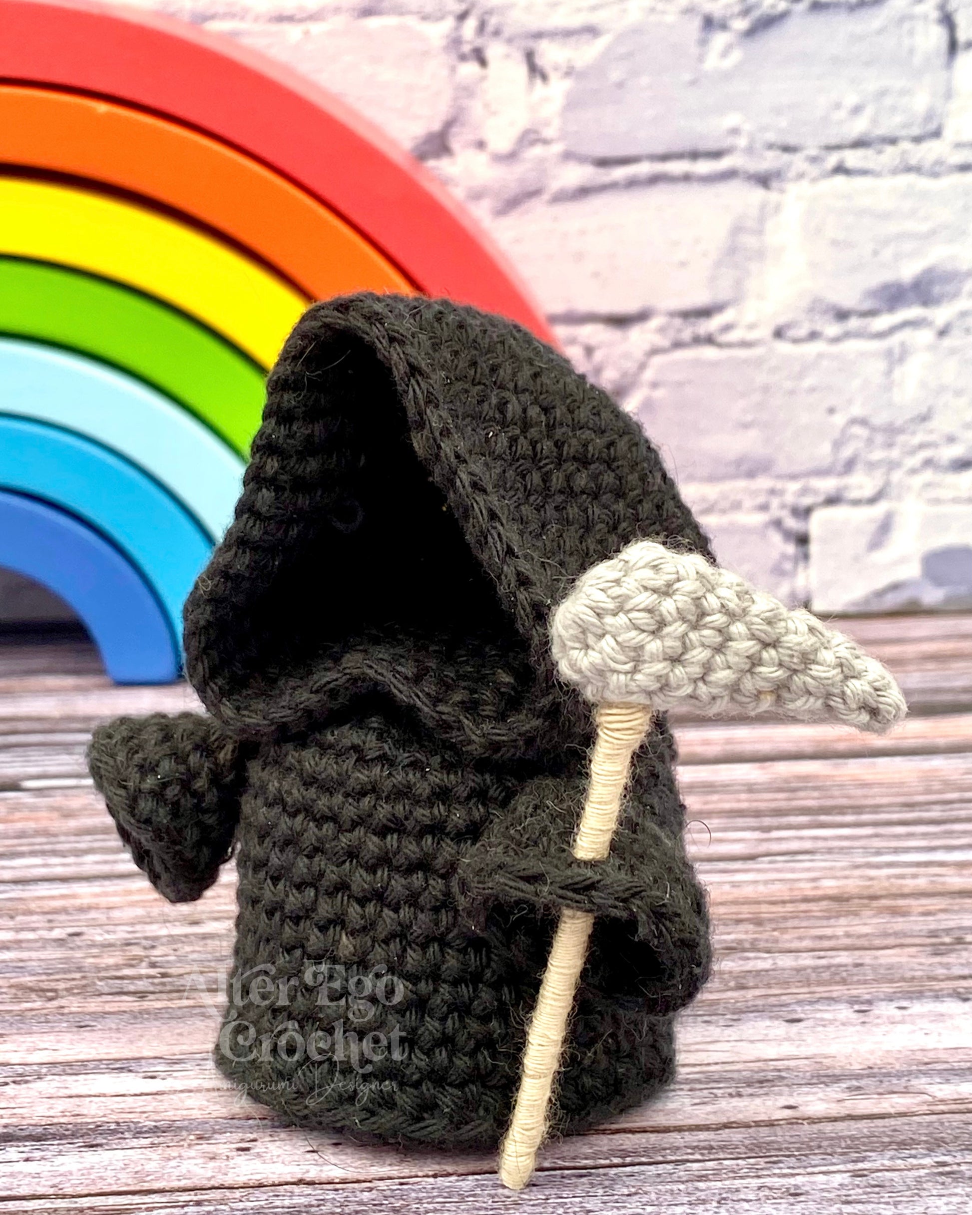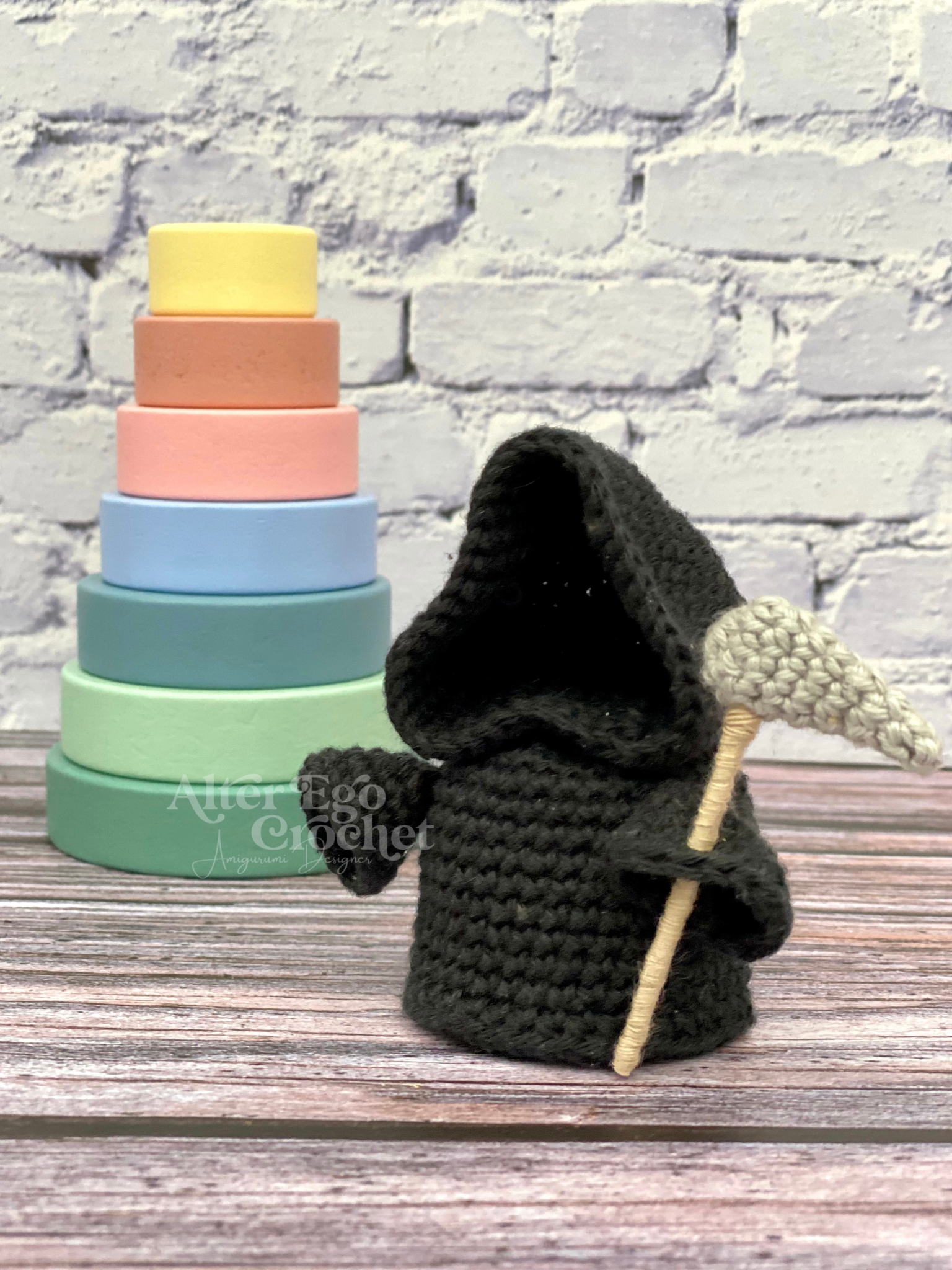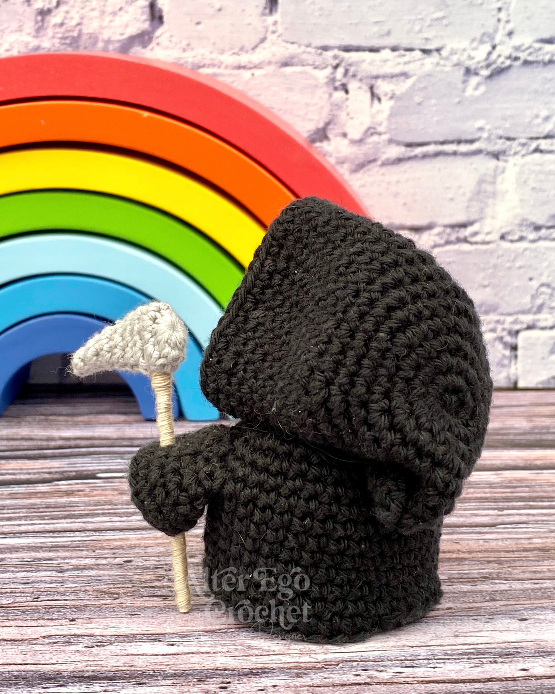 Manden med Leen bliver 8 cm. hvis du bruger samme garn og hæklenål som mig. Du kan sagtens bruge en anden nål og andet garn, hvis han skal være større eller mindre.