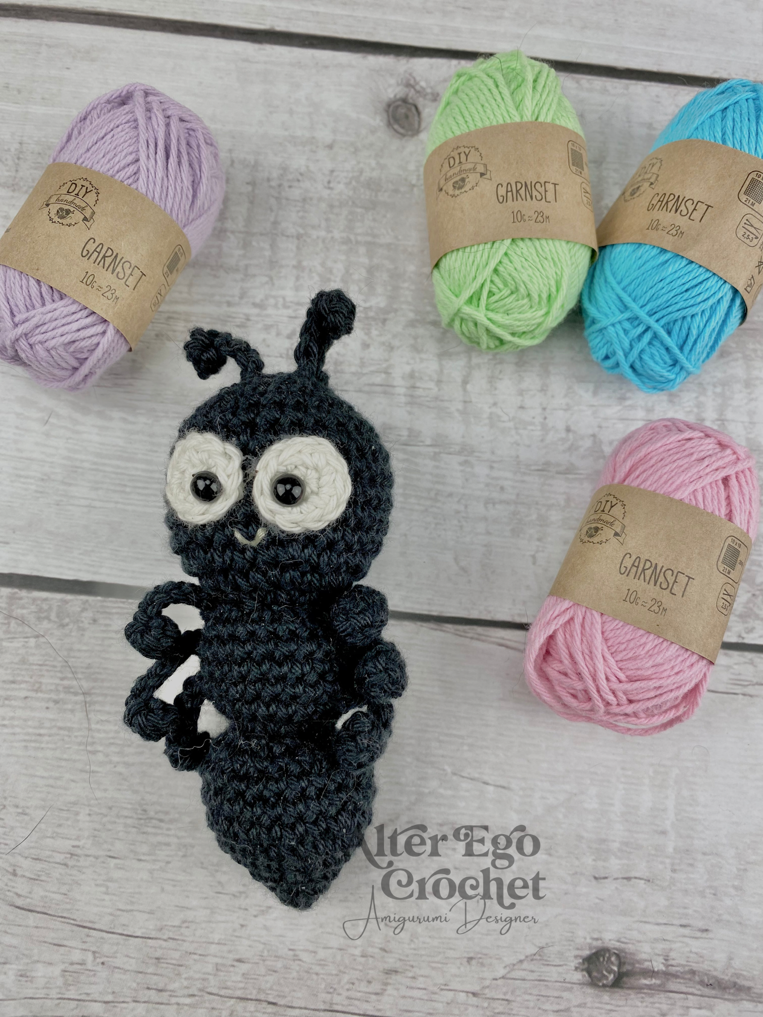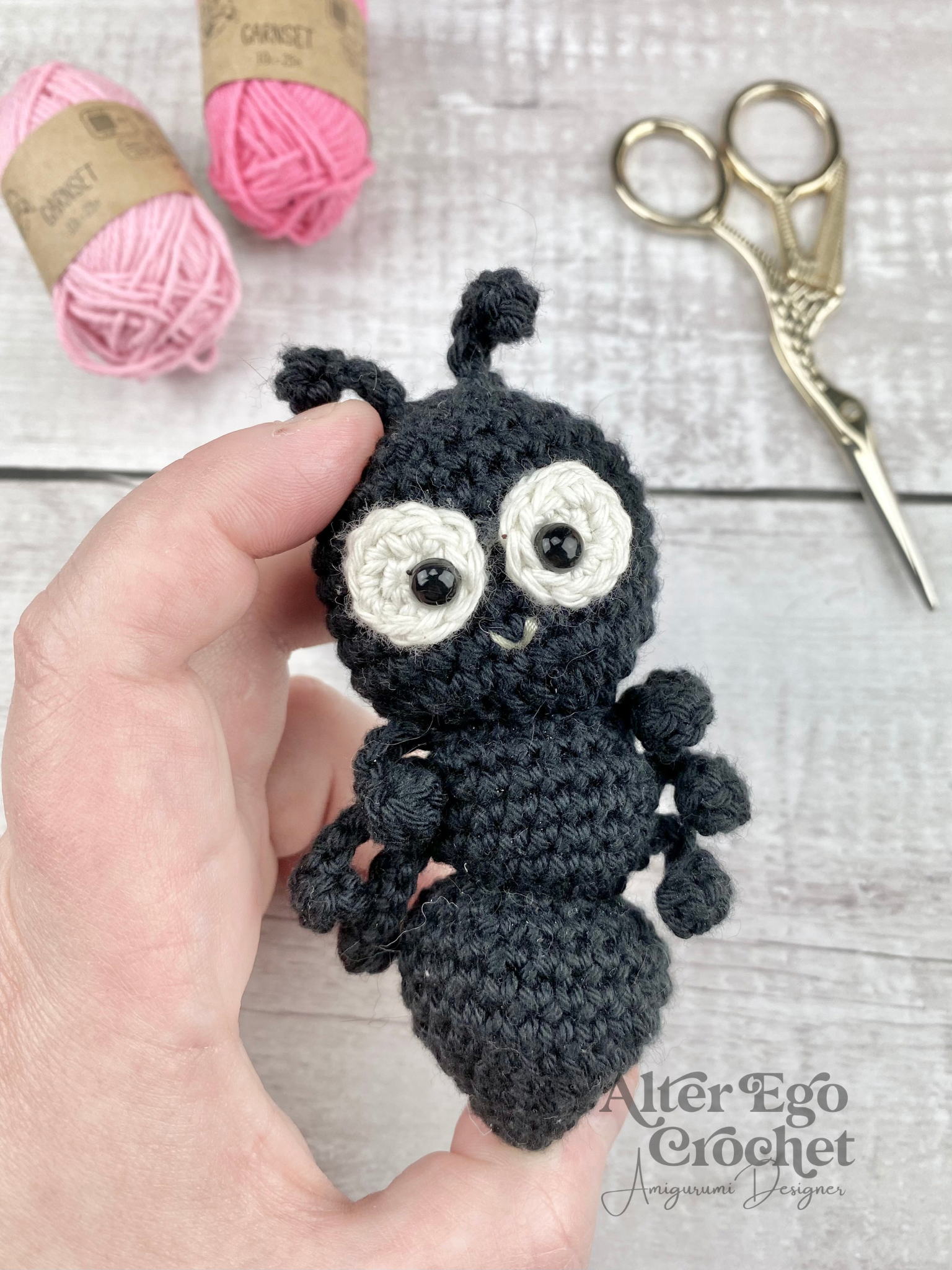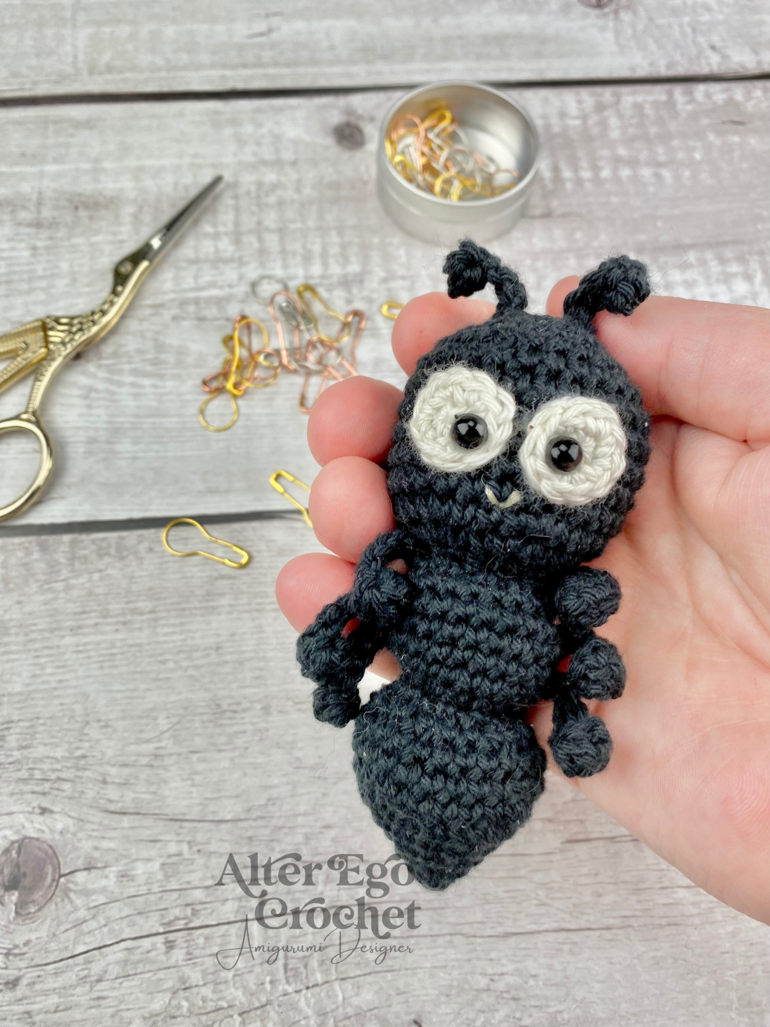 Antonio bliver 11 cm. hvis du bruger samme garn og hæklenål som mig. Du kan sagtens bruge en anden nål og andet garn, hvis han skal være større eller mindre.