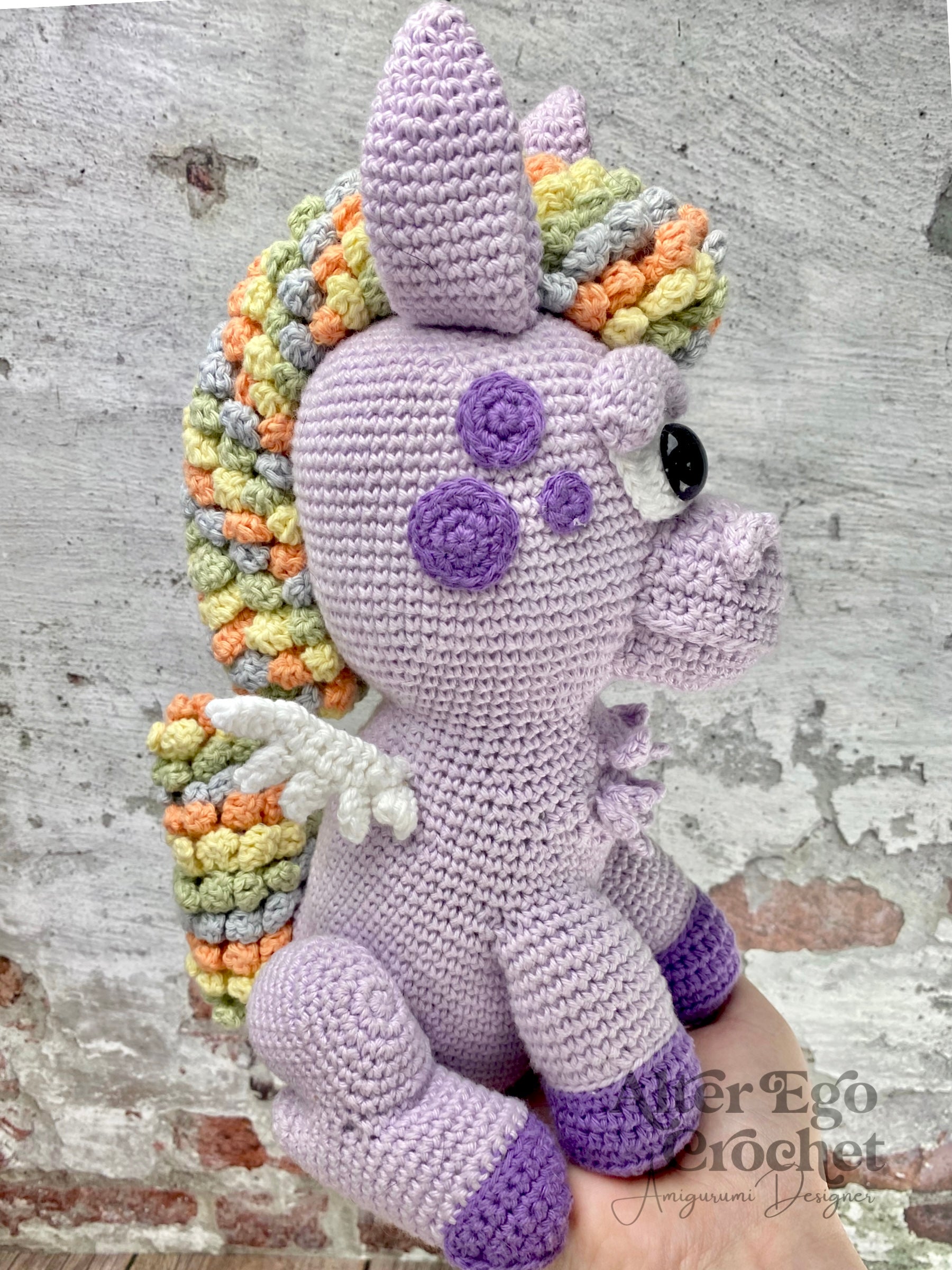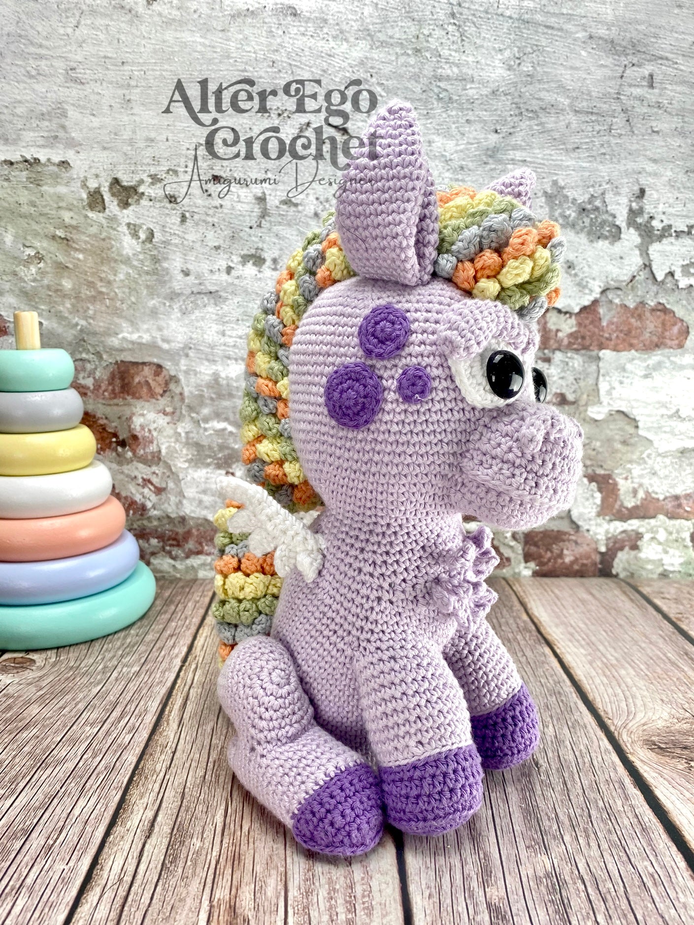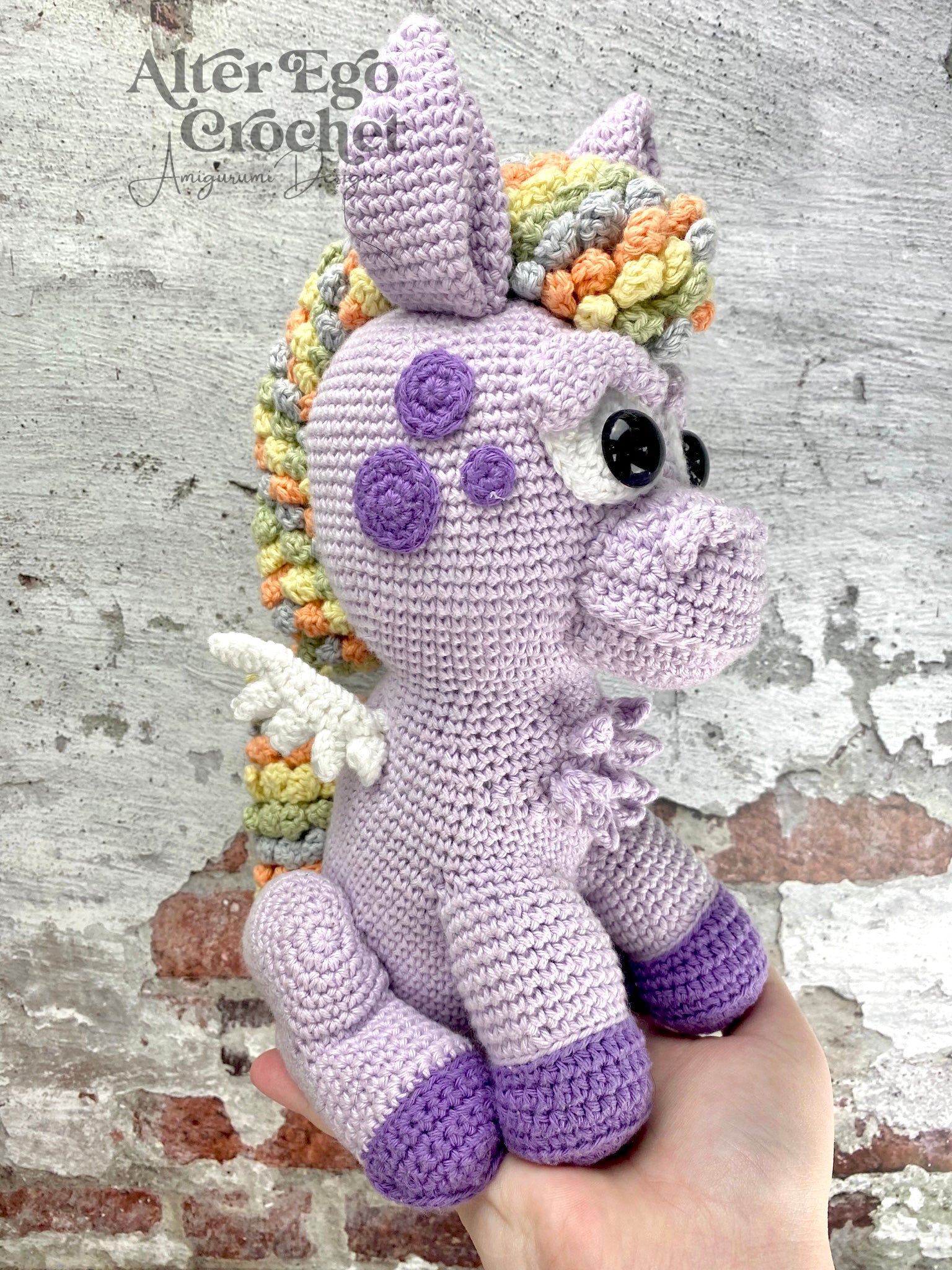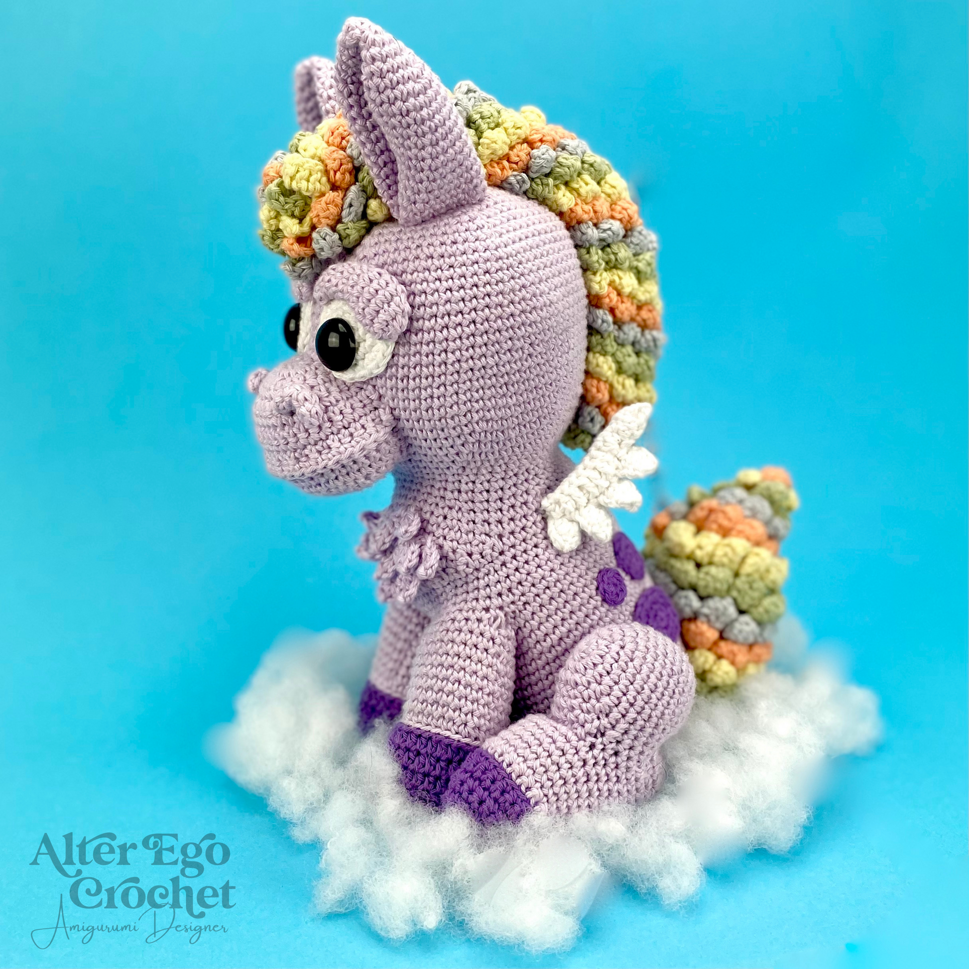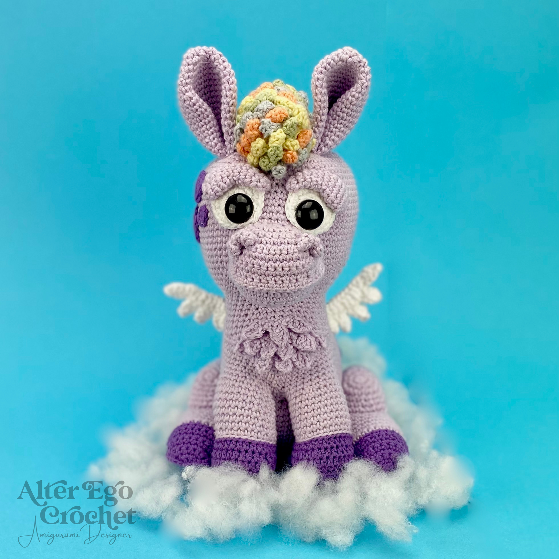 Pegasus bliver 27 cm. hvis du bruger samme garn og hæklenål som mig. Du kan sagtens bruge en anden nål og andet garn, hvis han skal være større eller mindre.