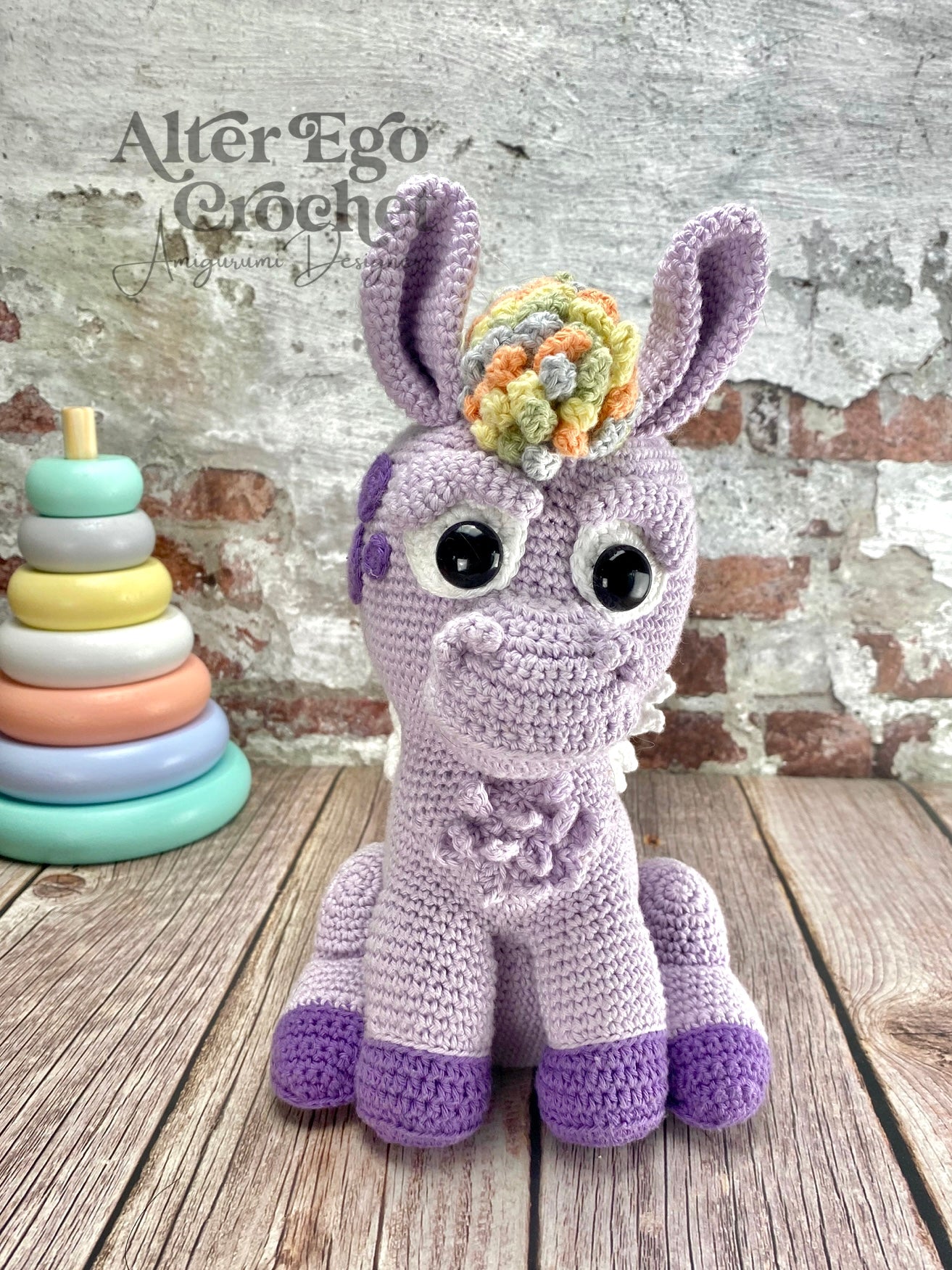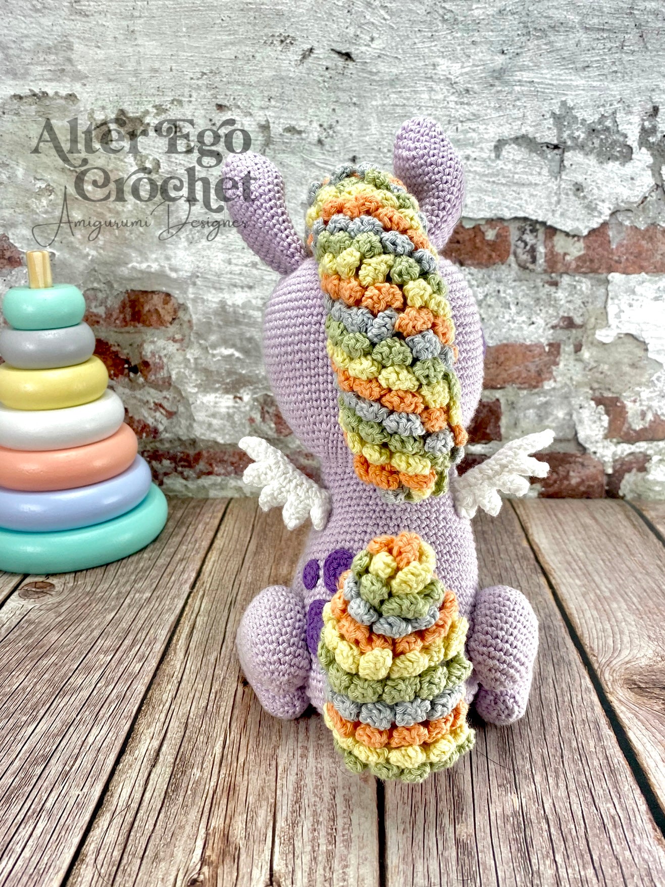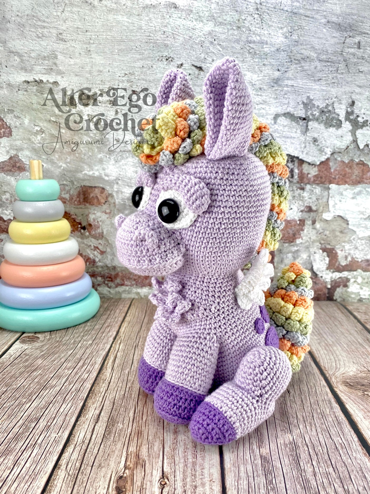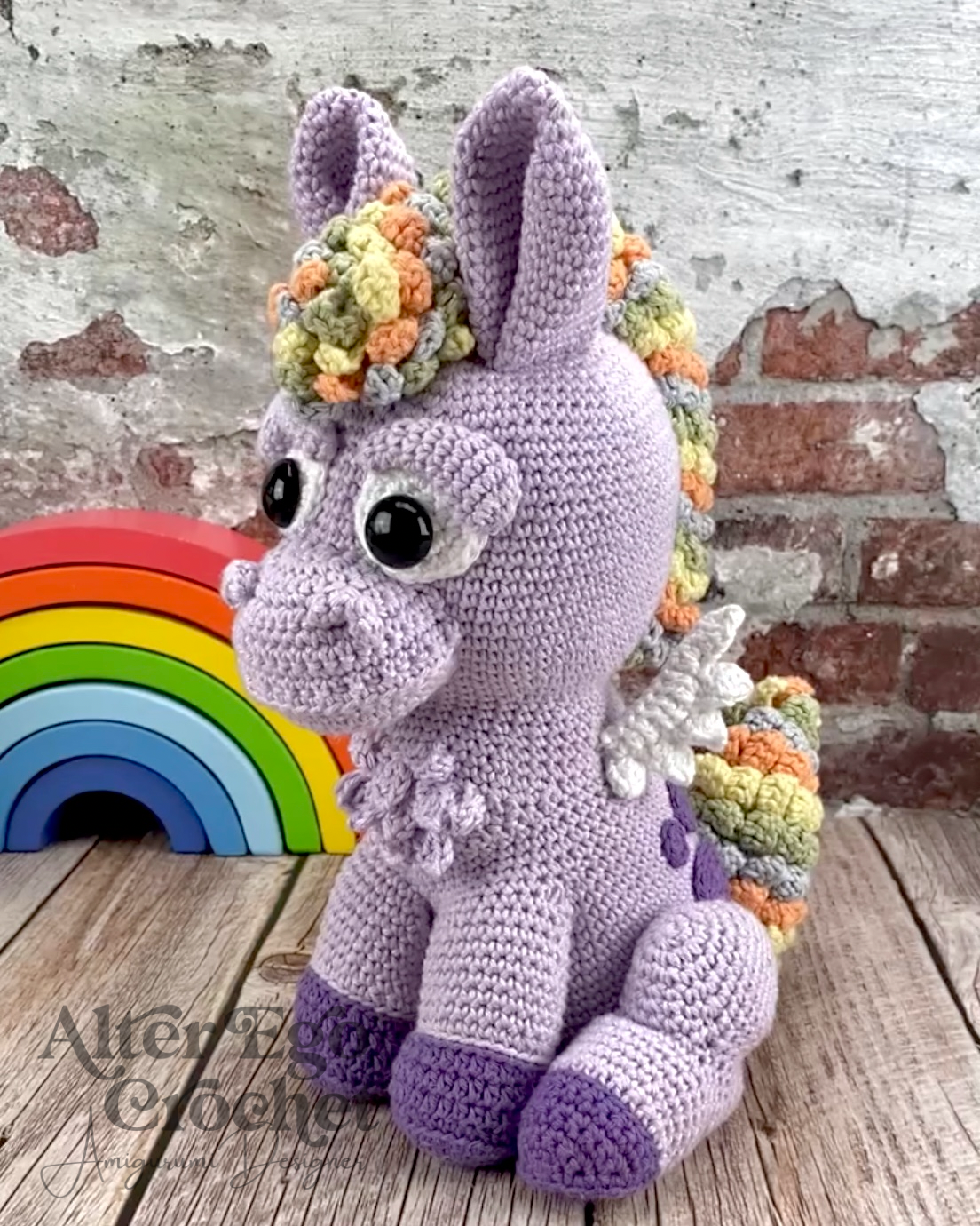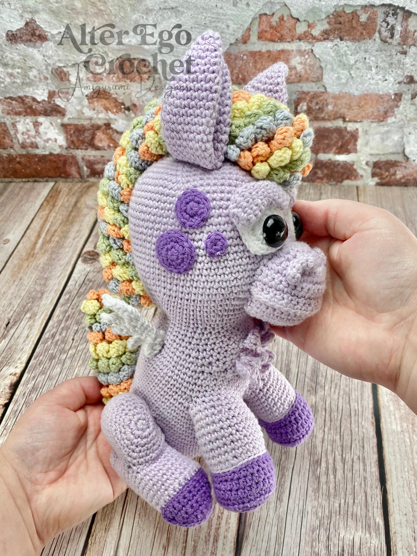 Pegasus bliver 27 cm. hvis du bruger samme garn og hæklenål som mig. Du kan sagtens bruge en anden nål og andet garn, hvis han skal være større eller mindre.