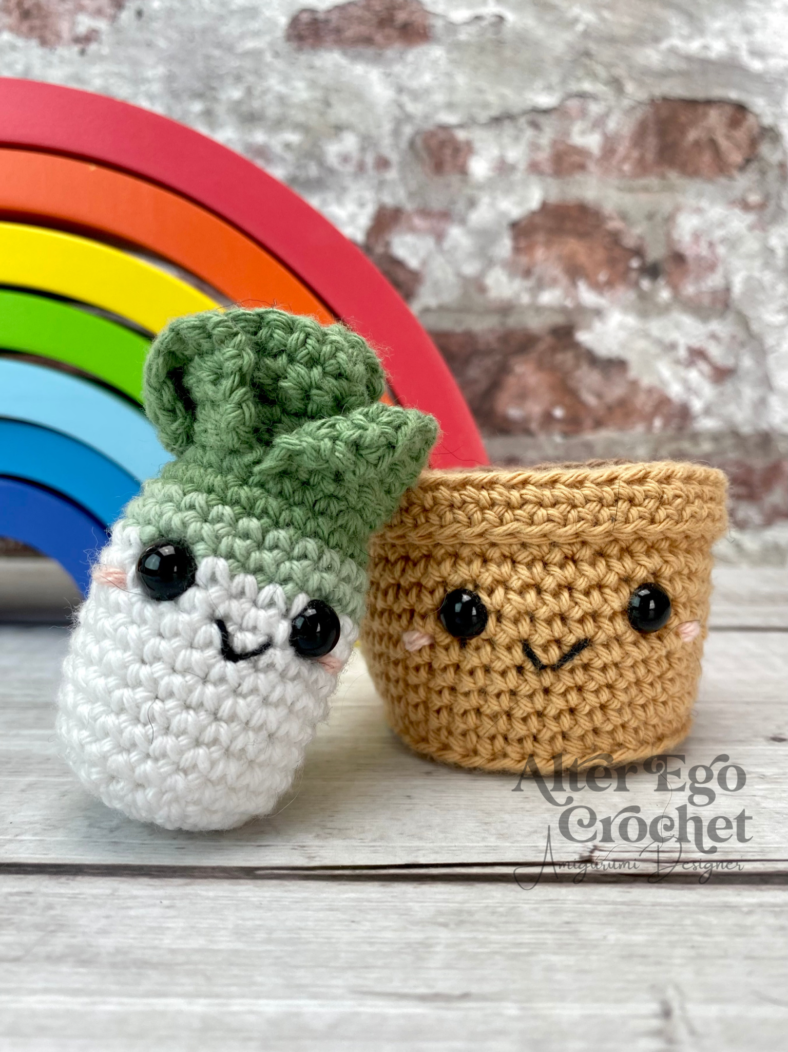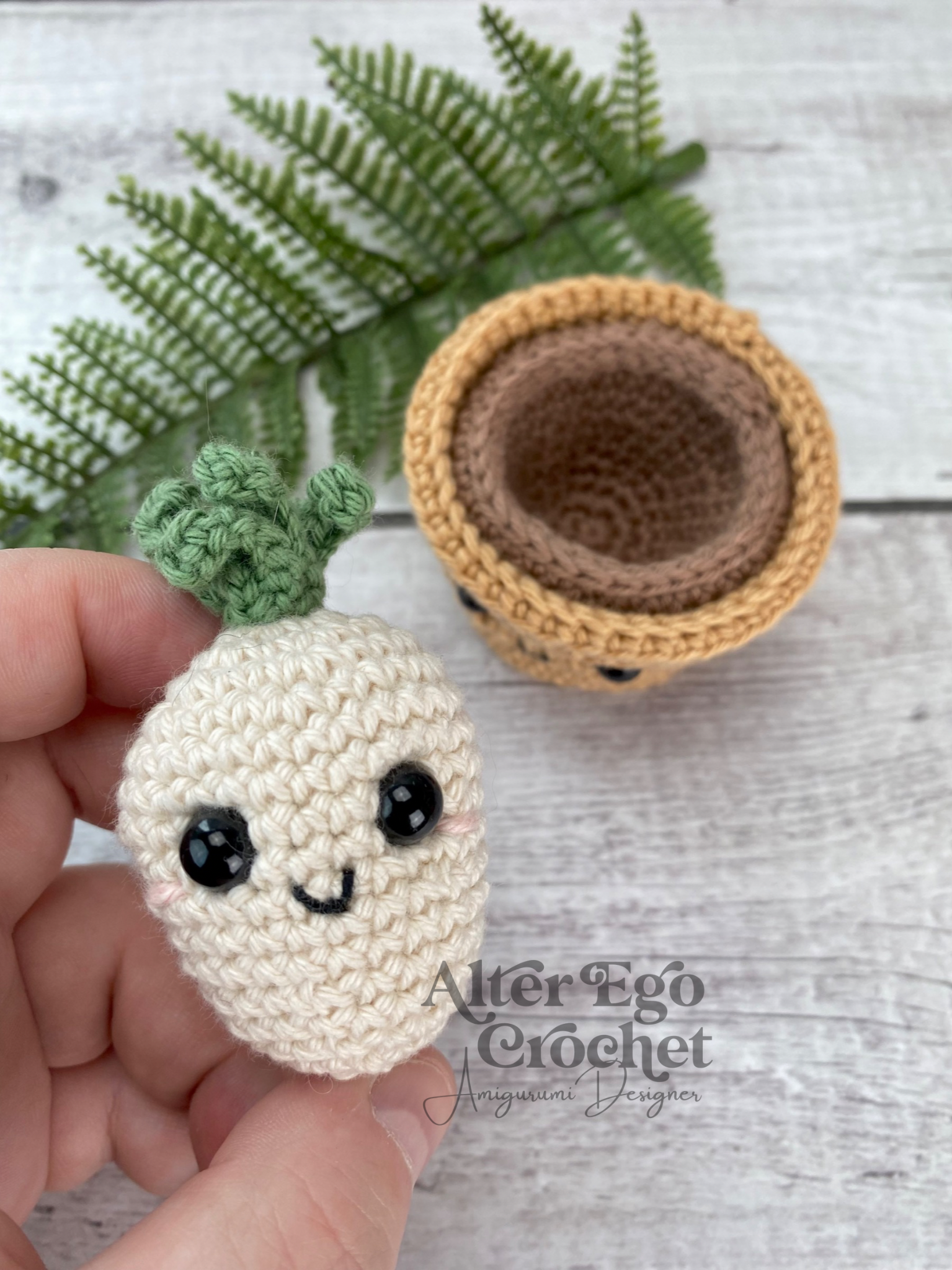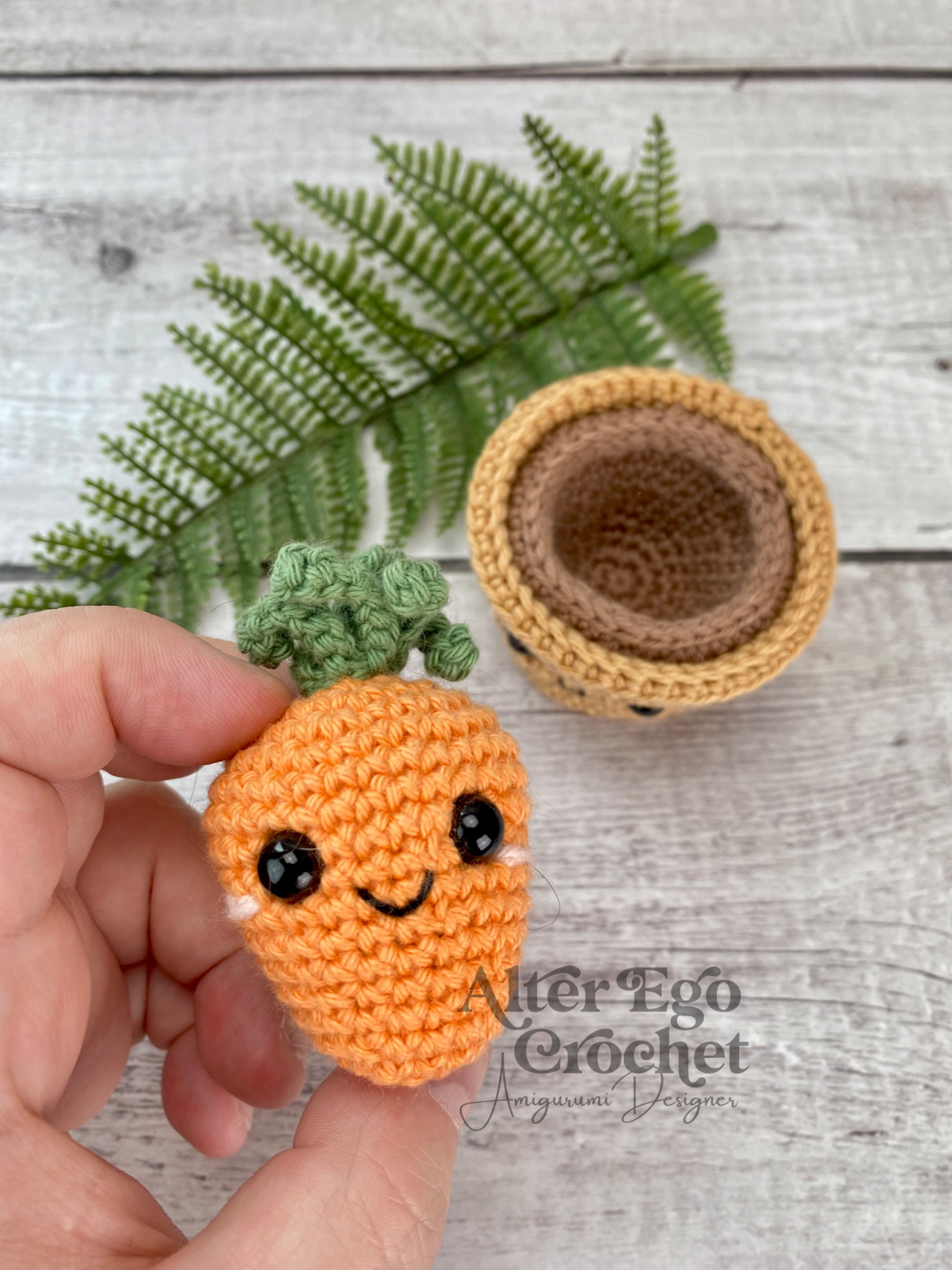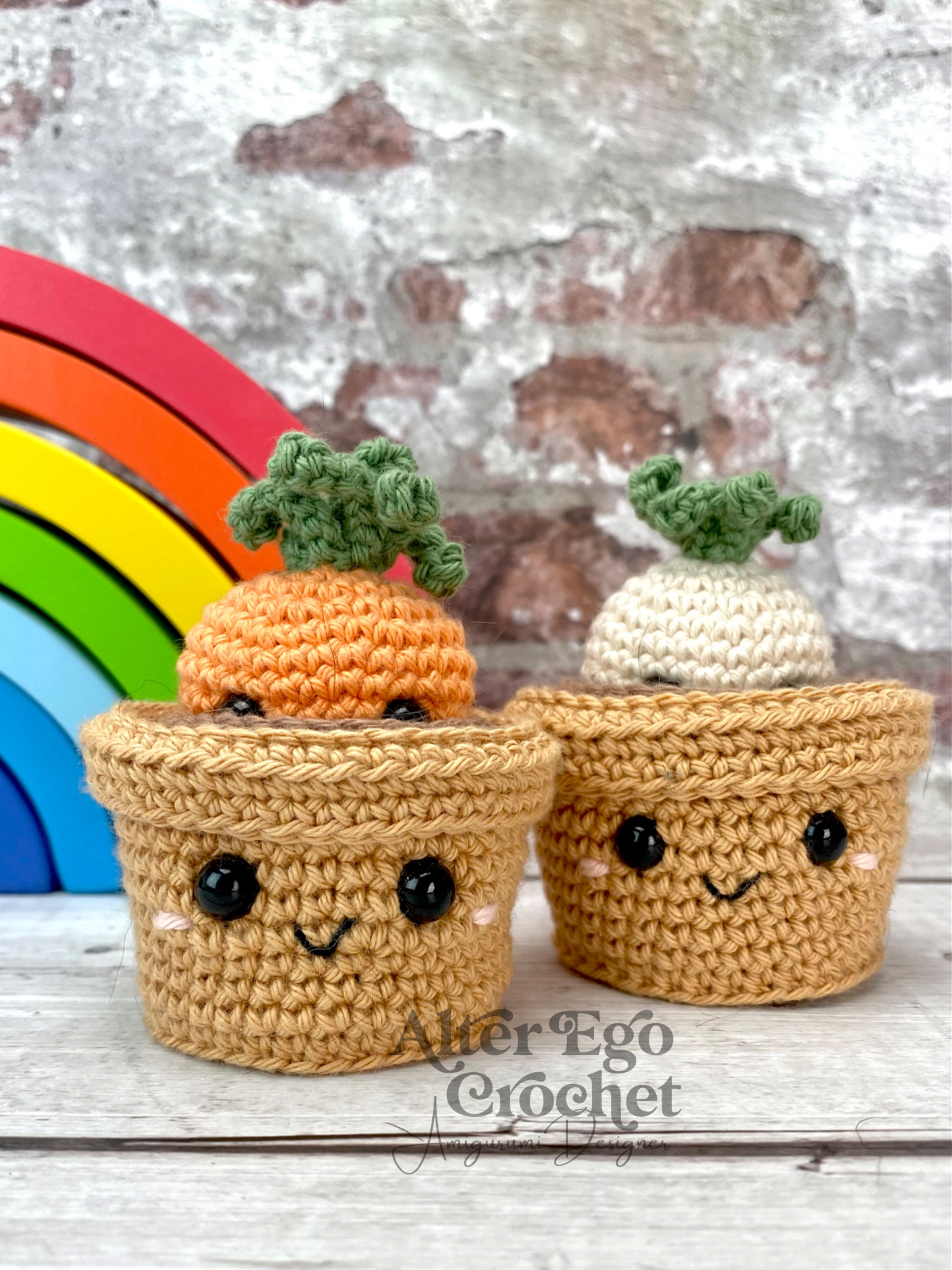 Grøntsagerne i potterne bliver omkring 8-9 cm, hvis du bruger samme garn og hæklenål som mig. Du kan sagtens bruge en anden nål og andet garn, hvis han skal være større eller mindre.