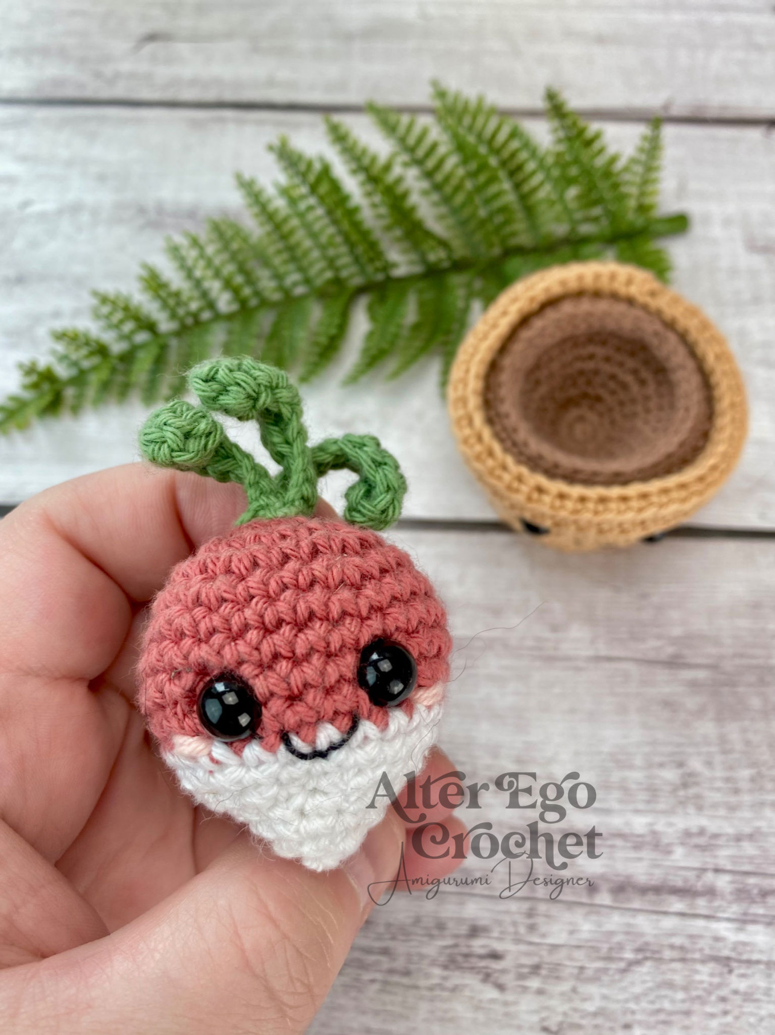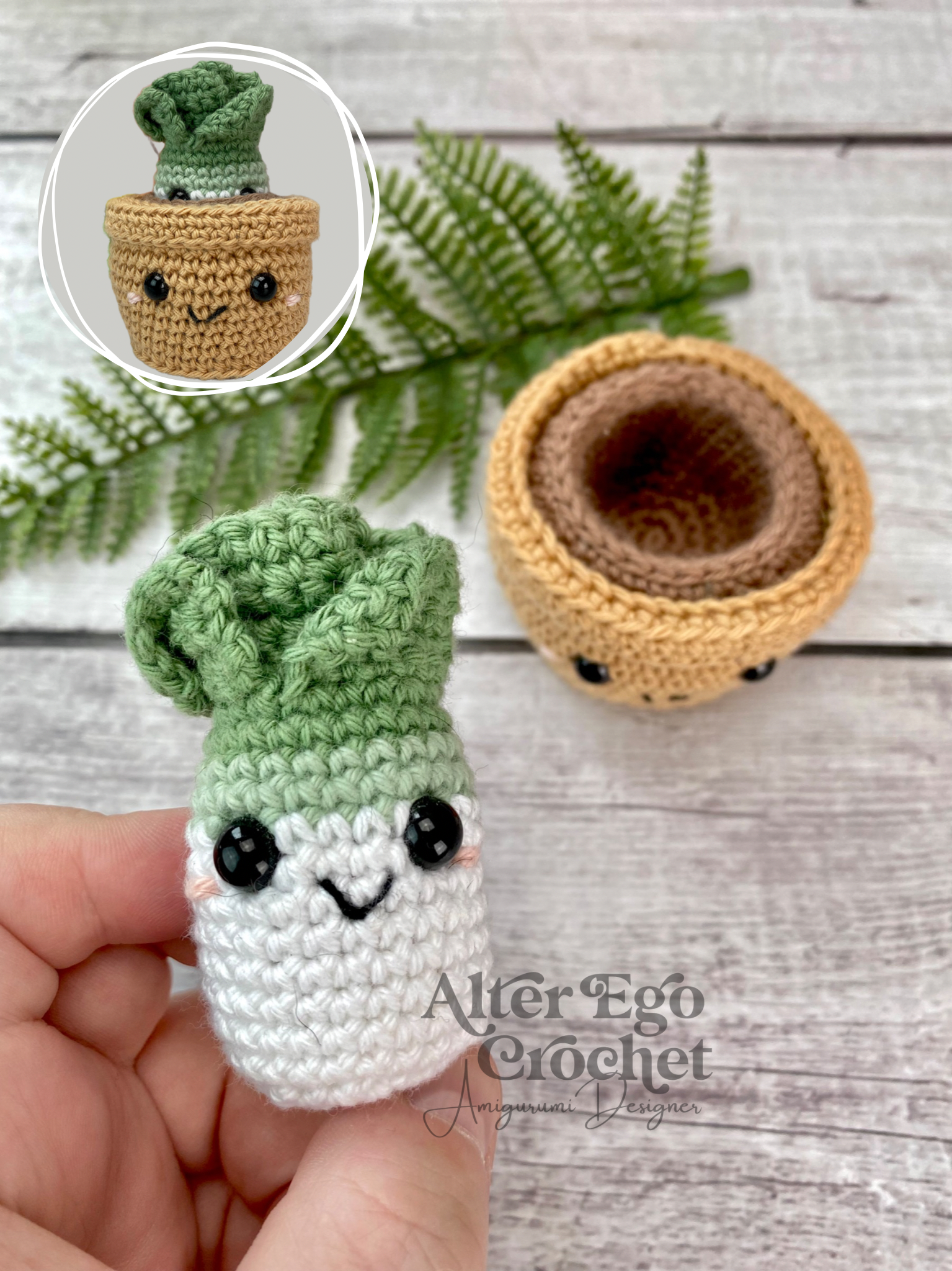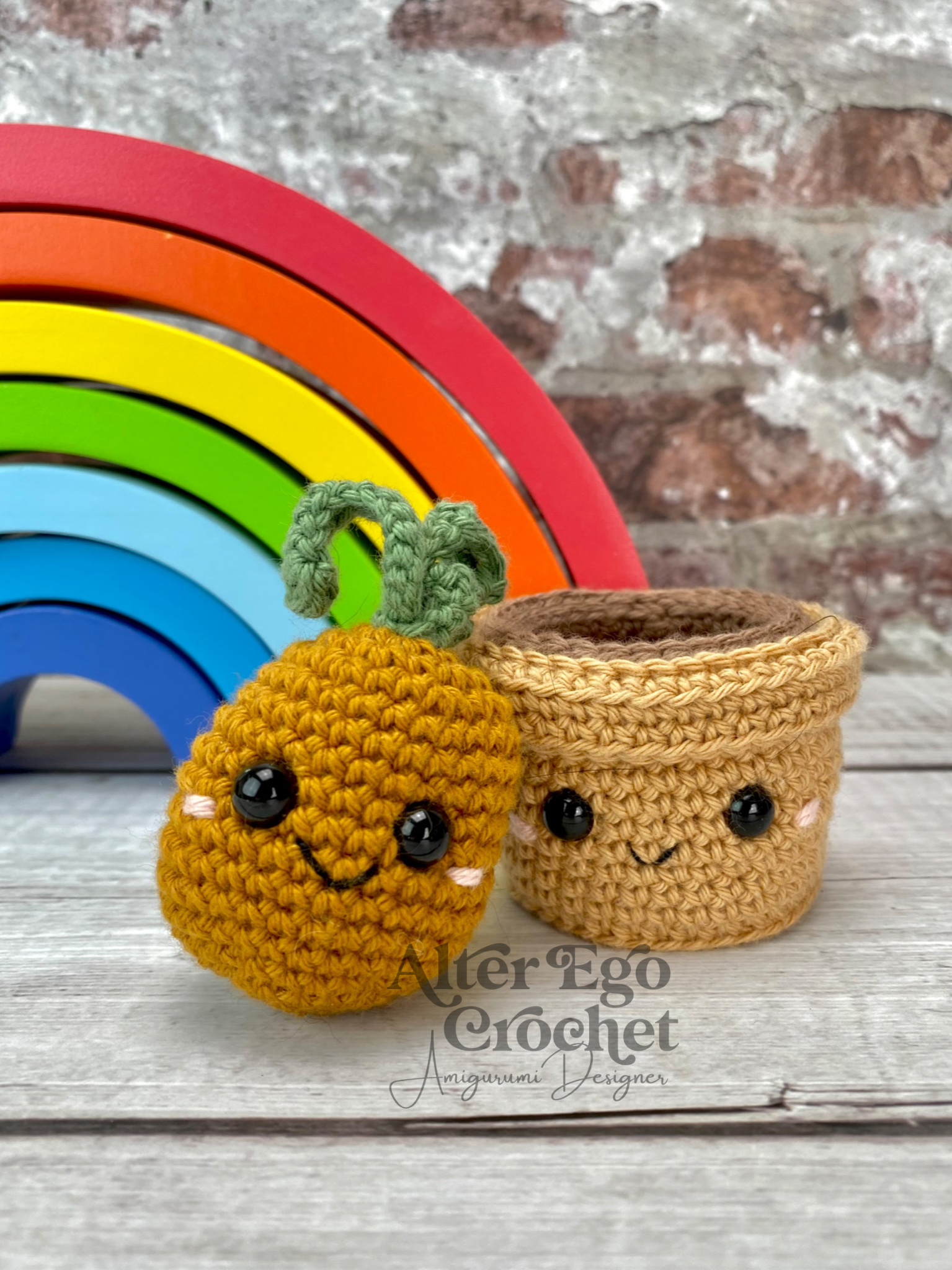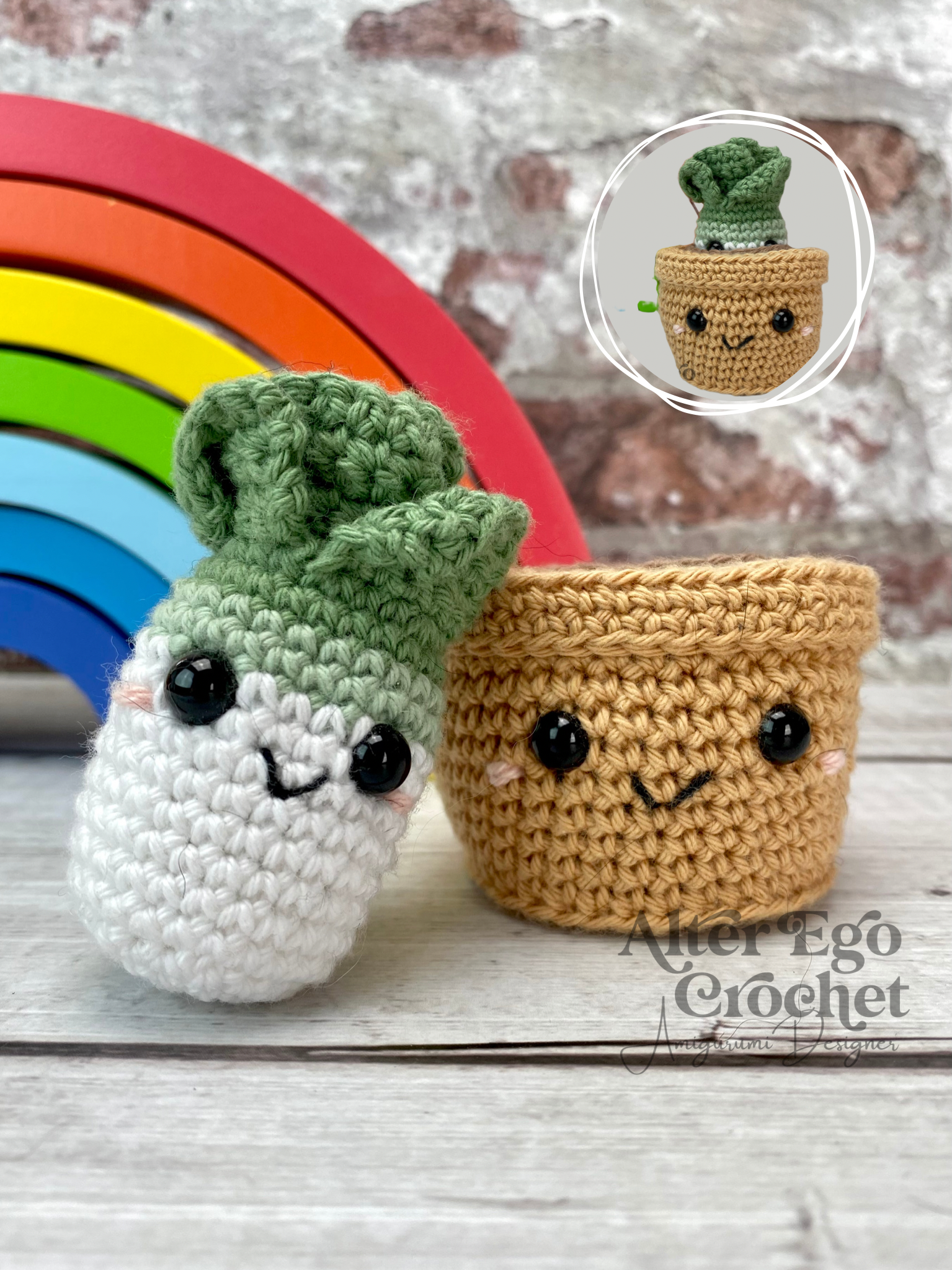 Grøntsagerne i potterne bliver omkring 8-9 cm, hvis du bruger samme garn og hæklenål som mig. Du kan sagtens bruge en anden nål og andet garn, hvis han skal være større eller mindre.