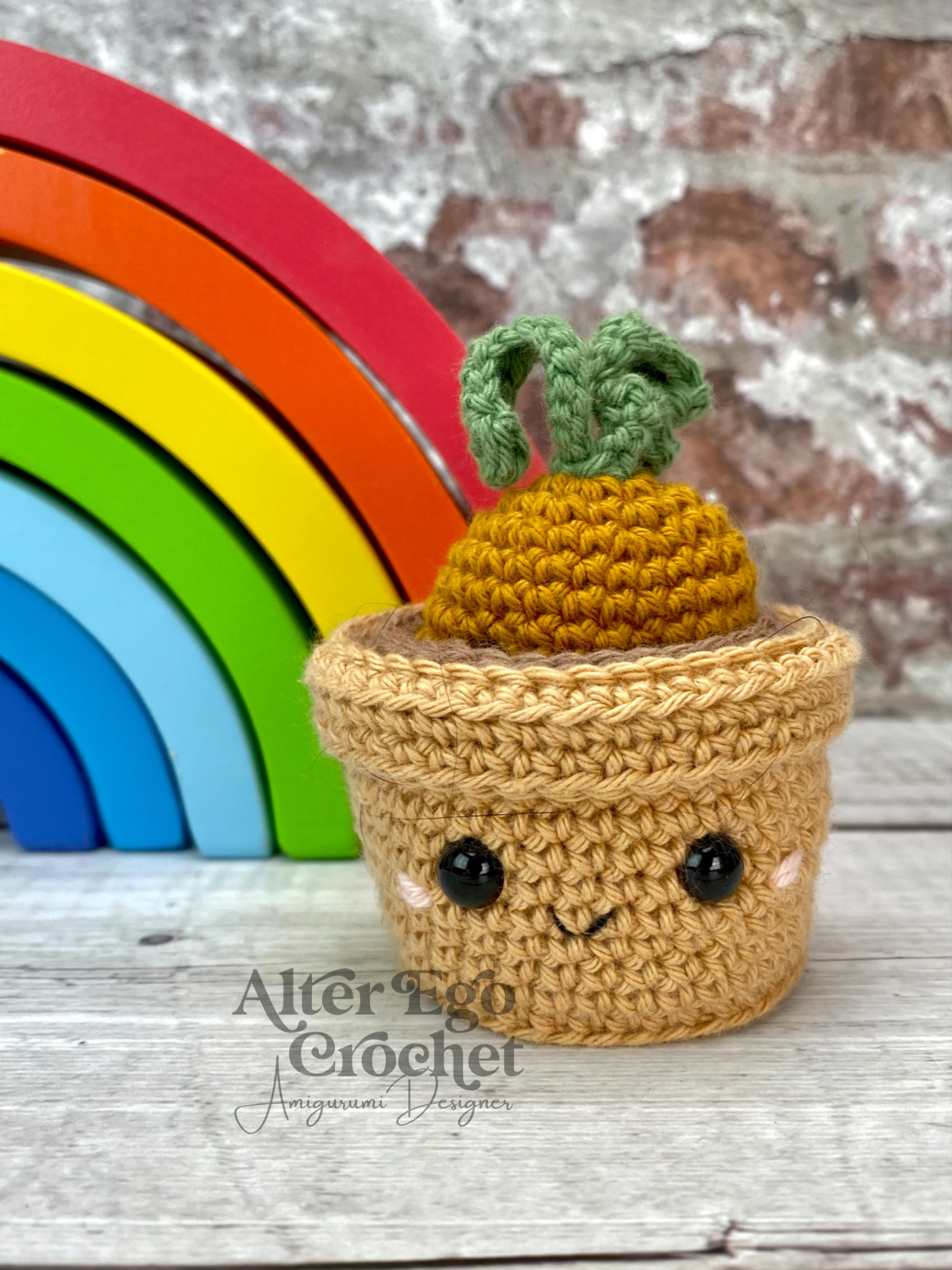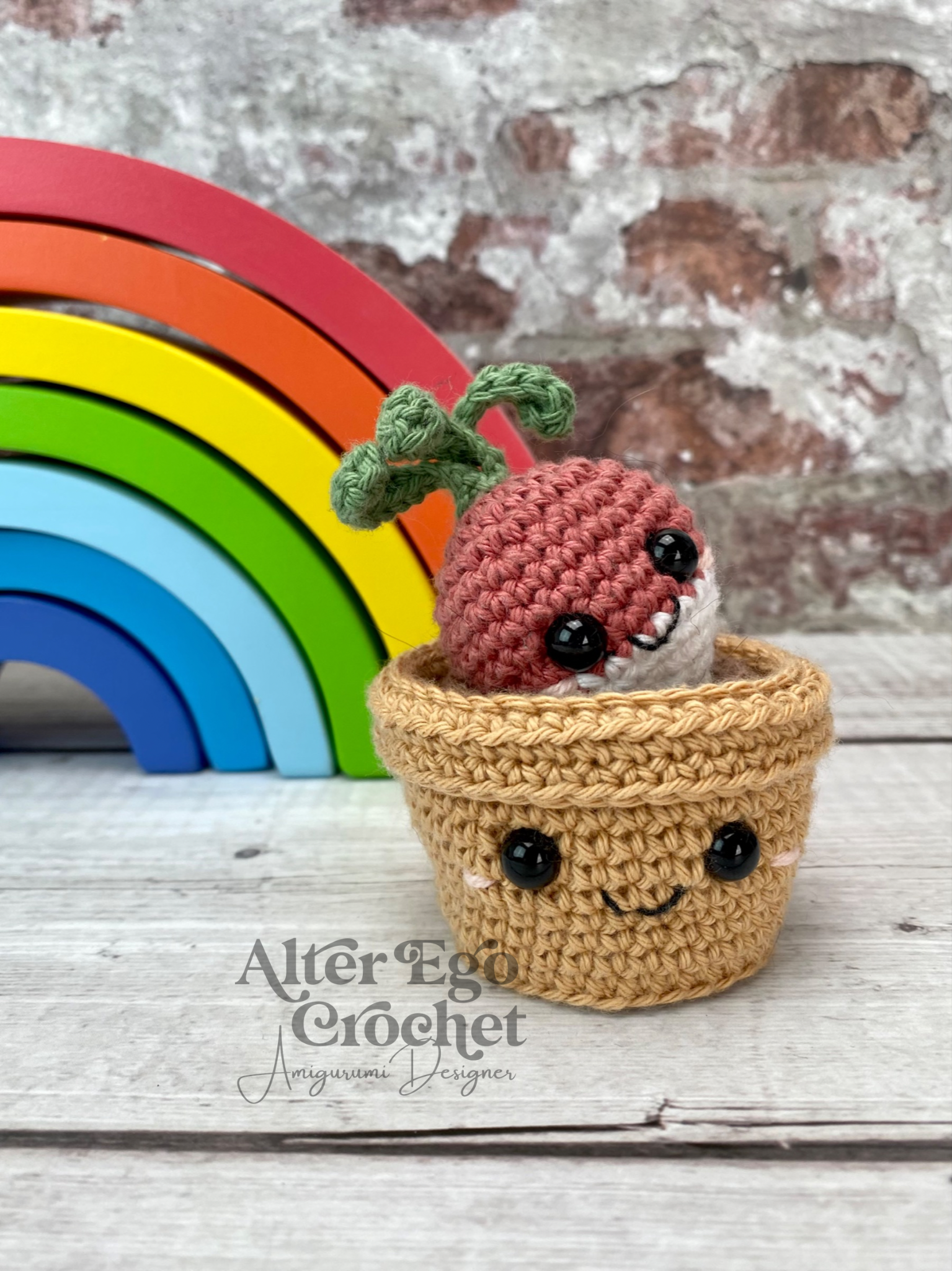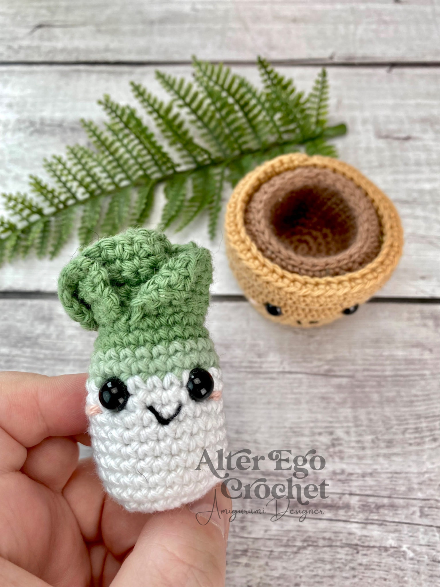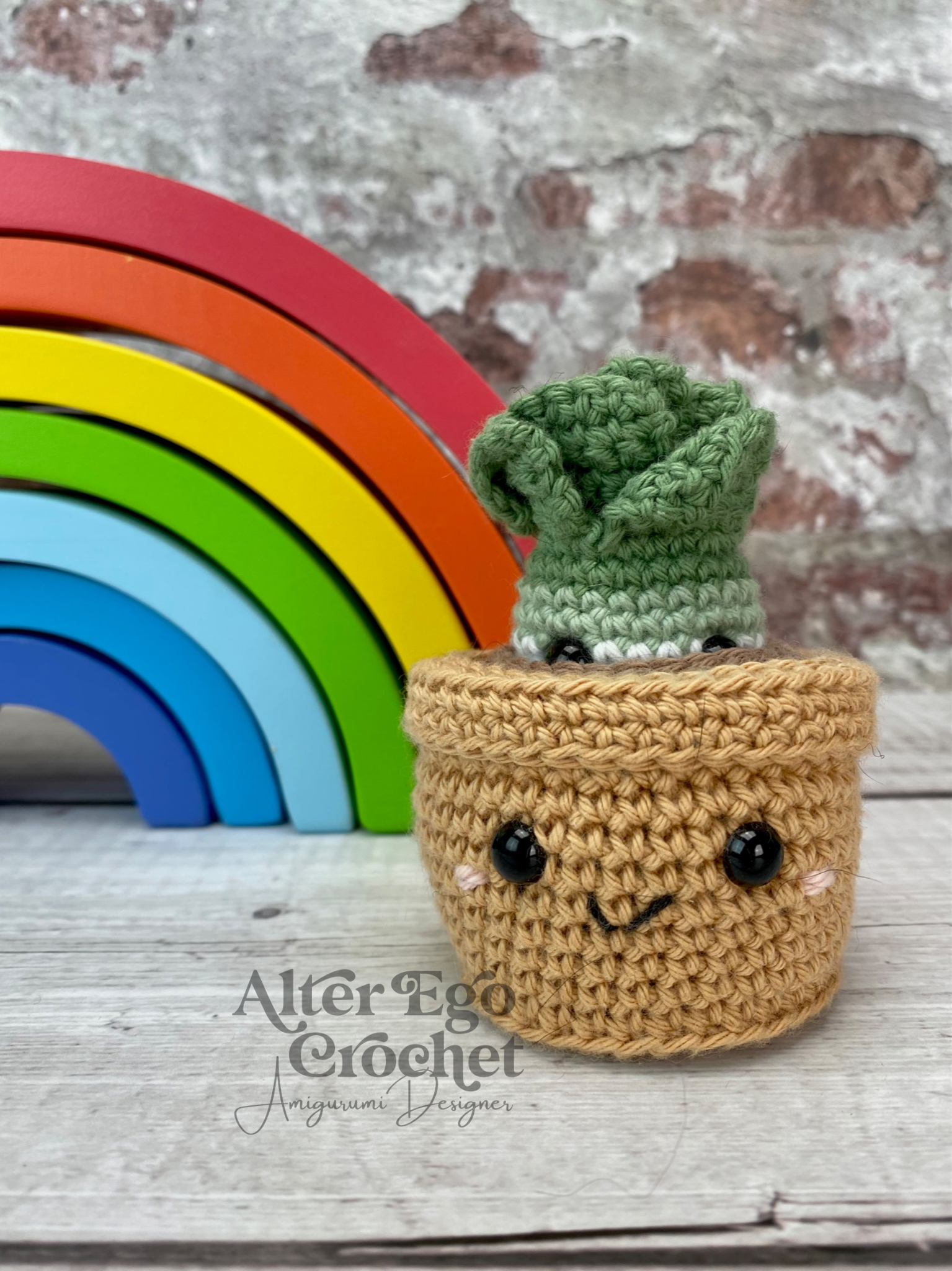 Grøntsagerne i potterne bliver omkring 8-9 cm, hvis du bruger samme garn og hæklenål som mig. Du kan sagtens bruge en anden nål og andet garn, hvis han skal være større eller mindre.