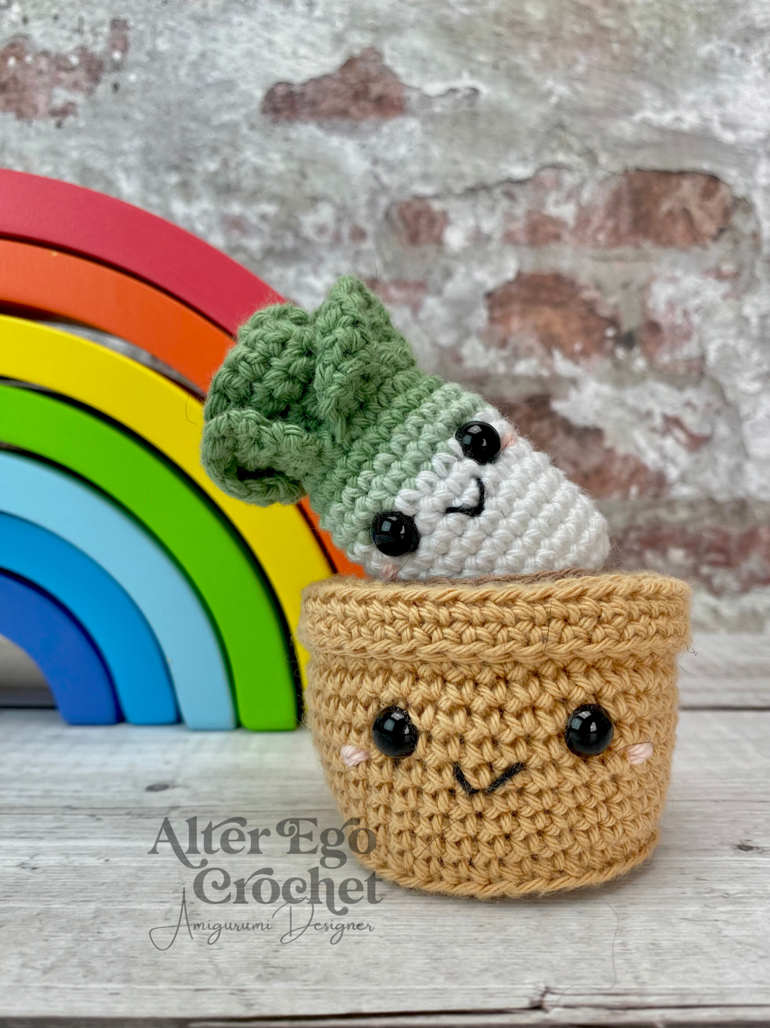 Porre i potte bliver 8,5 cm (porre 7 cm og potte 4 cm) hvis du bruger samme garn og hæklenål som mig. Du kan sagtens bruge en anden nål og andet garn, hvis han skal være større eller mindre.