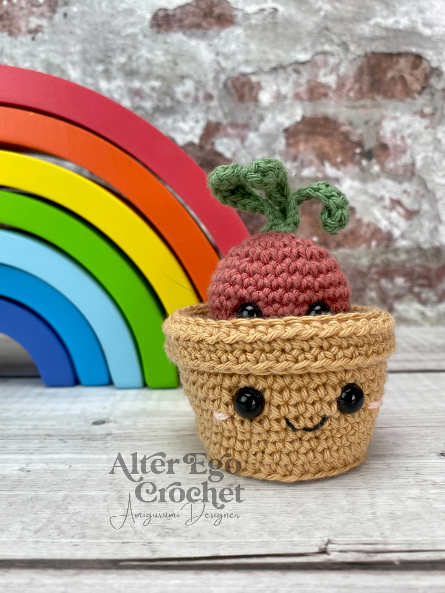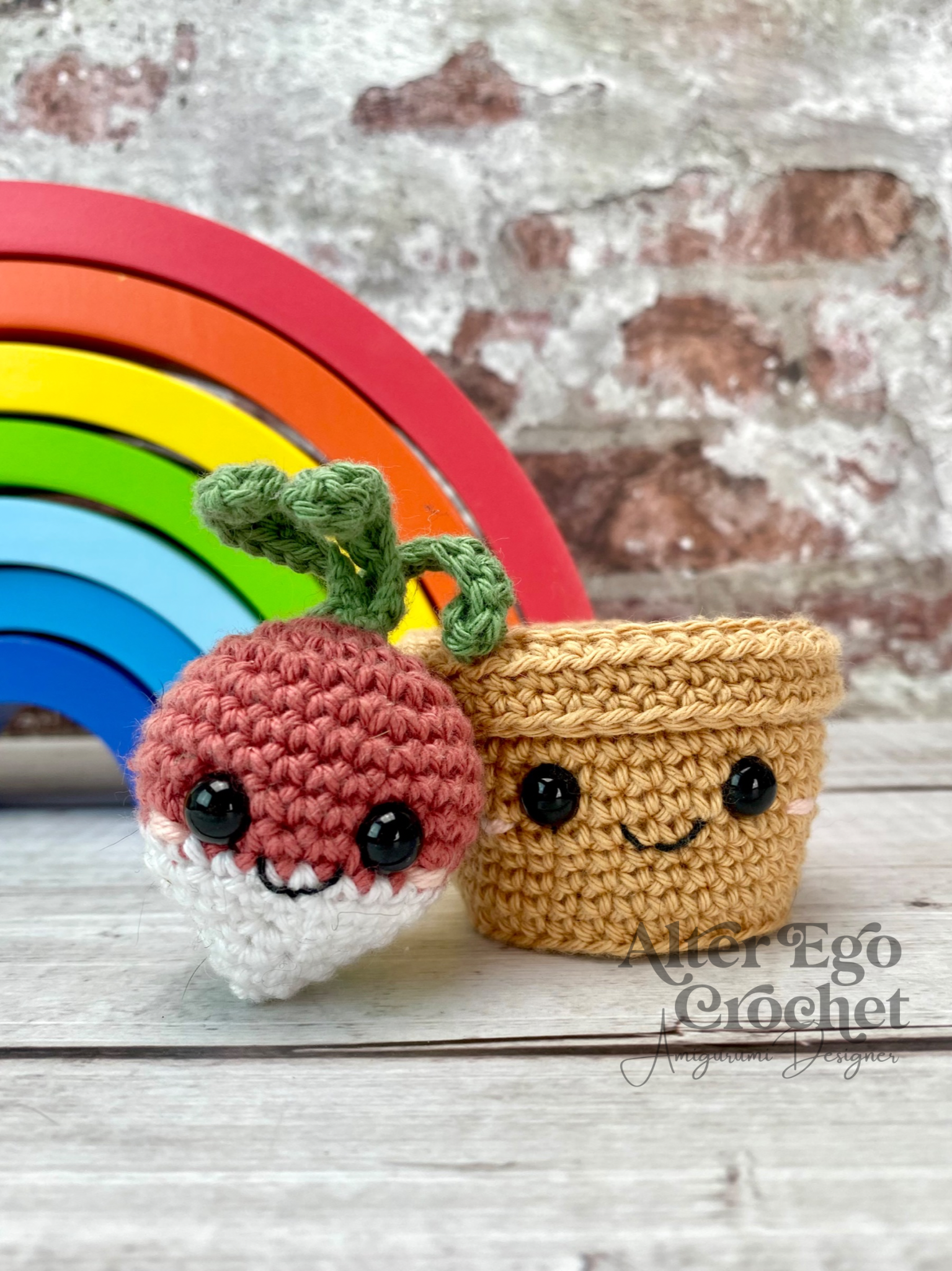 Radise i potte bliver 8 cm (radise 6 cm og potte 4 cm) hvis du bruger samme garn og hæklenål som mig. Du kan sagtens bruge en anden nål og andet garn, hvis han skal være større eller mindre.