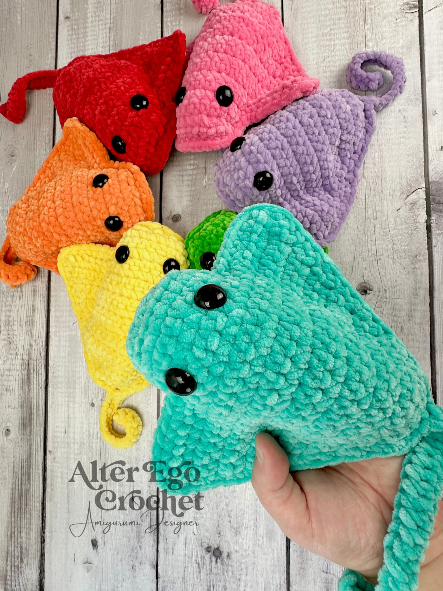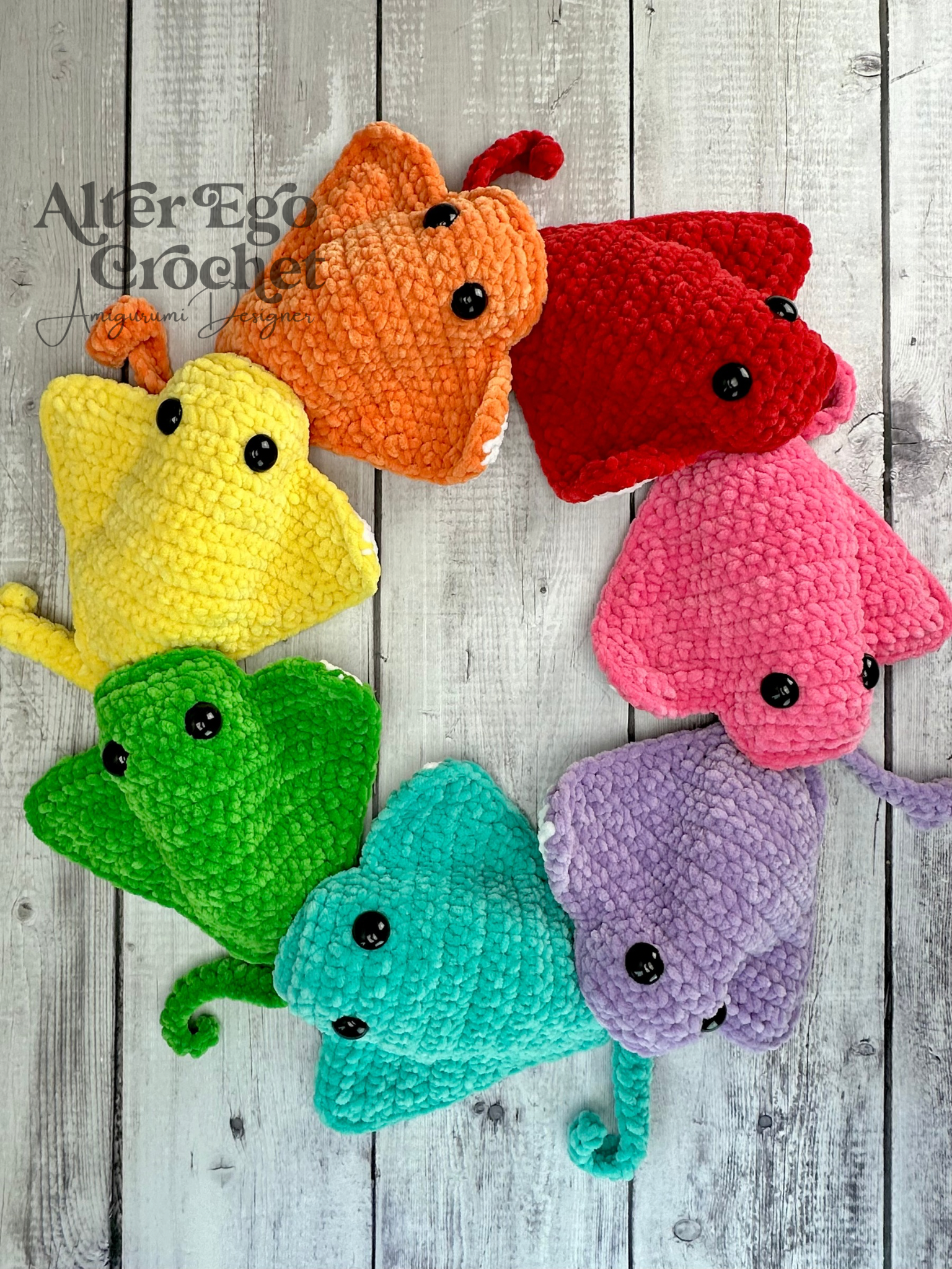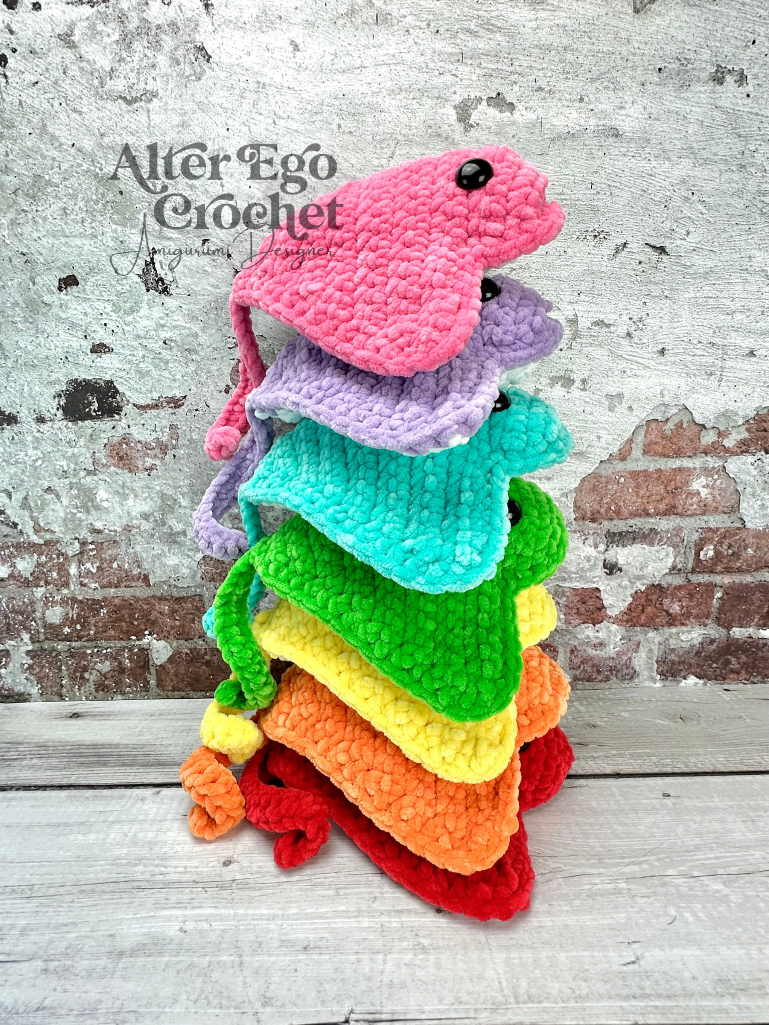 Raymond bliver 34 cm (19 cm uden hale), hvis du bruger samme garn og hæklenål som mig. Du kan sagtens bruge en anden nål og andet garn, hvis han skal være større eller mindre.