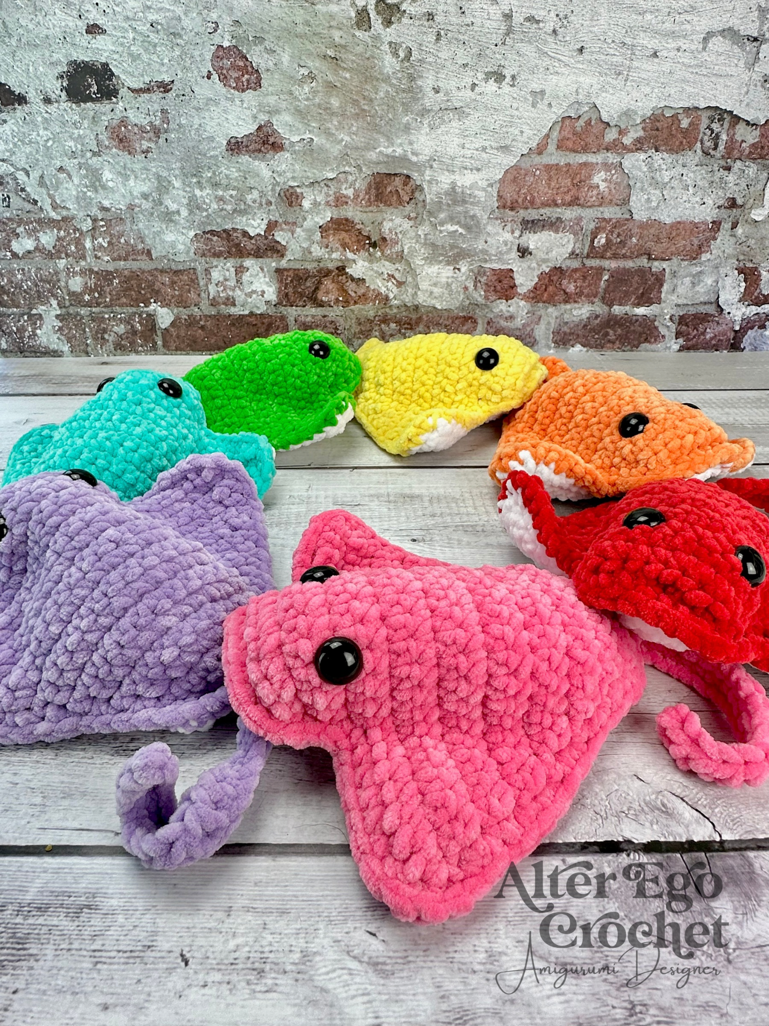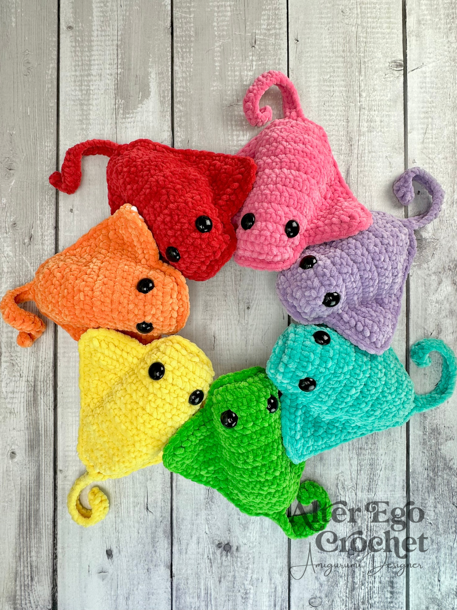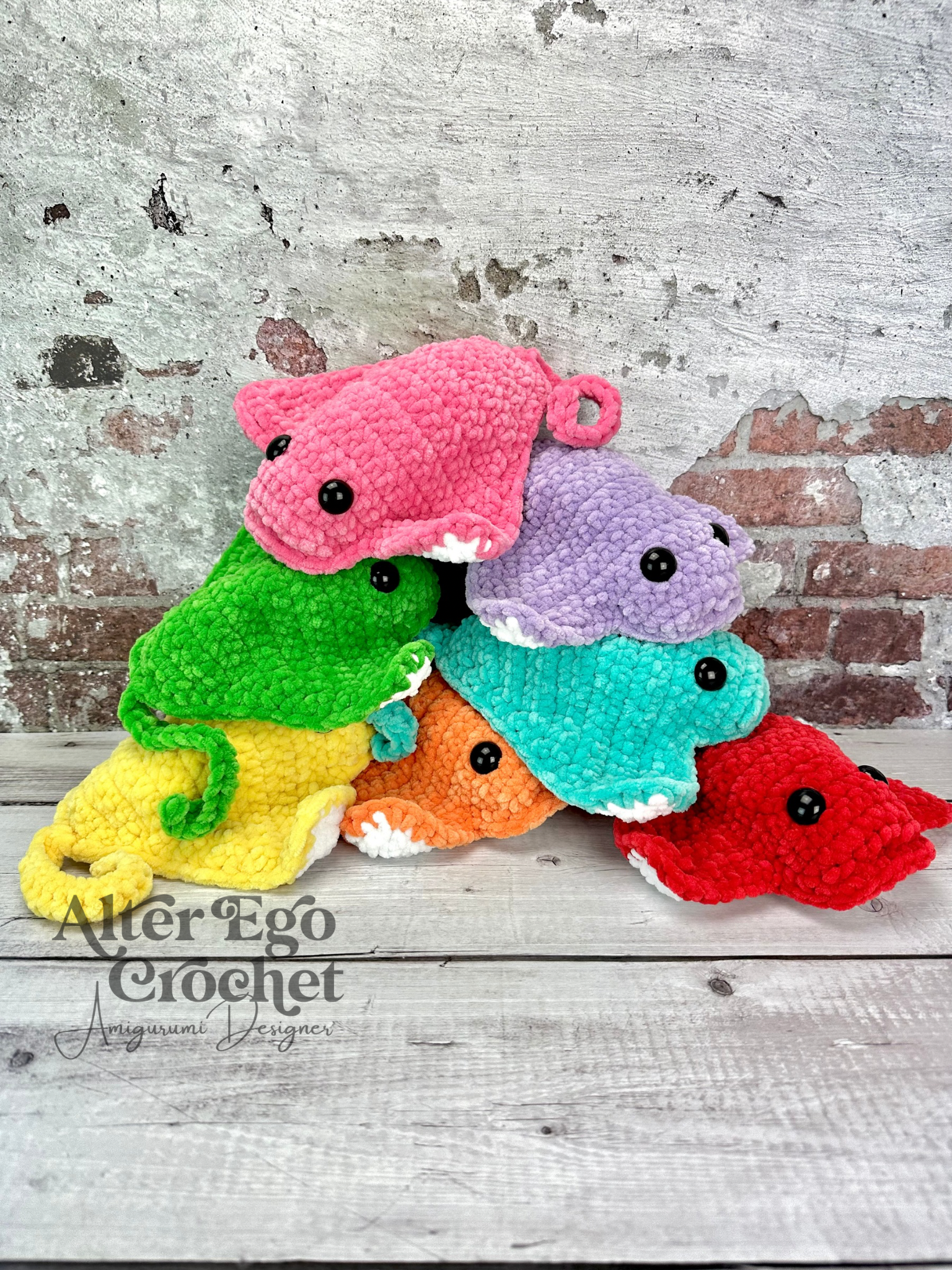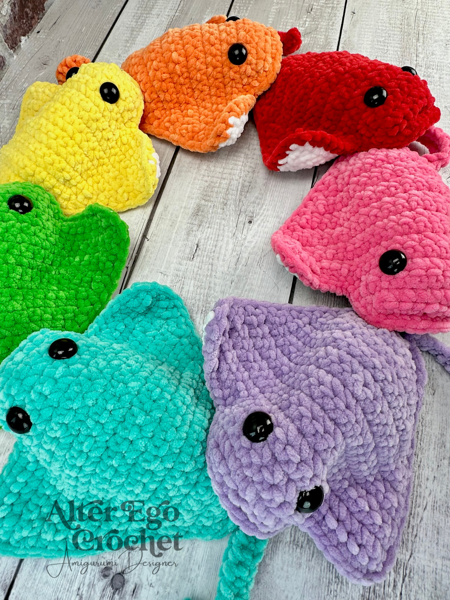 Raymond bliver 34 cm (19 cm uden hale), hvis du bruger samme garn og hæklenål som mig. Du kan sagtens bruge en anden nål og andet garn, hvis han skal være større eller mindre.