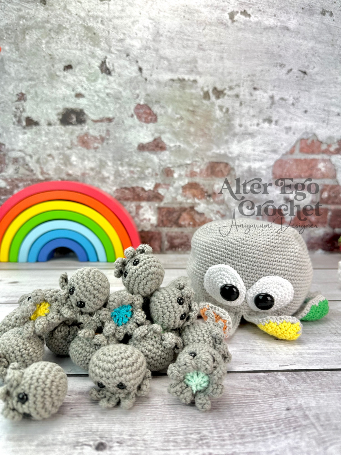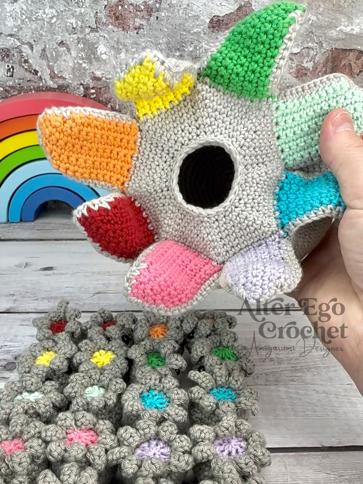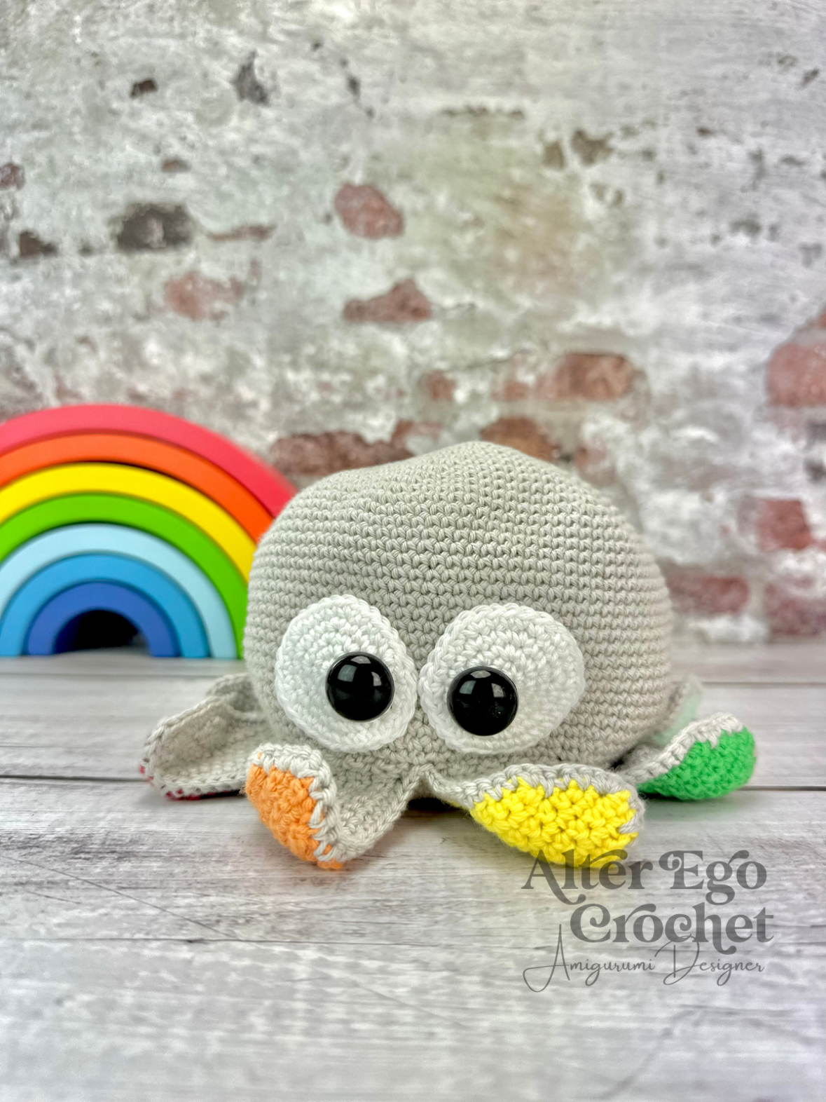 Den er lavet næsten uden syning (det er kun øjnene på den store sprutte, der skal sys på, men dette kan undgås ved at bruge større sikkerhedsøjne i stedet).