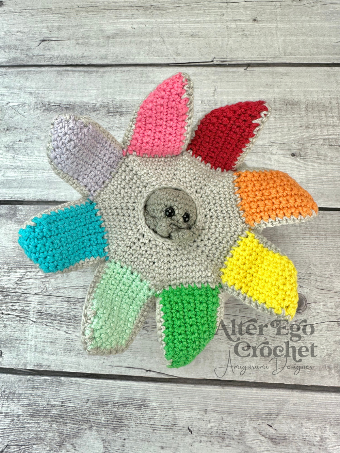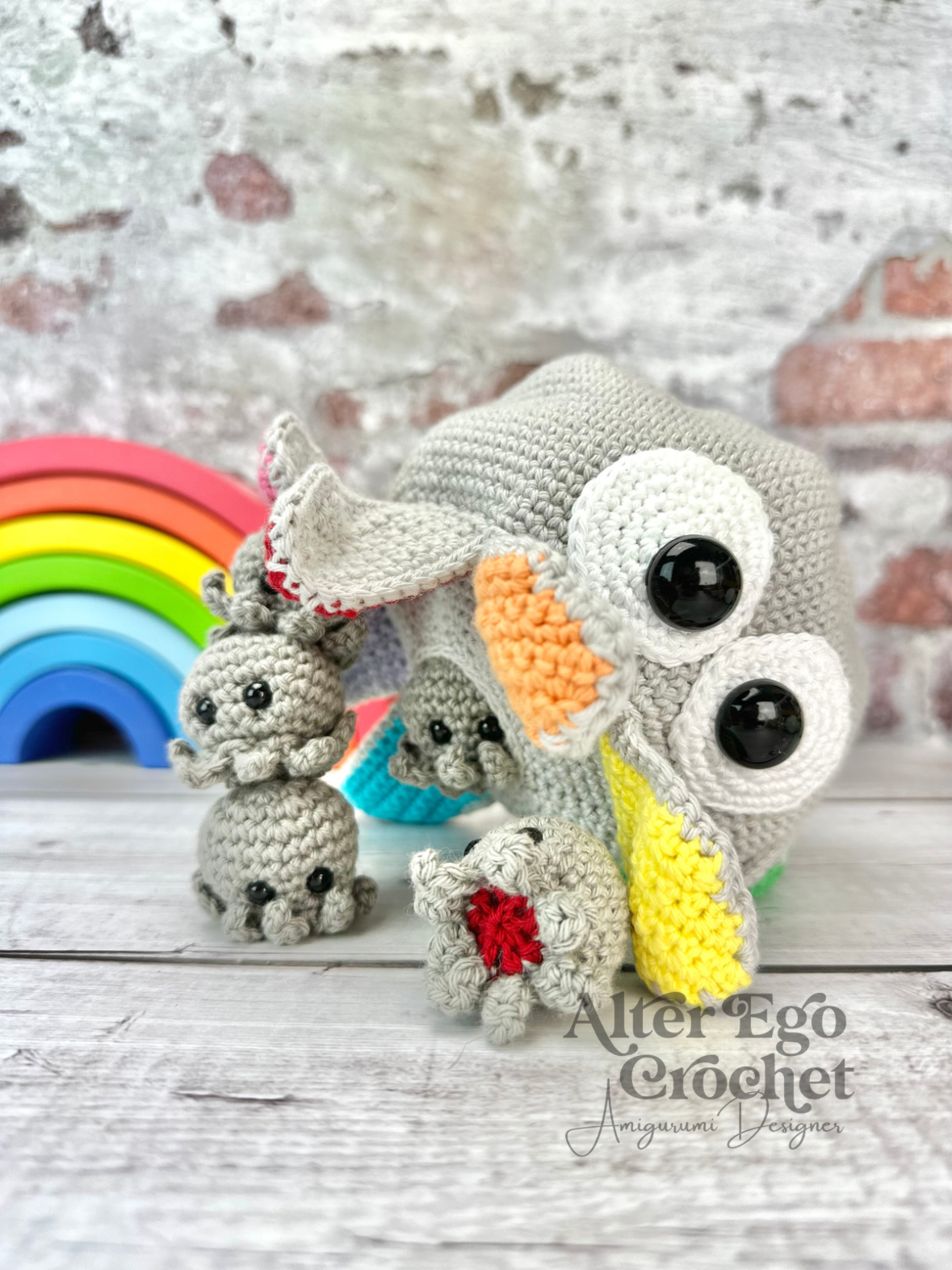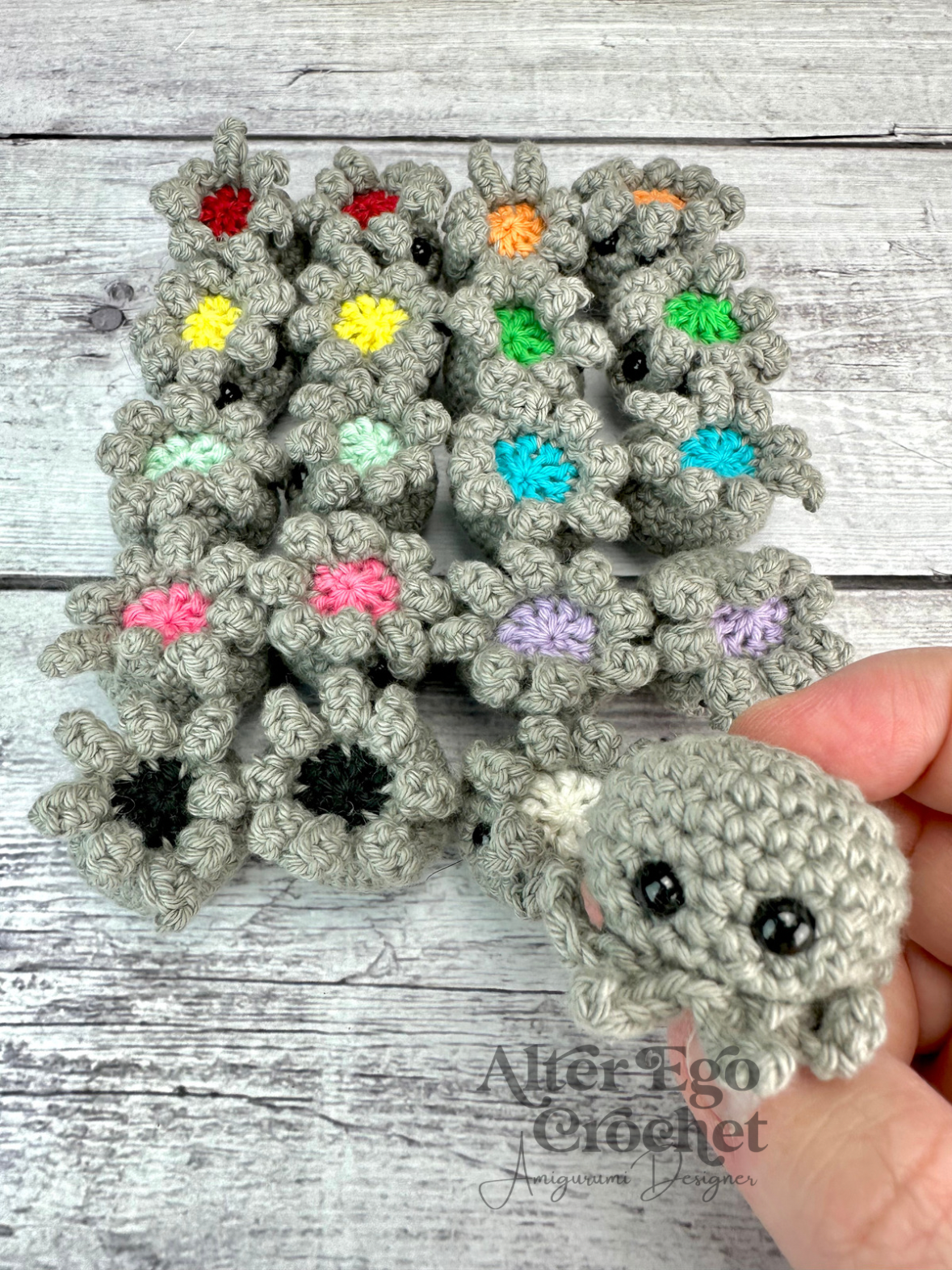 Den er lavet næsten uden syning (det er kun øjnene på den store sprutte, der skal sys på, men dette kan undgås ved at bruge større sikkerhedsøjne i stedet).