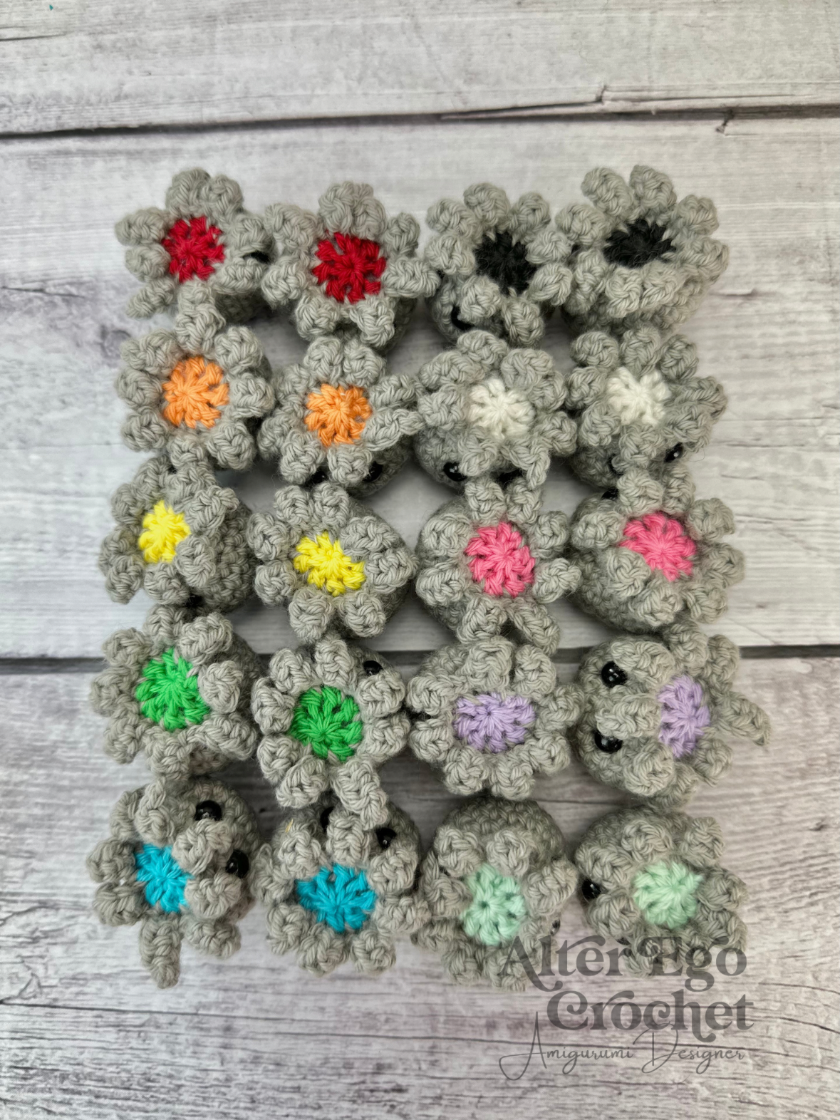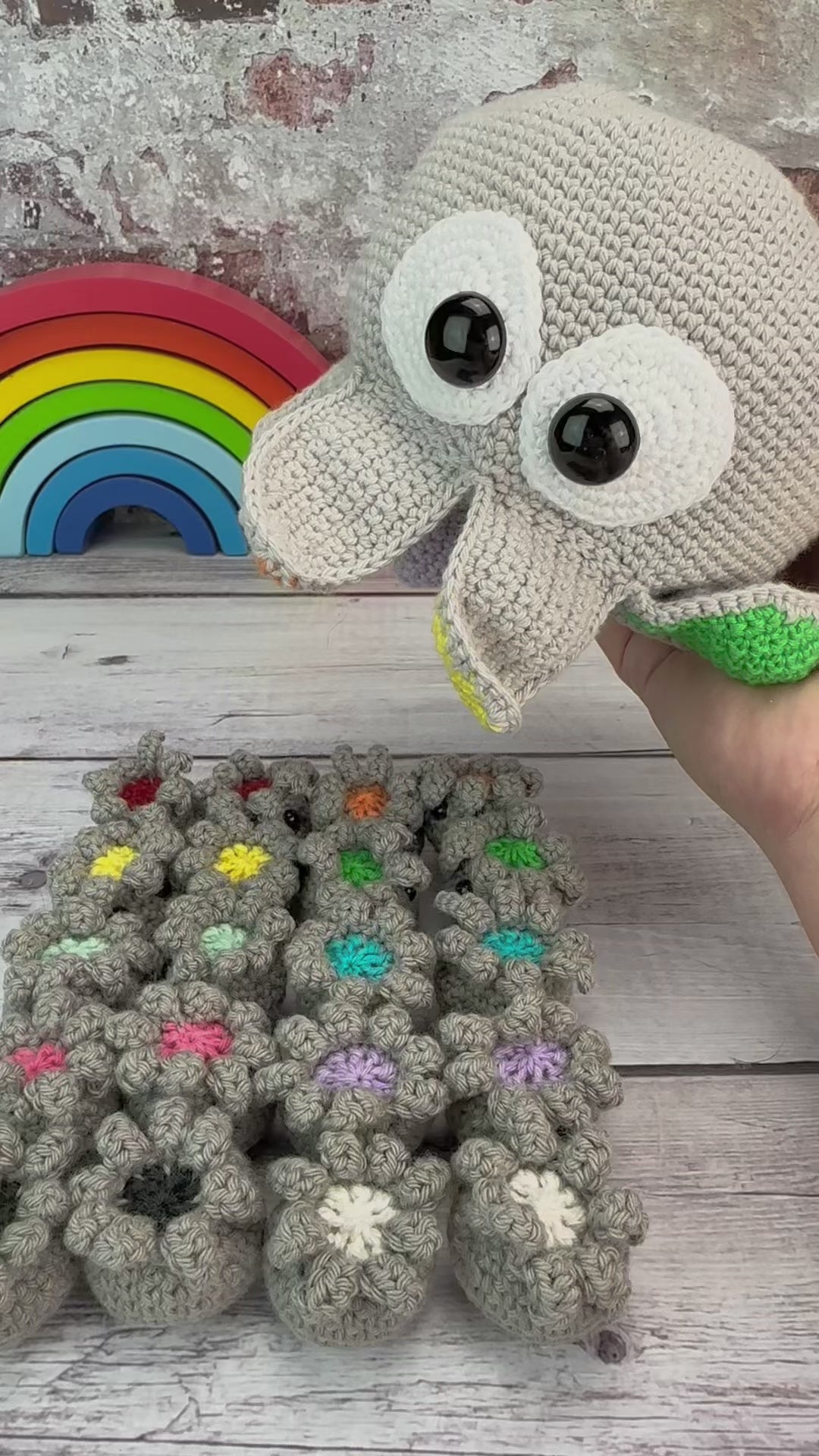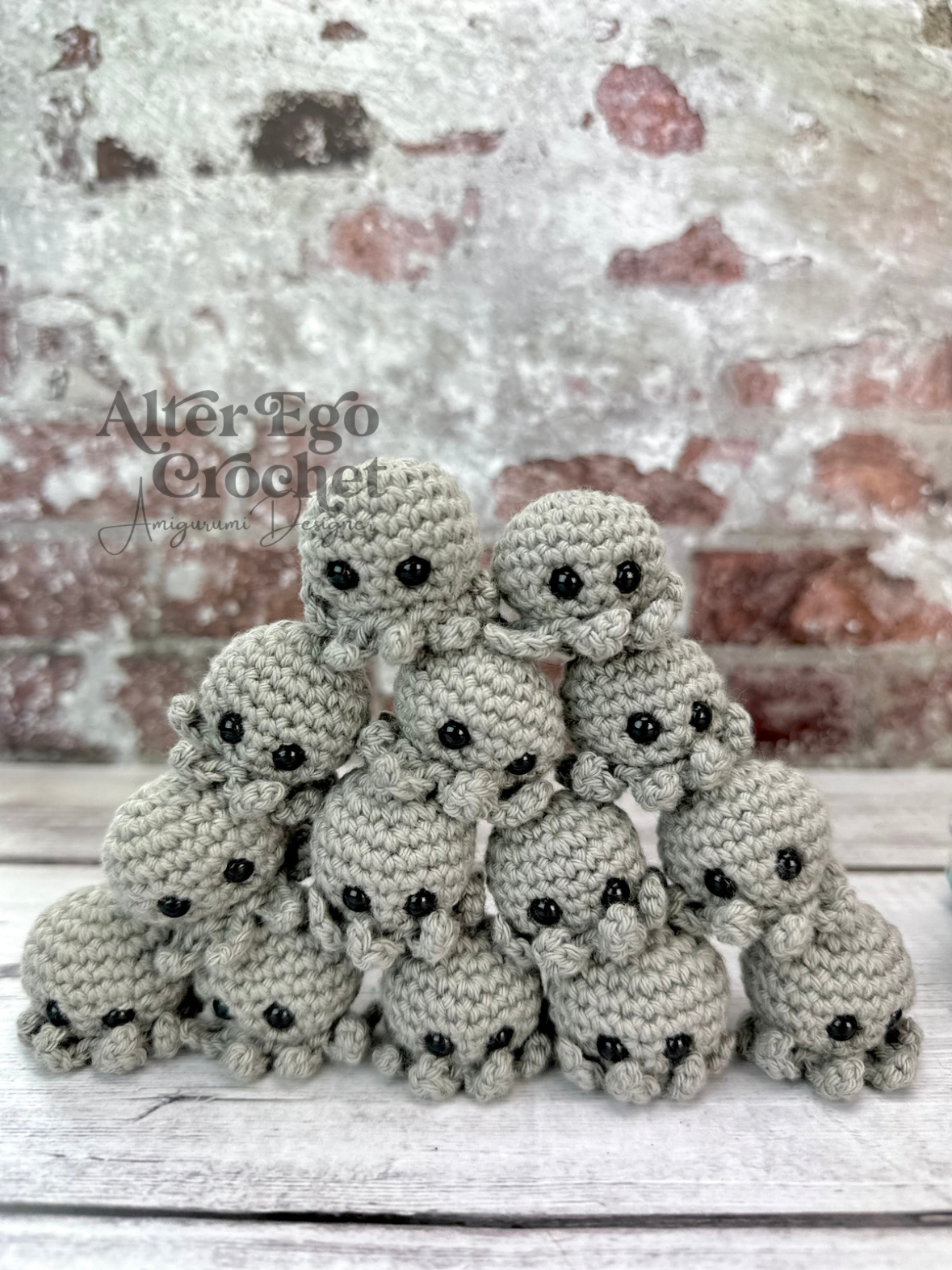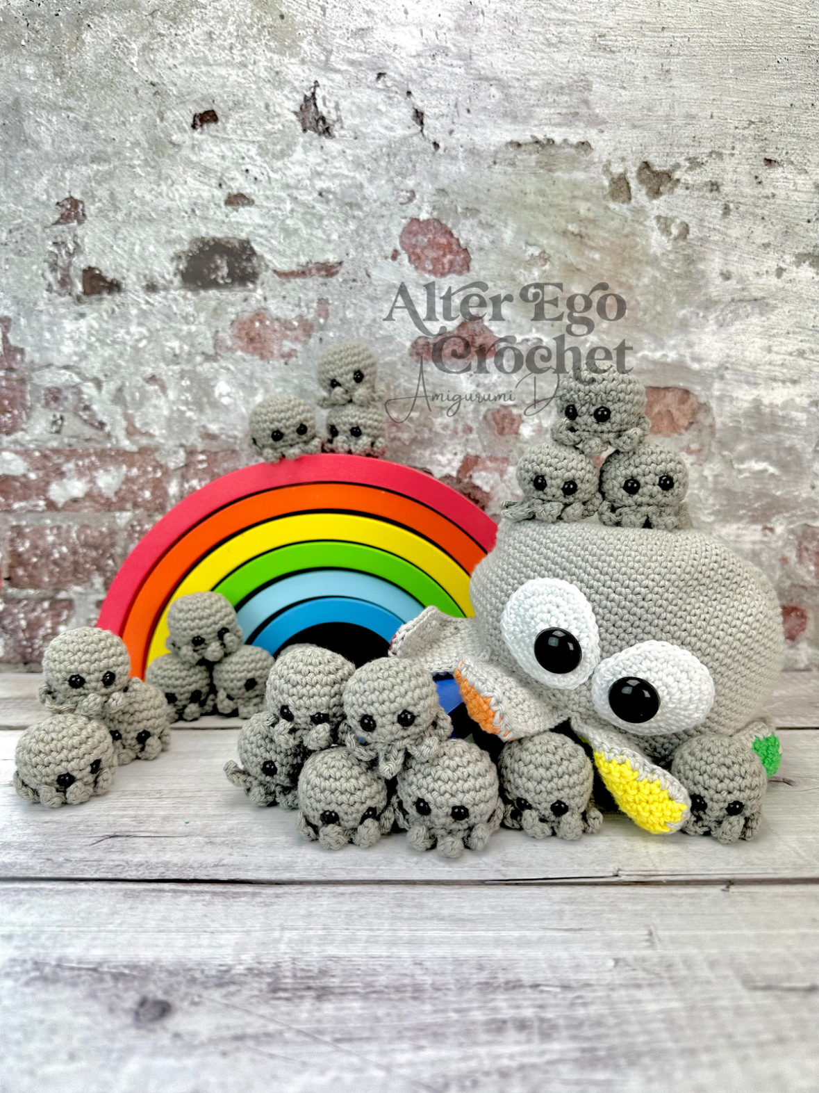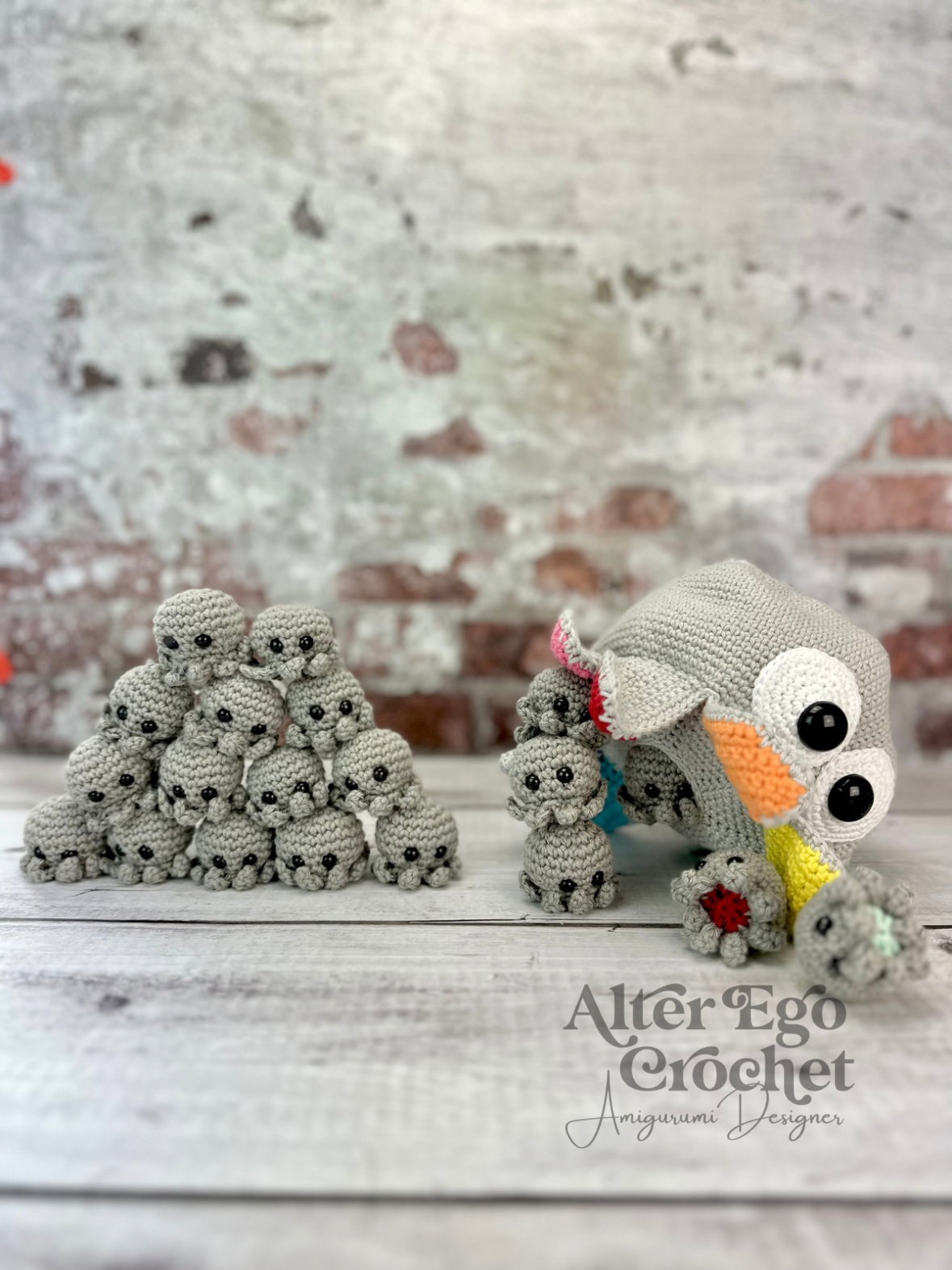 - Garn. Jeg har brugt 8/4 bomuld (80 g lysegrå til den store sprutte, 50 g mørkegrå til de små sprutter, 4 g hvid til øjnene, 3 g i 8 forskellige farver til armene og lidt i 10-13 forskellige farver til pletter på de små sprutter)