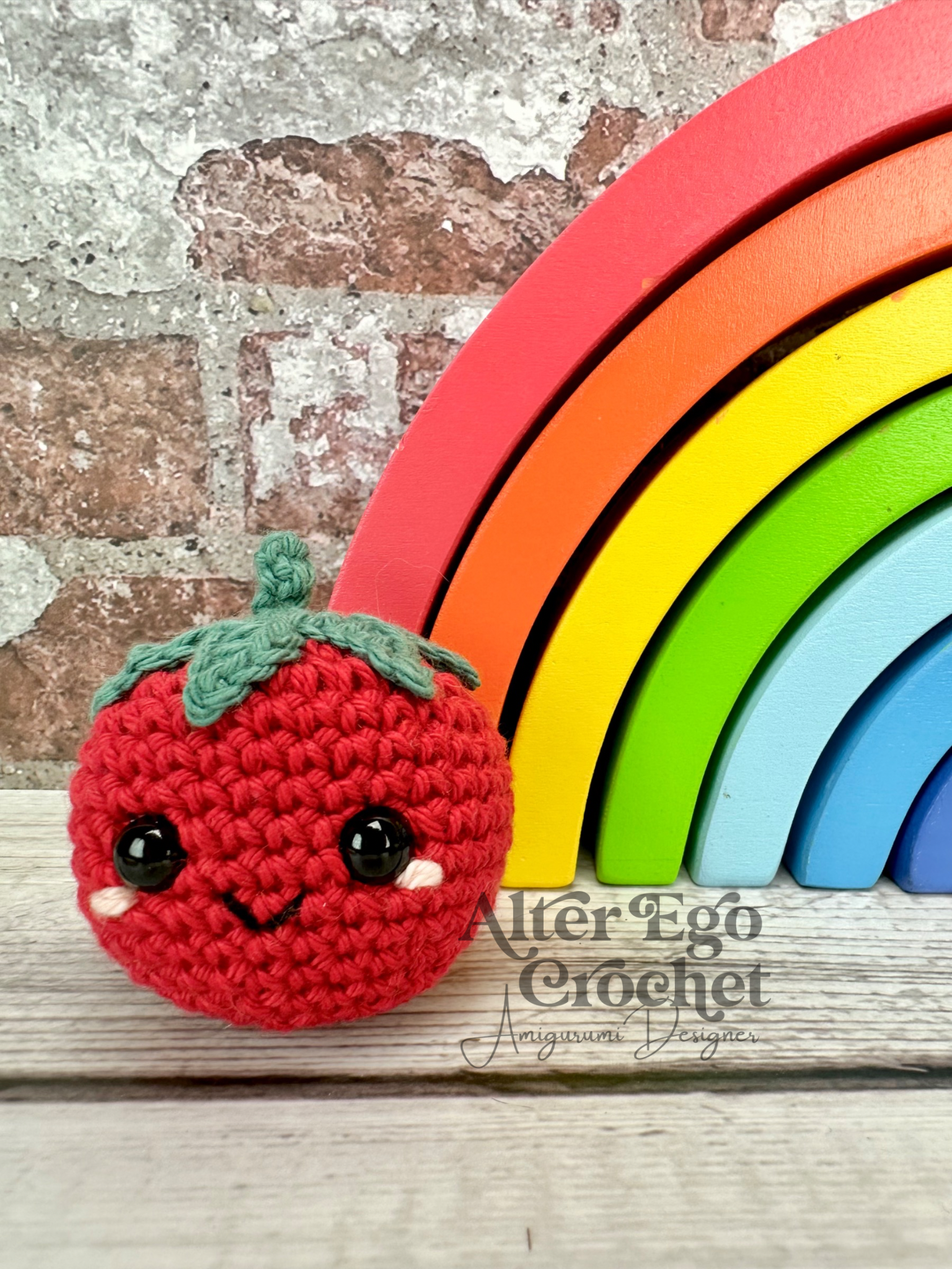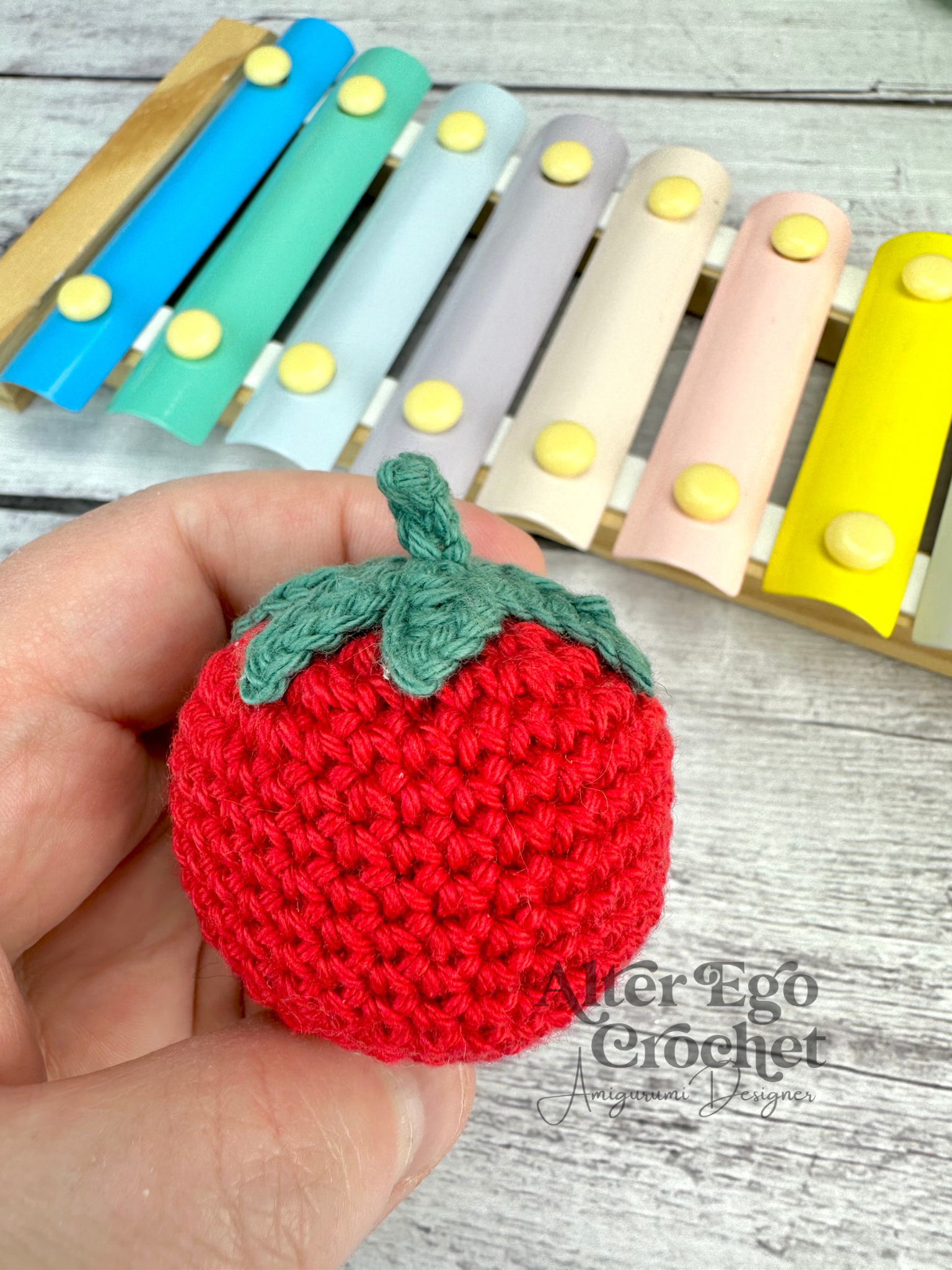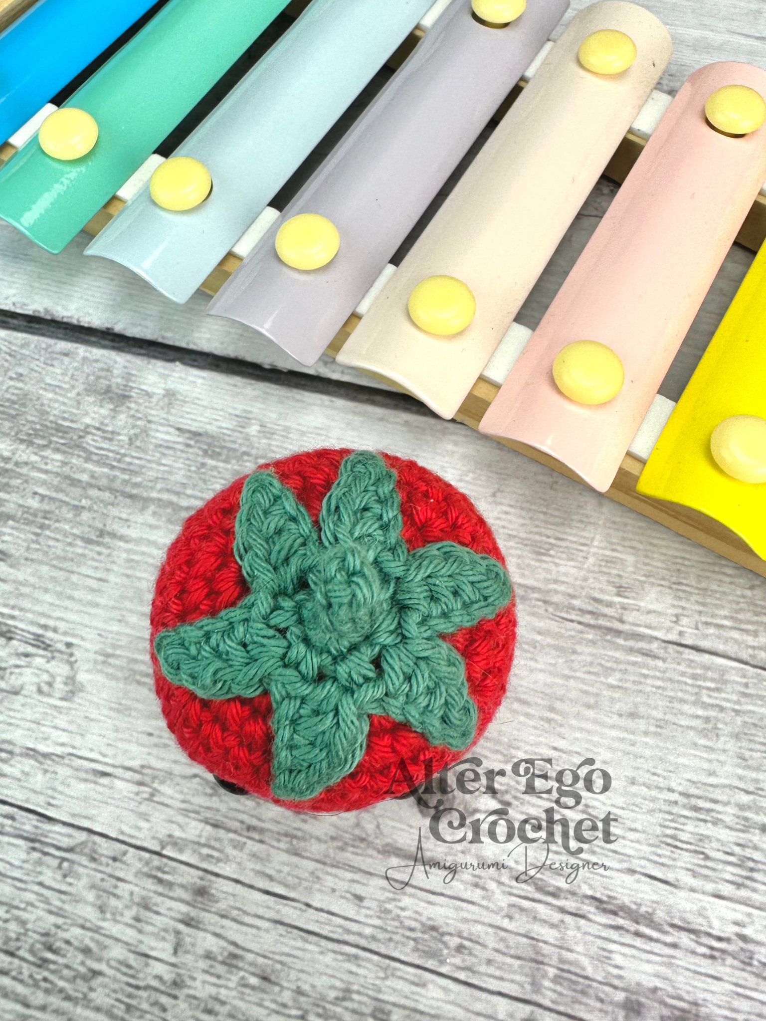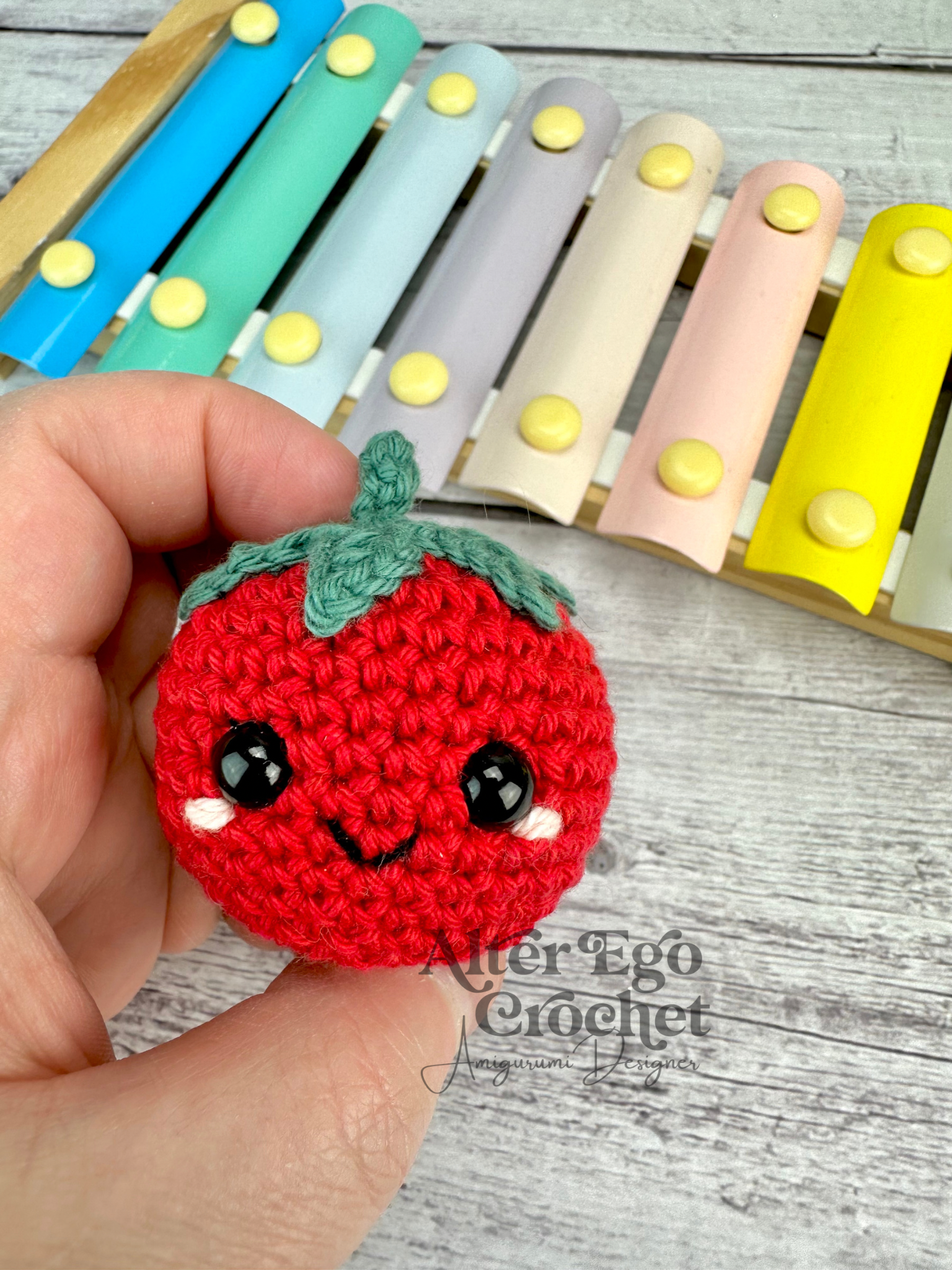 - Garn. Jeg har brugt 8/4 bomuld. Du skal bruge 5 g rød og 1 g grøn og lidt lyserød